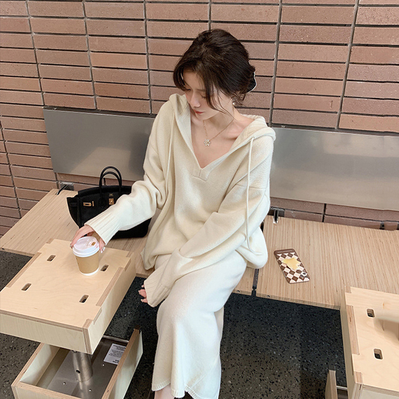 2025 가을 겨울 신상품, 젊어보이는 여유롭고 부드러운 스타일의 후드 니트 상의와 스커트 투피스 세트 여성용스토어 가기