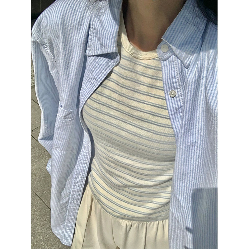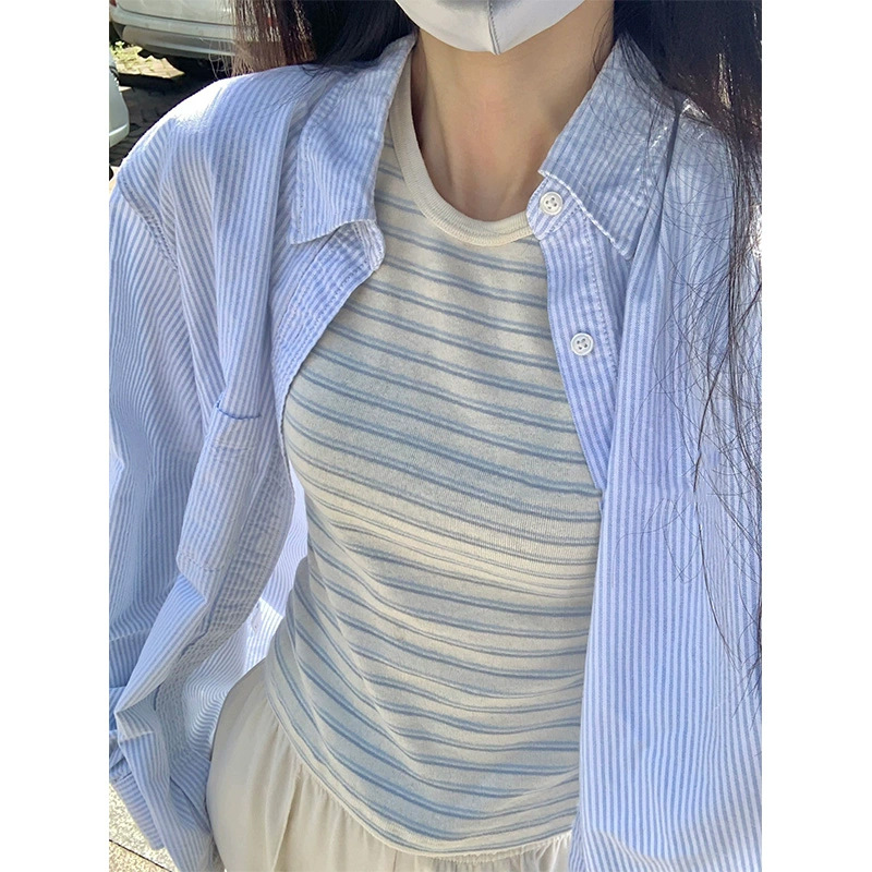 여성용 여름 코튼 블루 스트라이프 셔츠 홍콩 스타일 세련된 틈새 여성용 프랑스 탑 롱 슬리브 셔츠 태양 보호