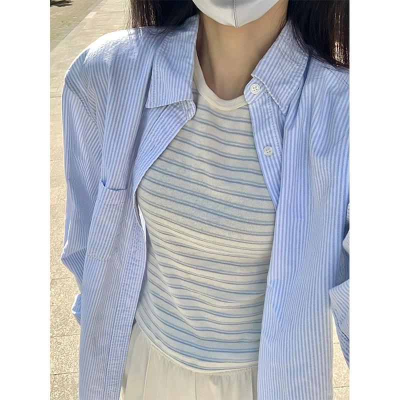 여성용 여름 코튼 블루 스트라이프 셔츠 홍콩 스타일 세련된 틈새 여성용 프랑스 탑 롱 슬리브 셔츠 태양 보호스토어 가기
