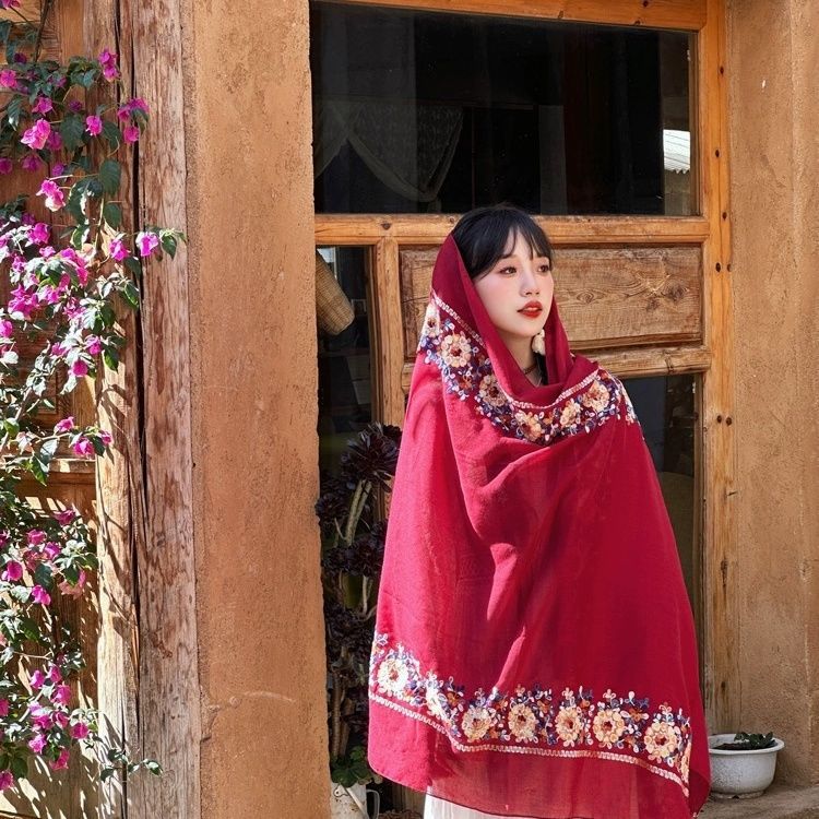 프레리 레드 에스닉 스타일 숄 스카프 여성용 여행복 및 사진 새로운 스타일 Yunnan Lijiang 자수 긴 스카프