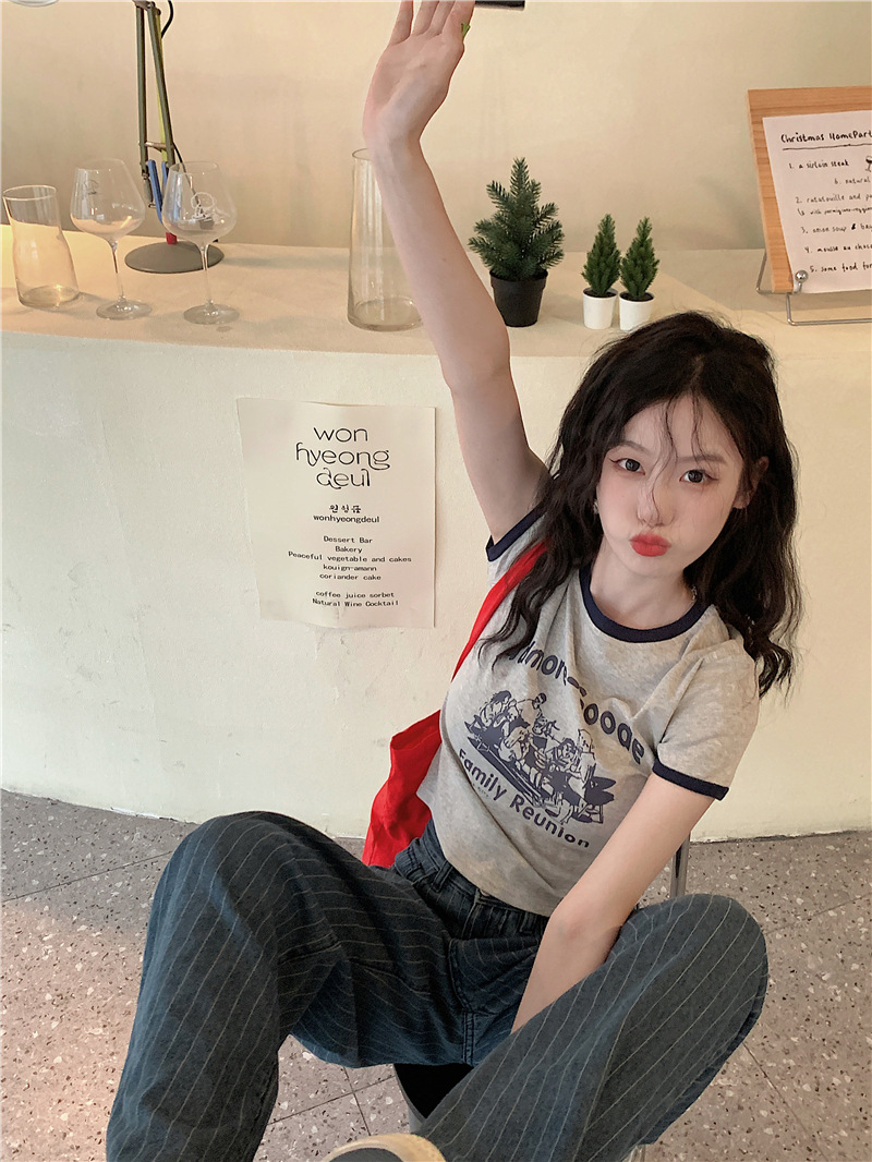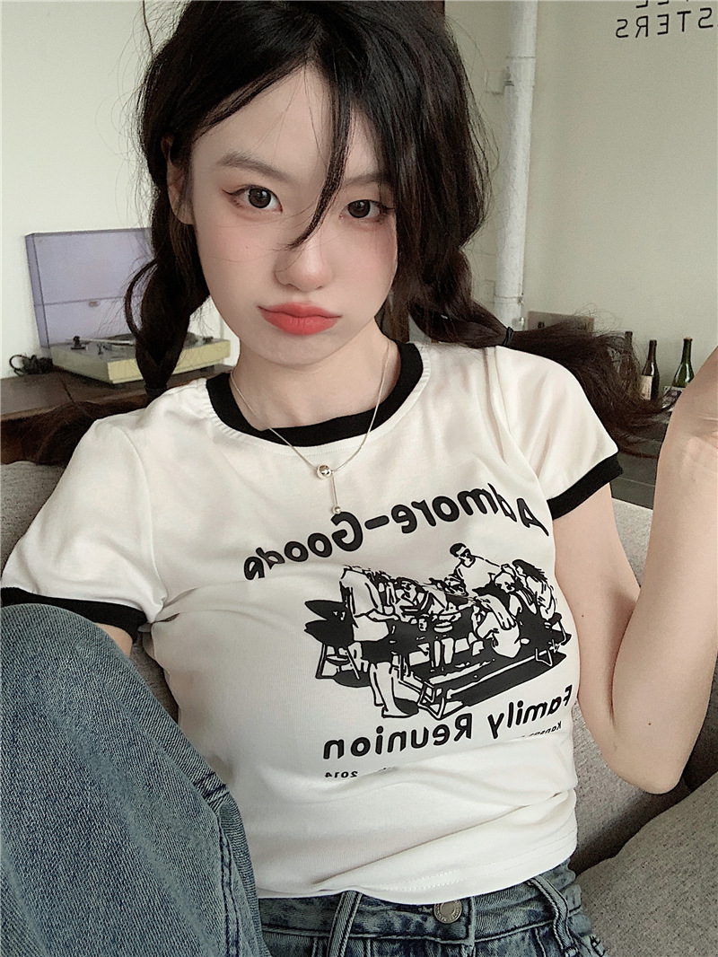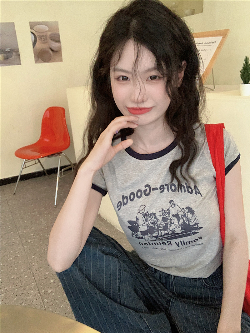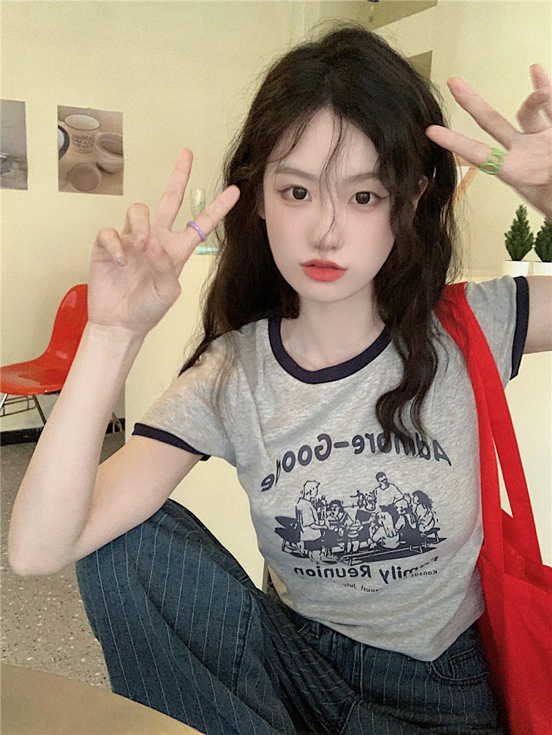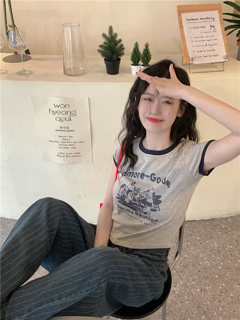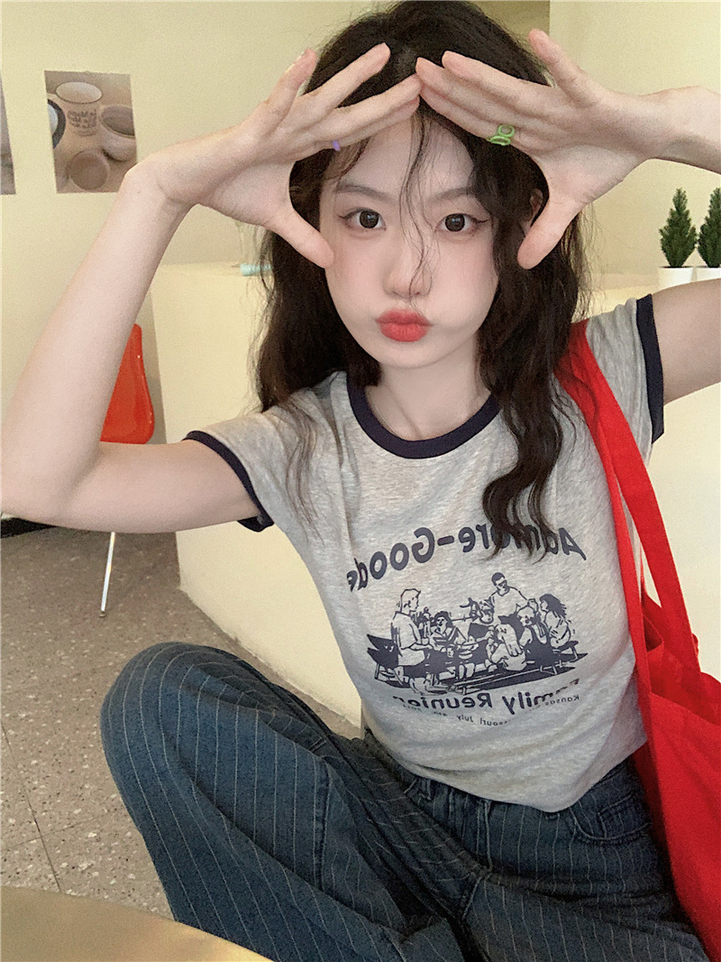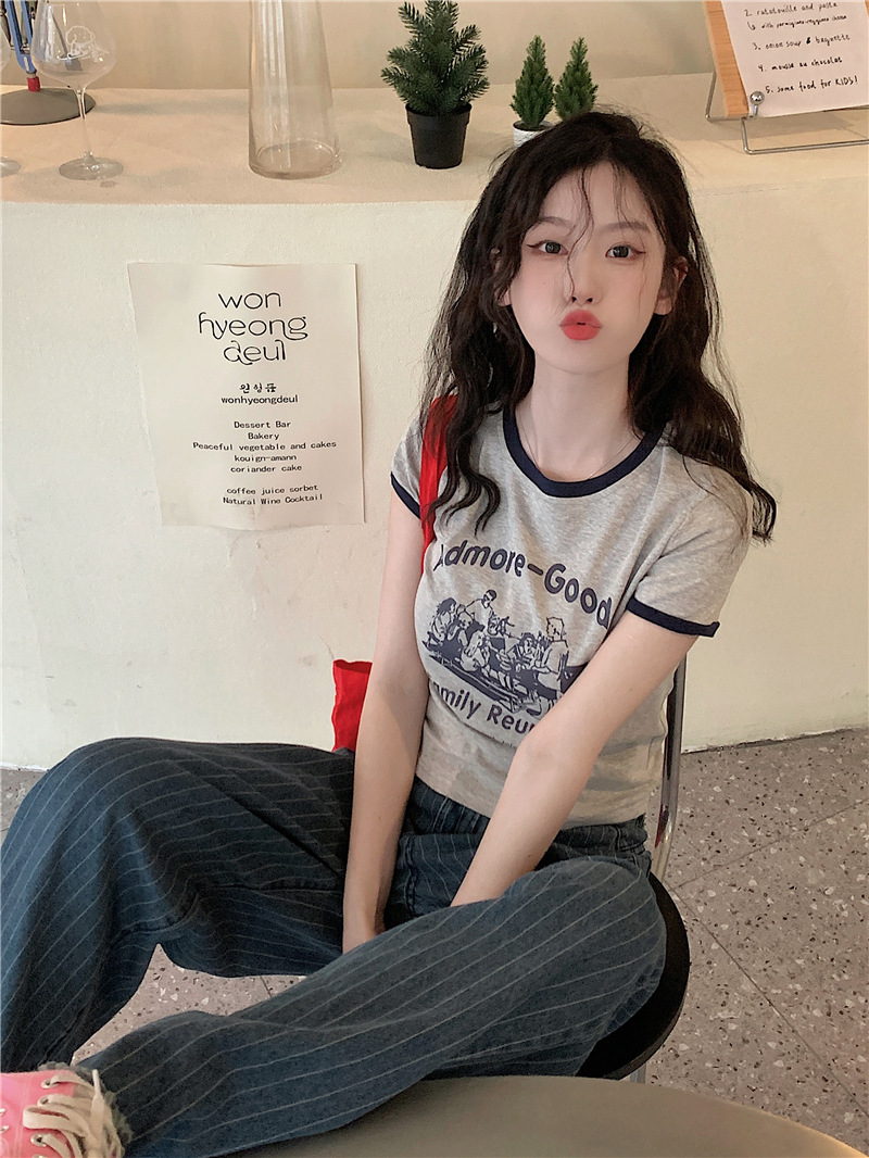 달콤하고 매운 스타일의 레터 프린트 티셔츠 여성용 2025 여름 슬림핏 숏 스타일 배색 라운드넥 반팔 학생용 상의