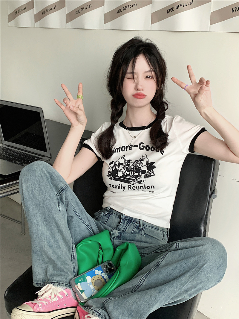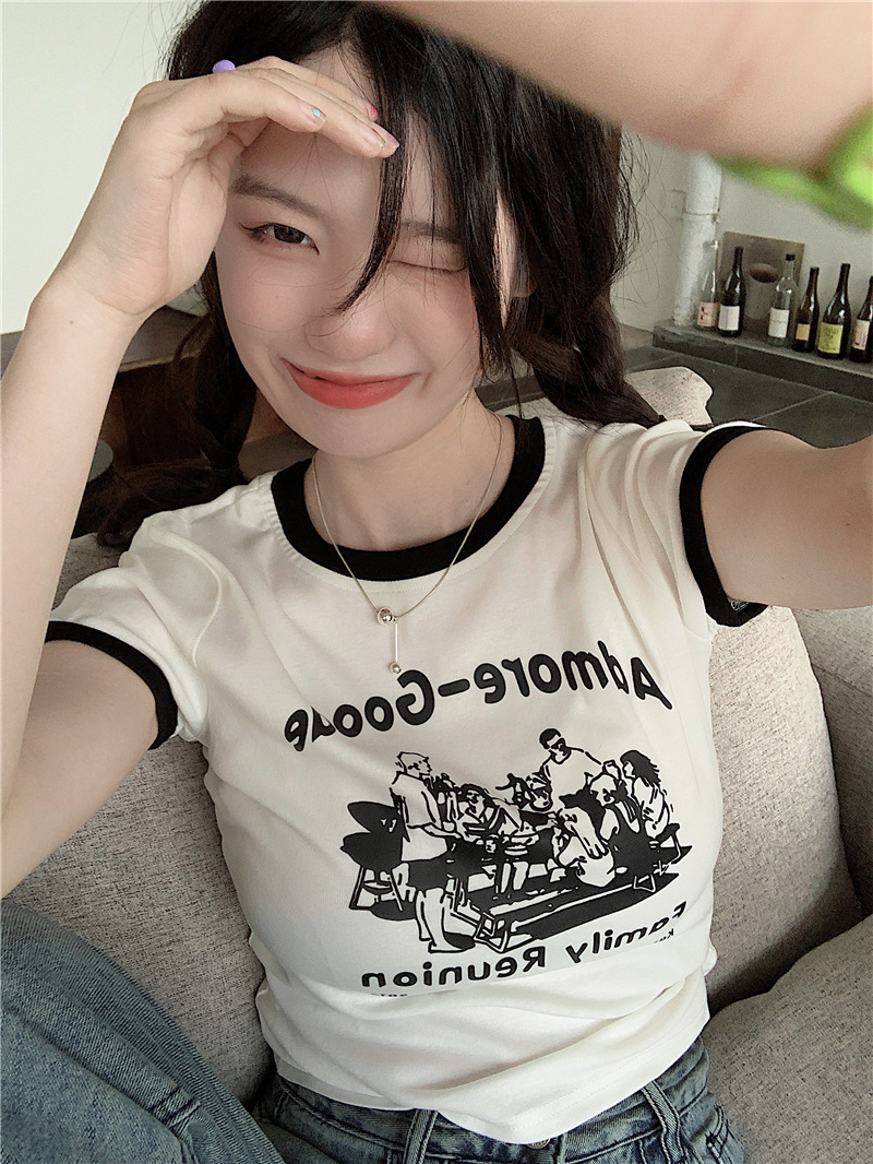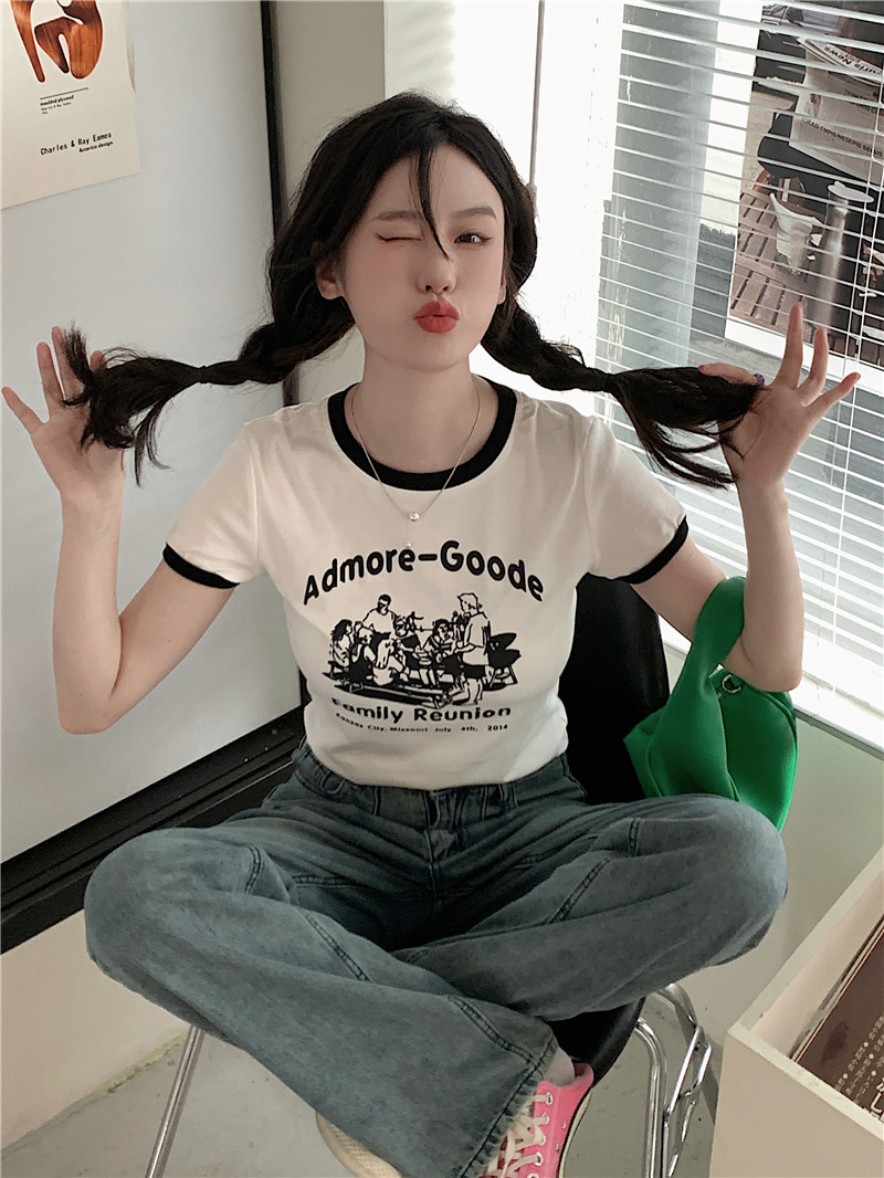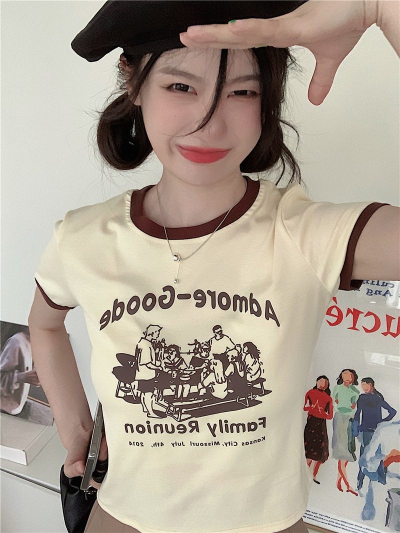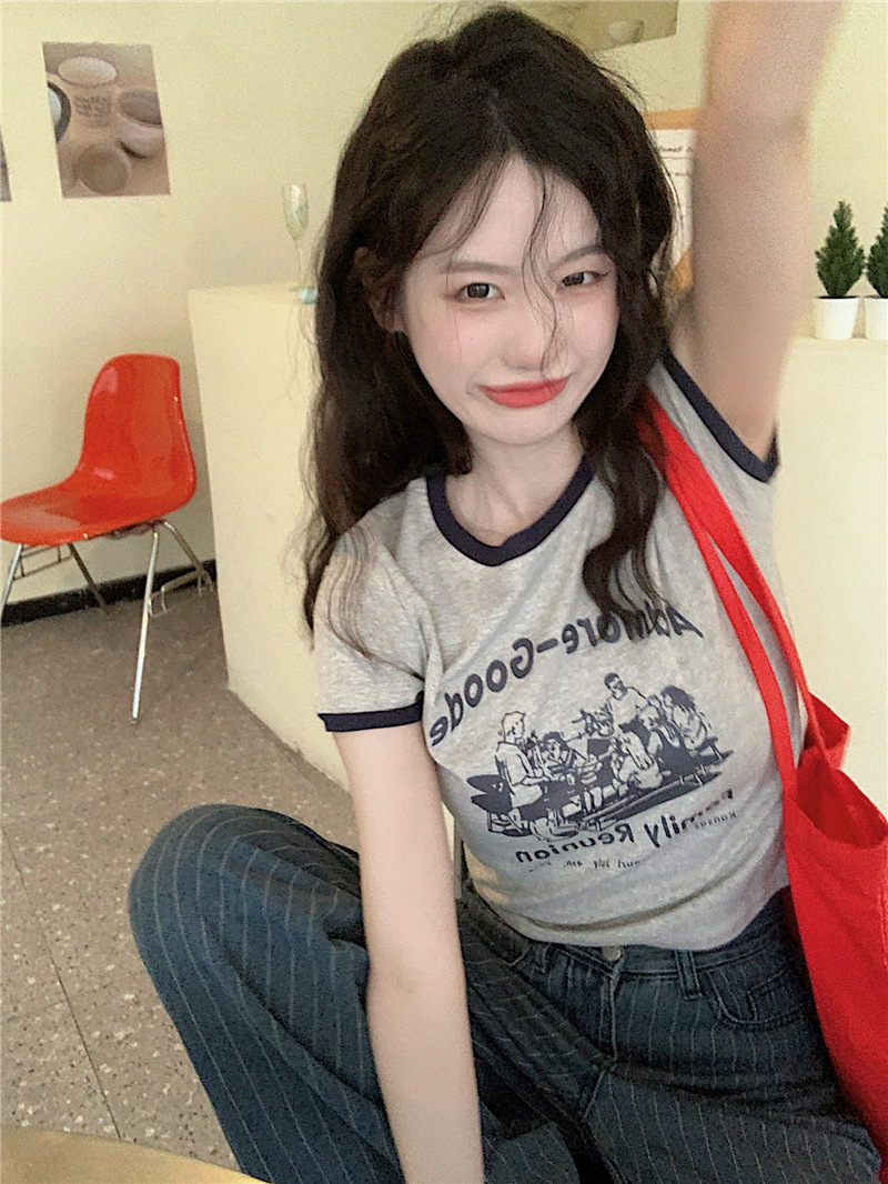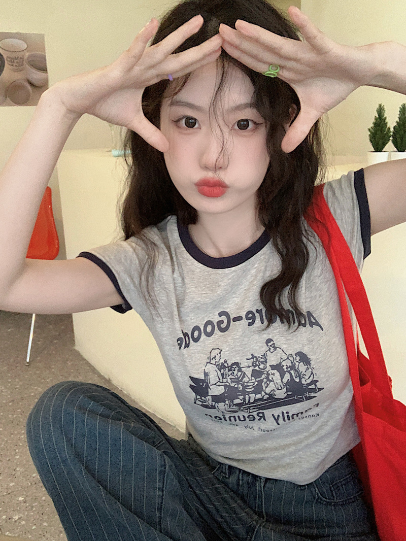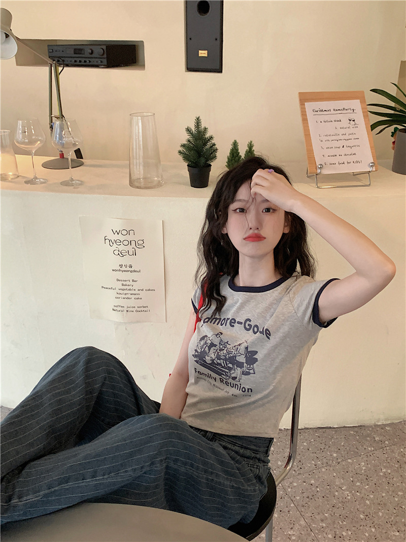 달콤하고 매운 스타일의 레터 프린트 티셔츠 여성용 2025 여름 슬림핏 숏 스타일 배색 라운드넥 반팔 학생용 상의