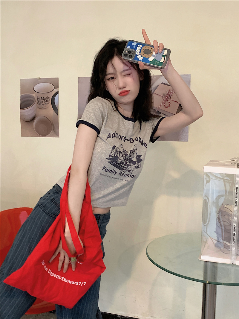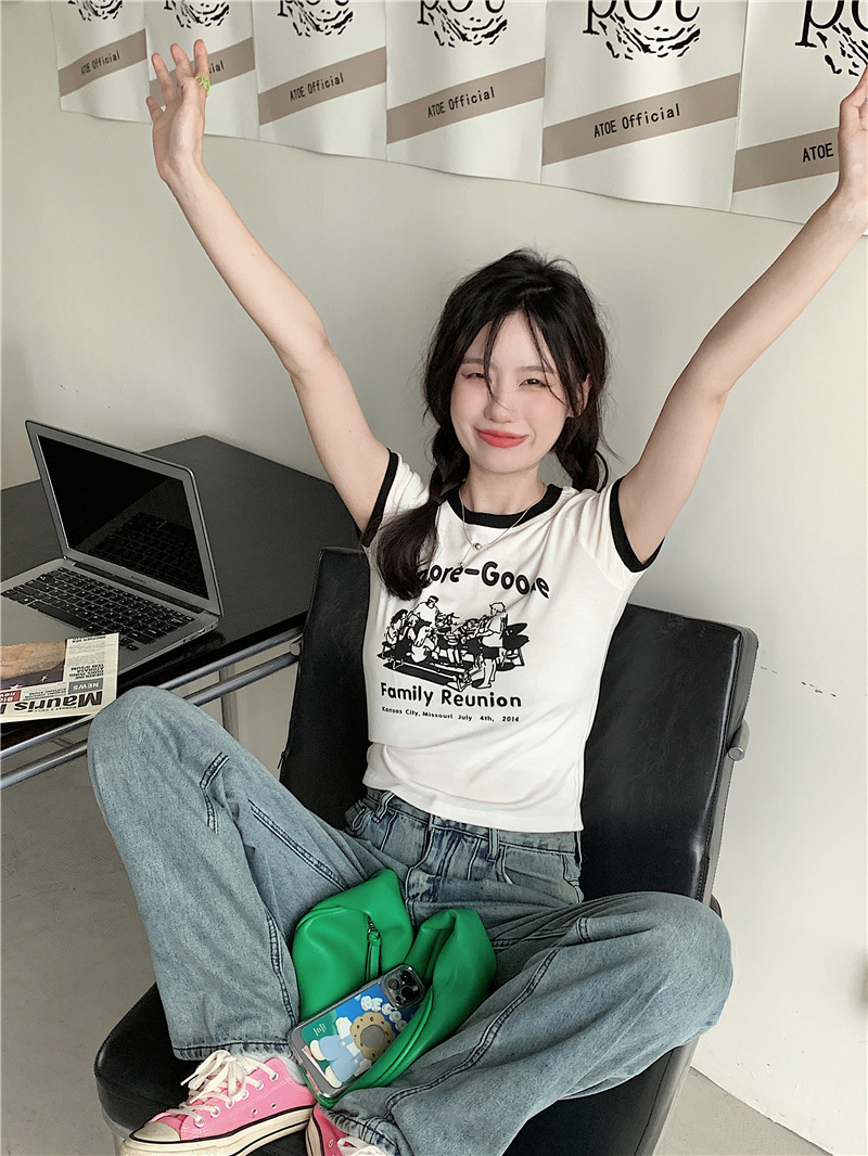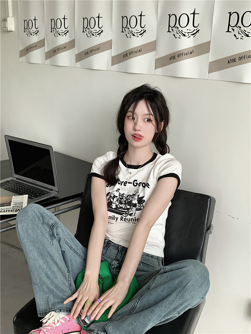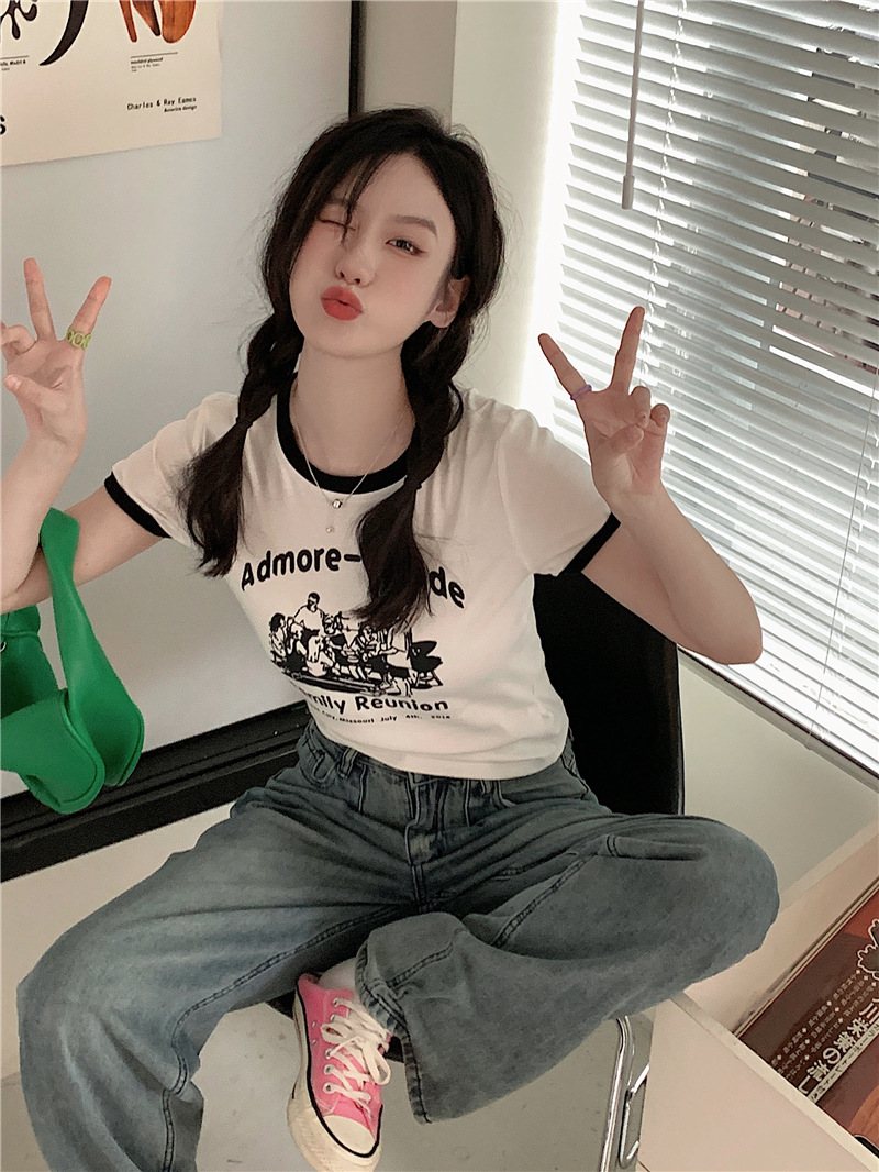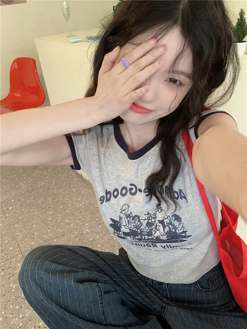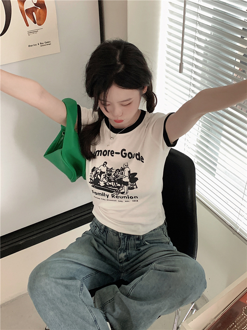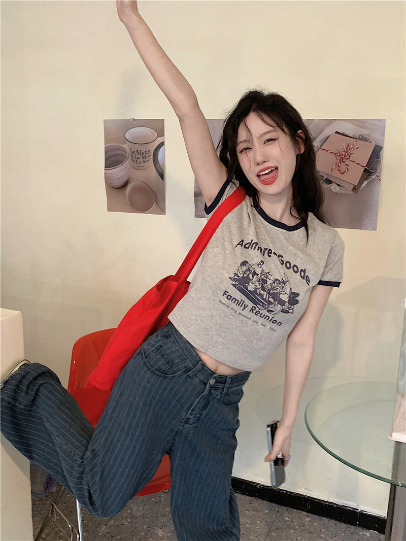 달콤하고 매운 스타일의 레터 프린트 티셔츠 여성용 2025 여름 슬림핏 숏 스타일 배색 라운드넥 반팔 학생용 상의