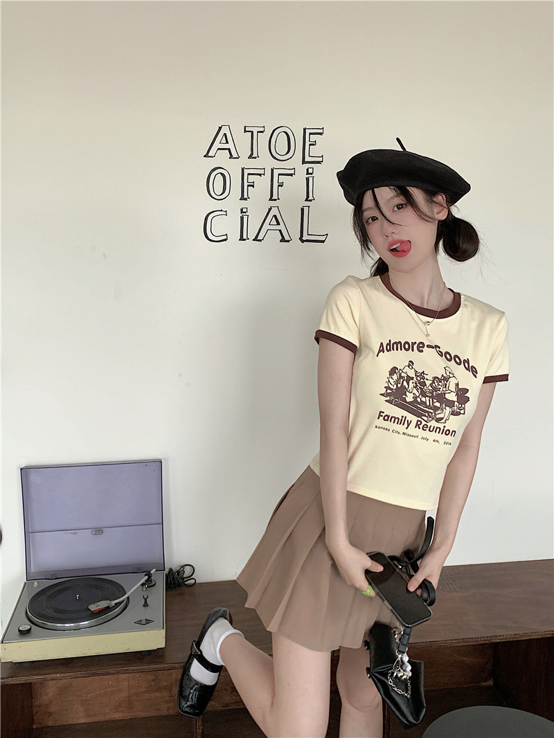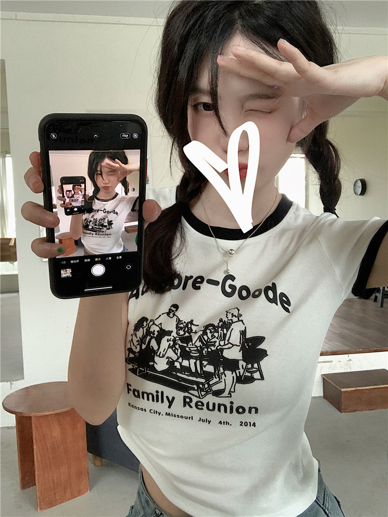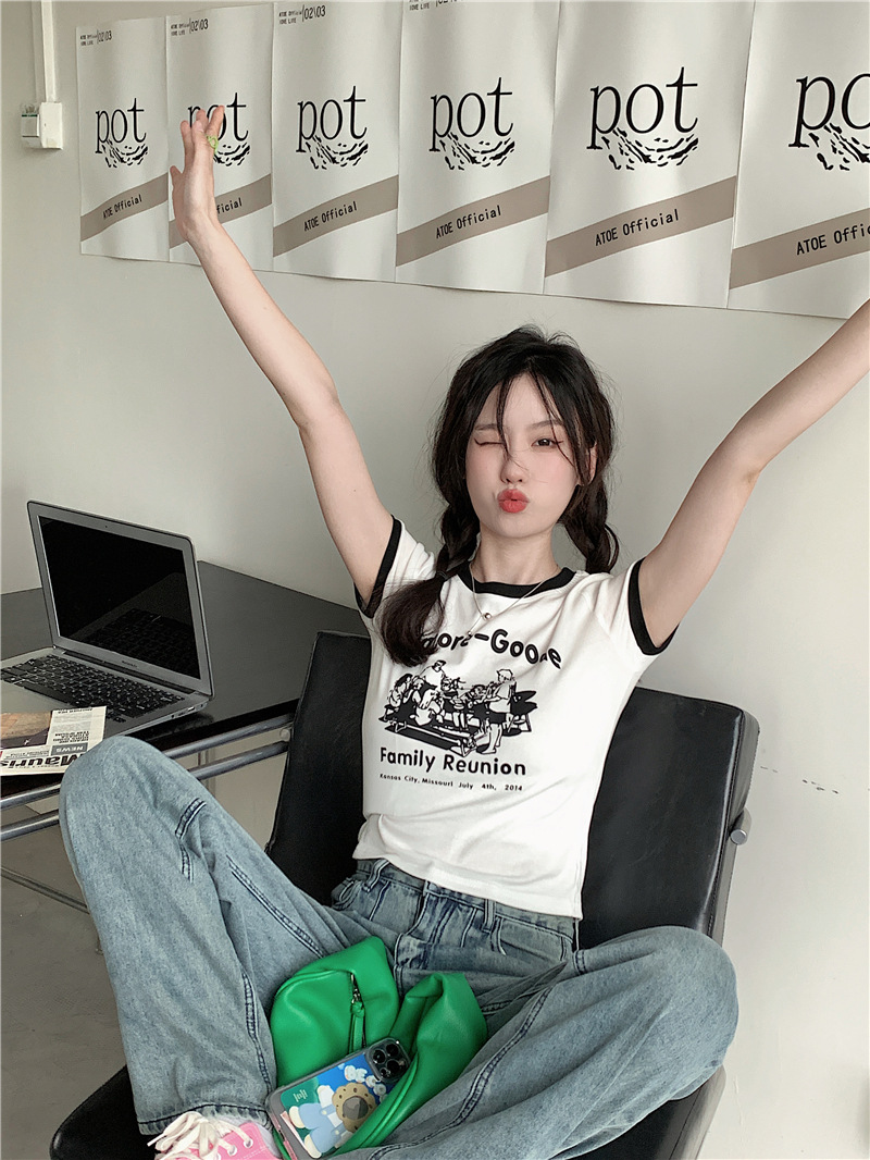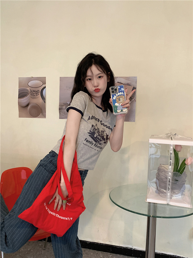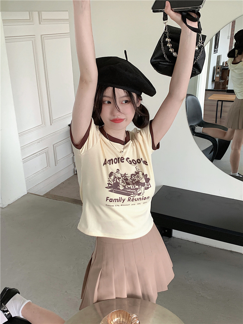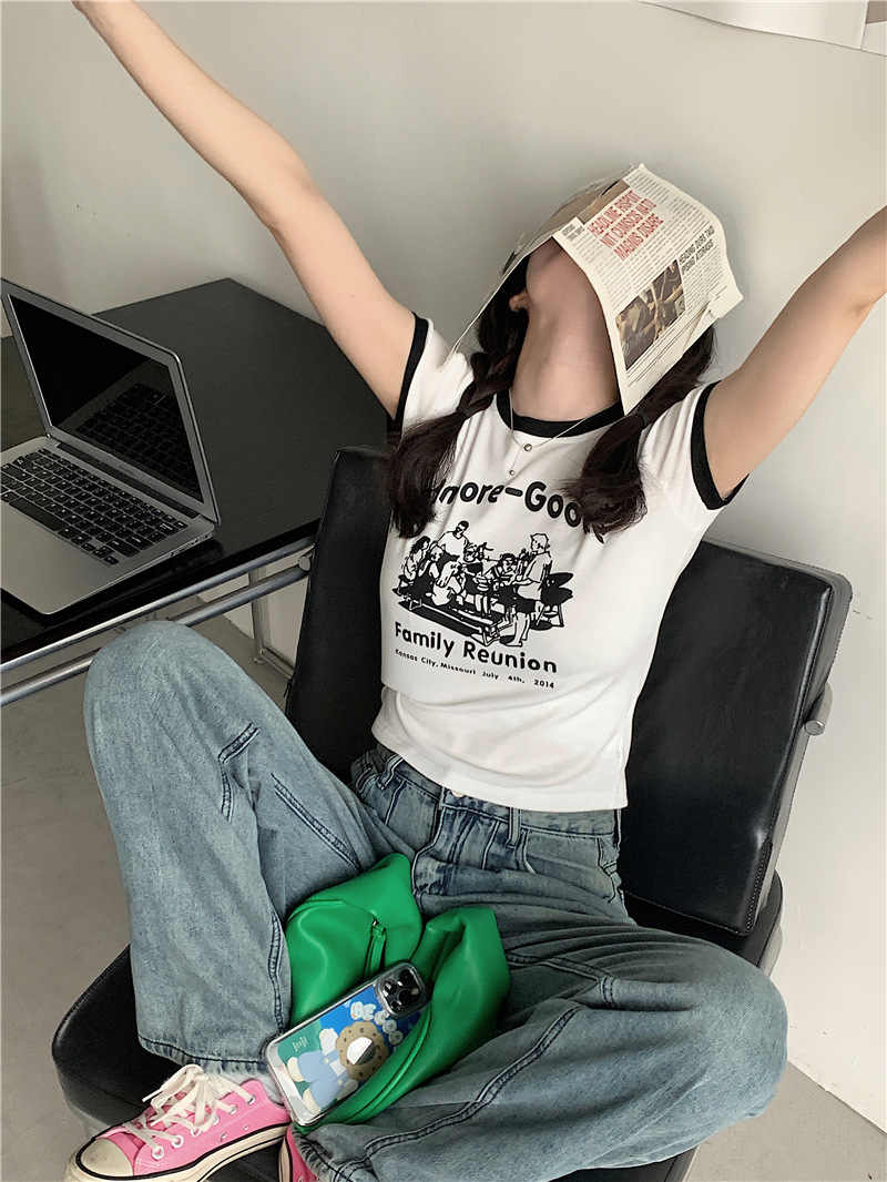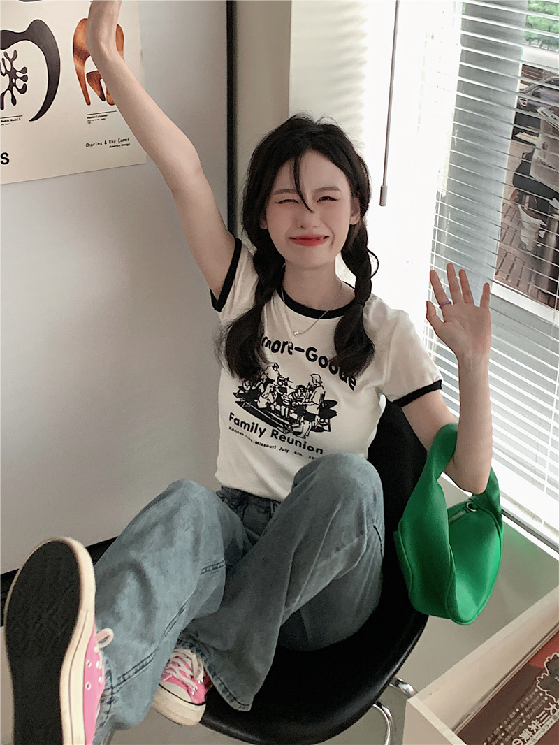 달콤하고 매운 스타일의 레터 프린트 티셔츠 여성용 2025 여름 슬림핏 숏 스타일 배색 라운드넥 반팔 학생용 상의