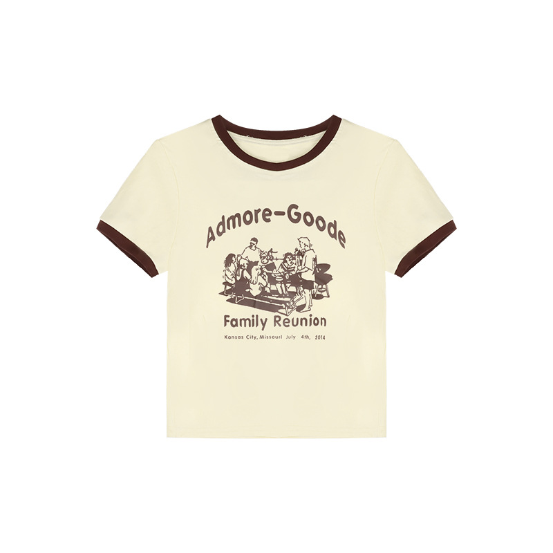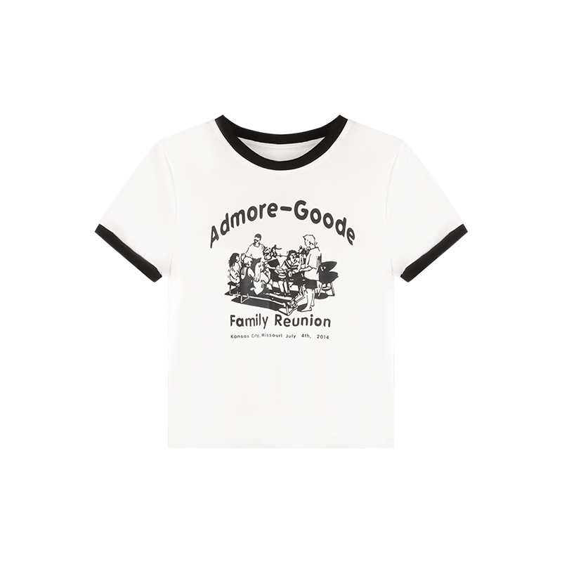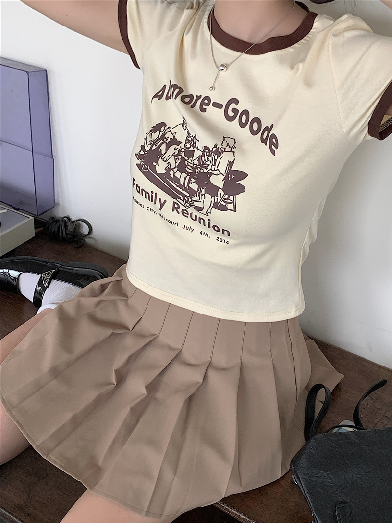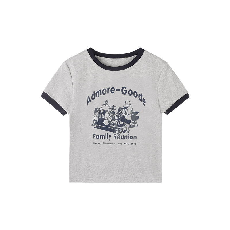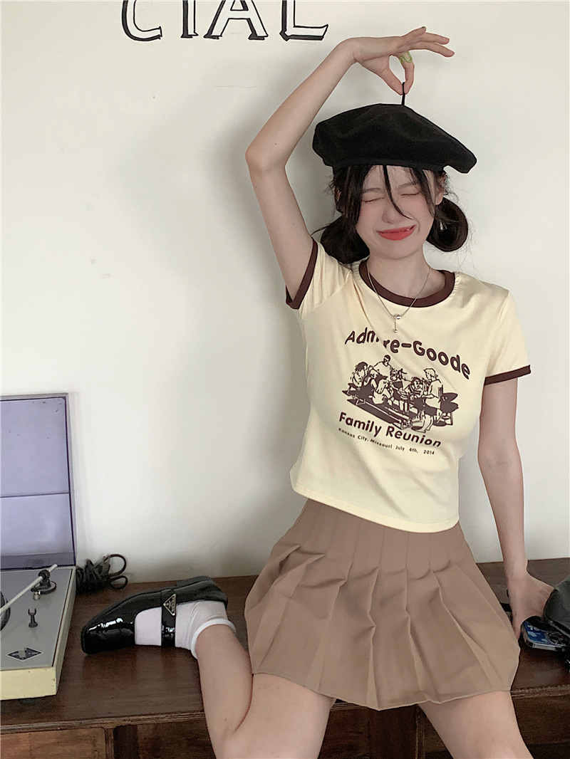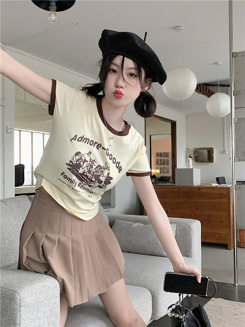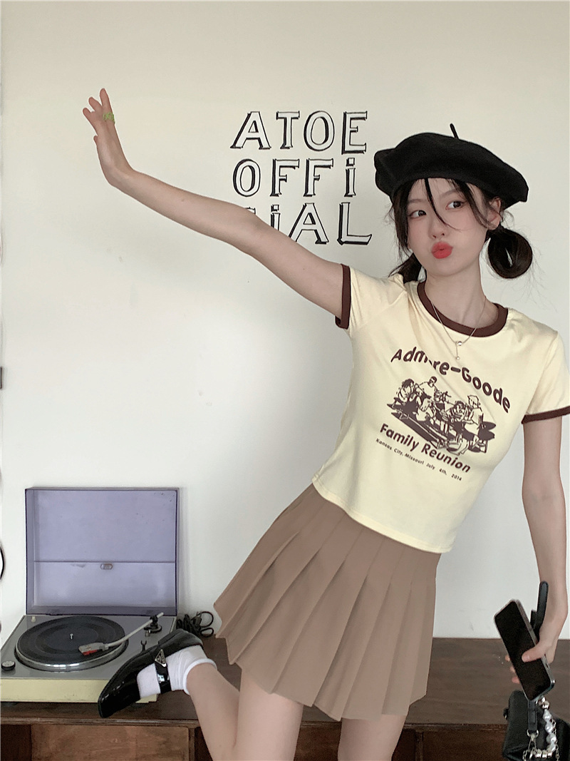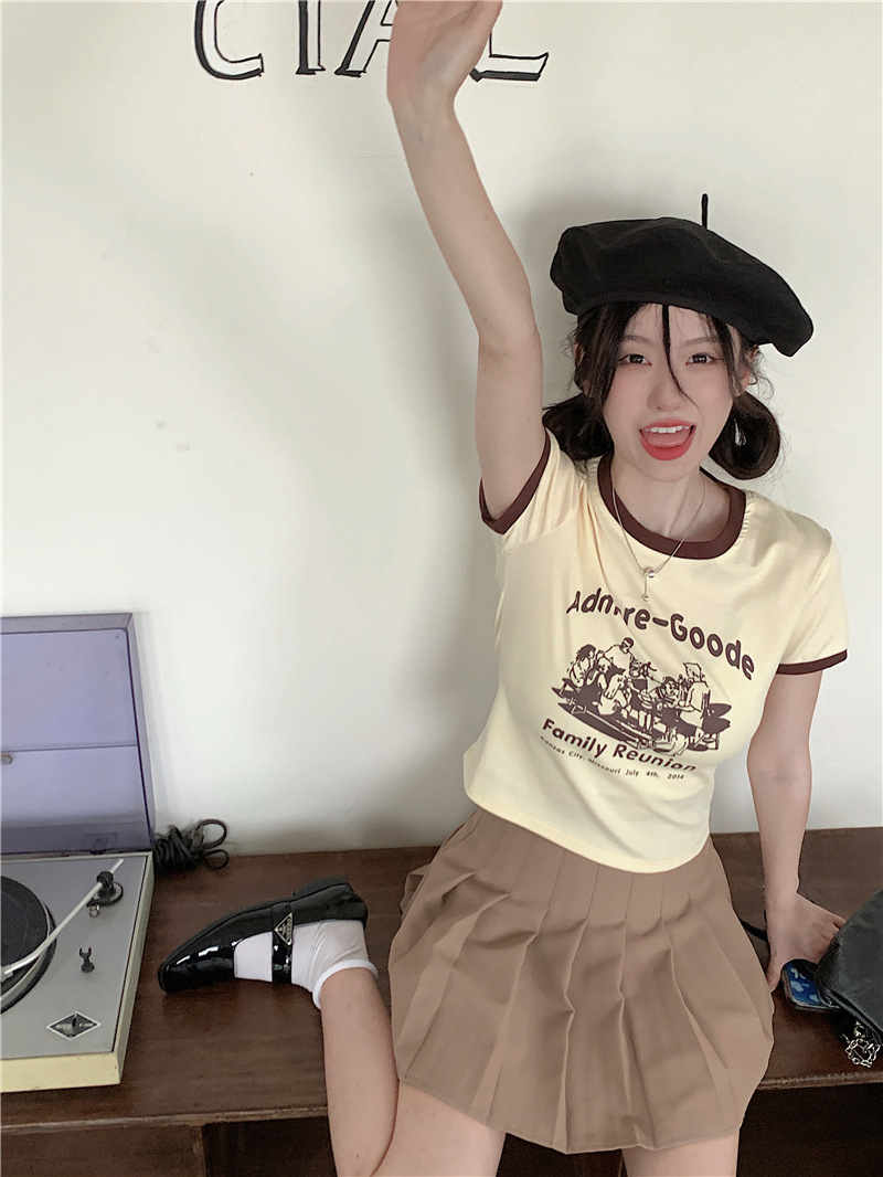 달콤하고 매운 스타일의 레터 프린트 티셔츠 여성용 2025 여름 슬림핏 숏 스타일 배색 라운드넥 반팔 학생용 상의