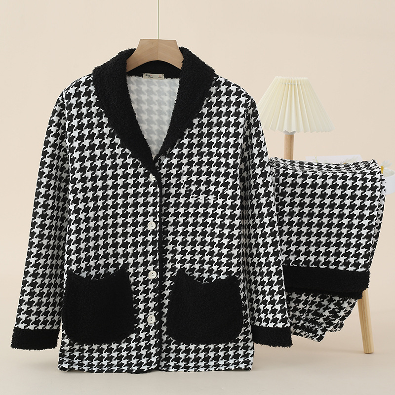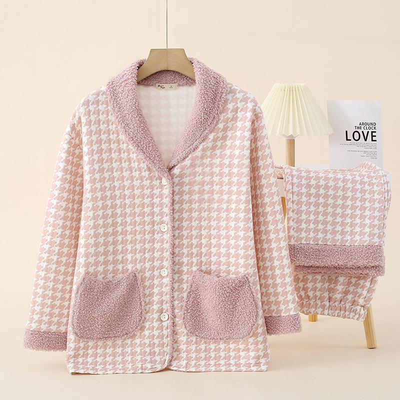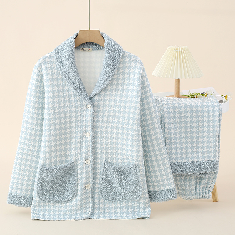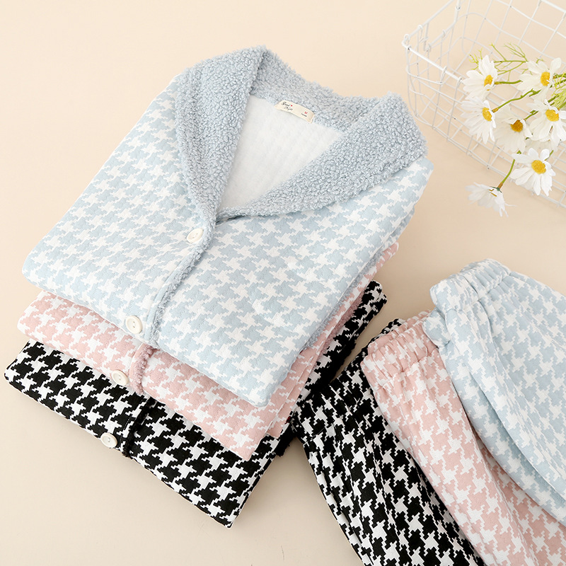 가을 겨울용 두꺼운 에어 코튼 잠옷 여성용 긴팔 긴바지 외출 가능 홈웨어 세트 테디 벨벳 칼라 잠옷스토어 가기