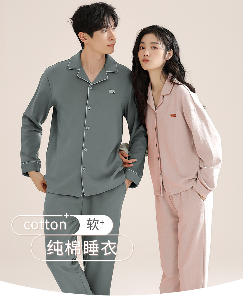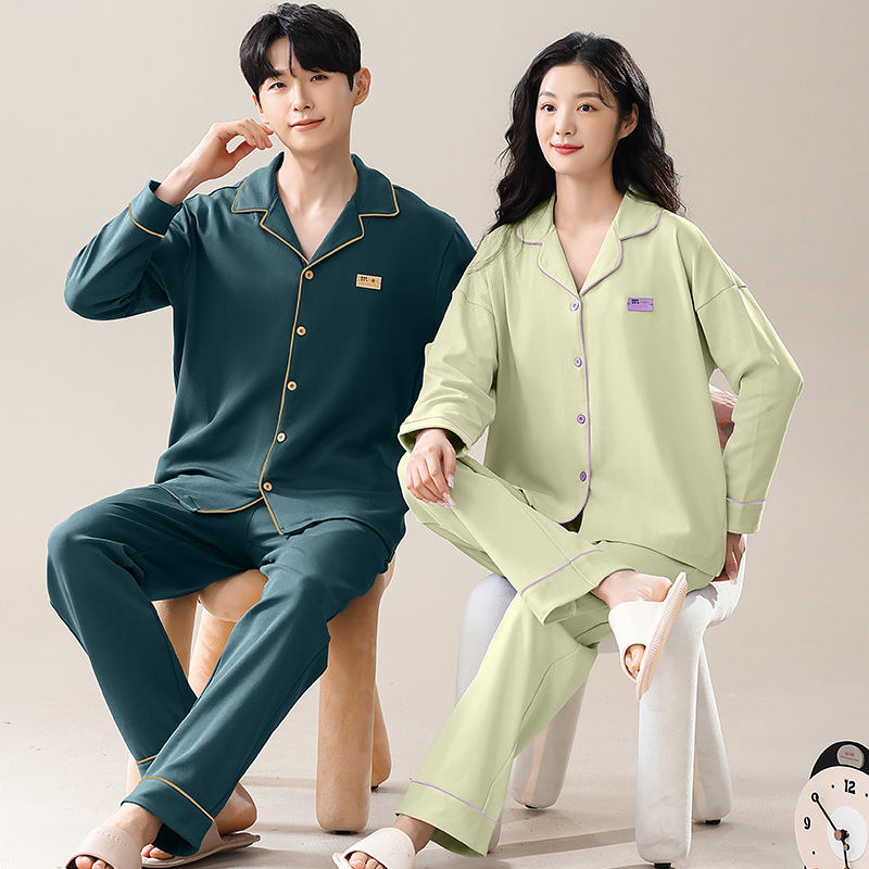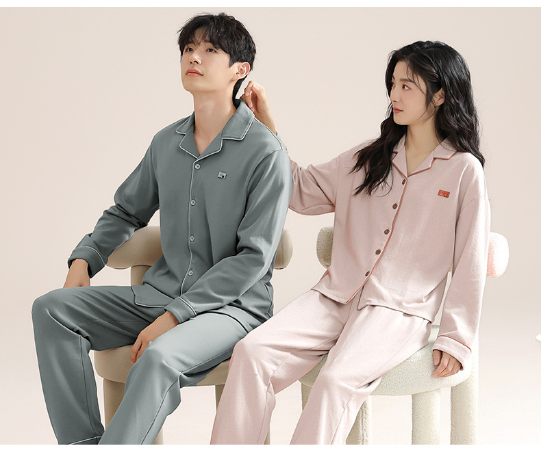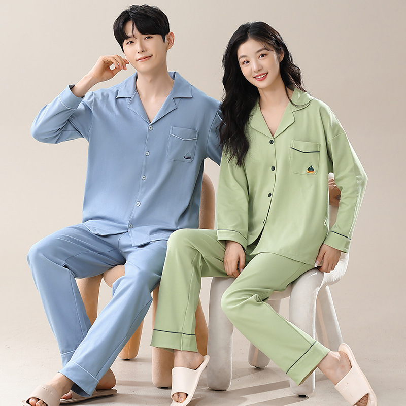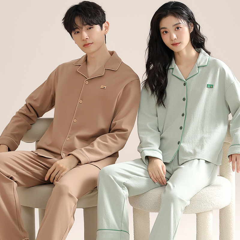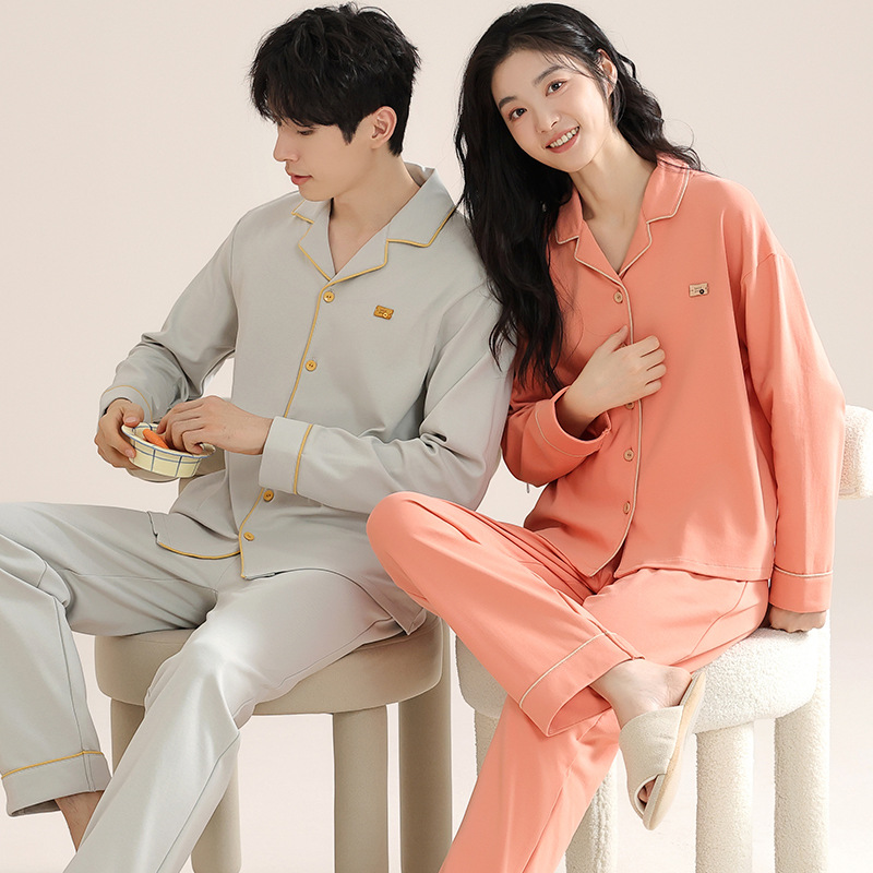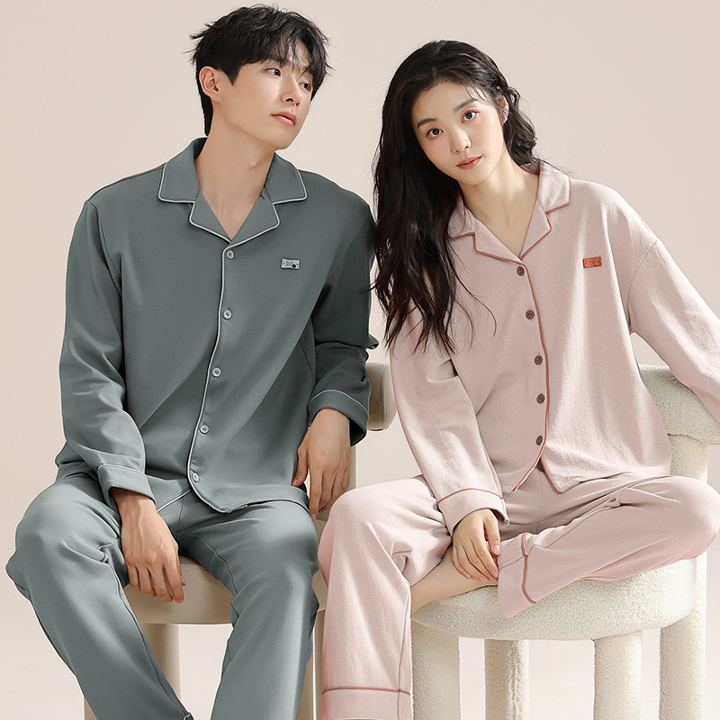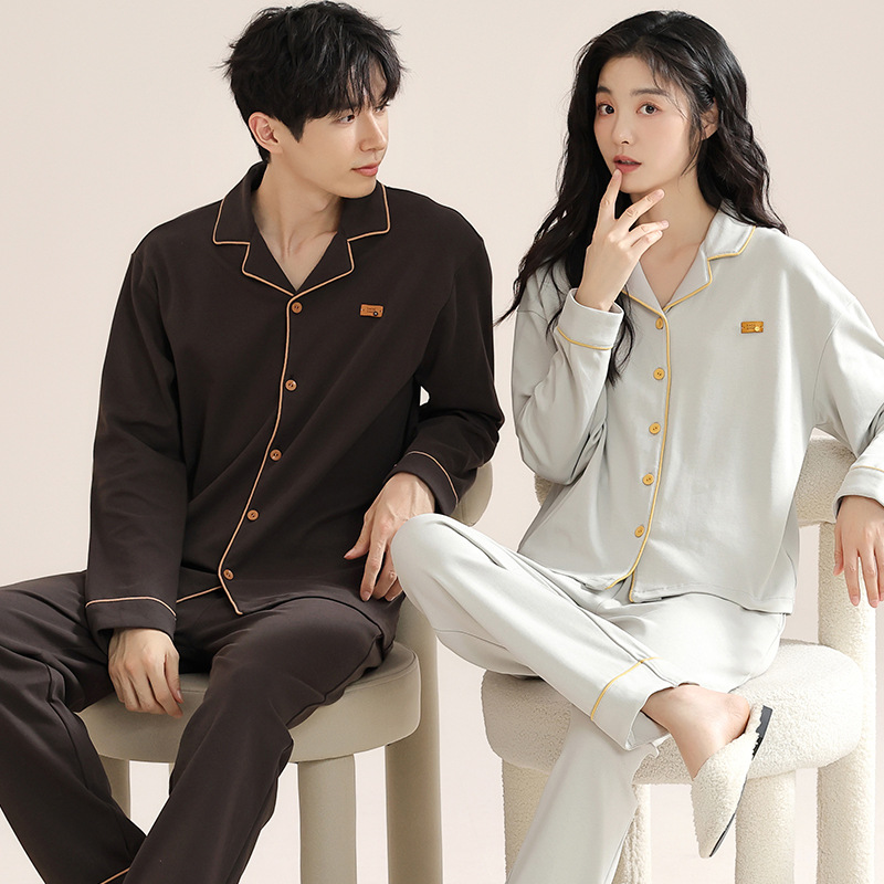 커플의 퓨어 코튼 파자마 남자 옷깃 긴 소매 바지 세트 가을 뉴 남성과 여성의 퓨어 코튼 솔리드 컬러 카디건 파자마스토어 가기