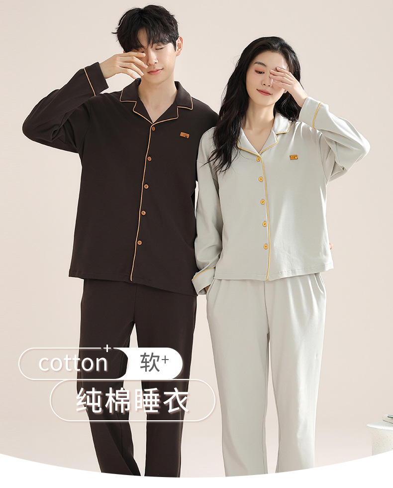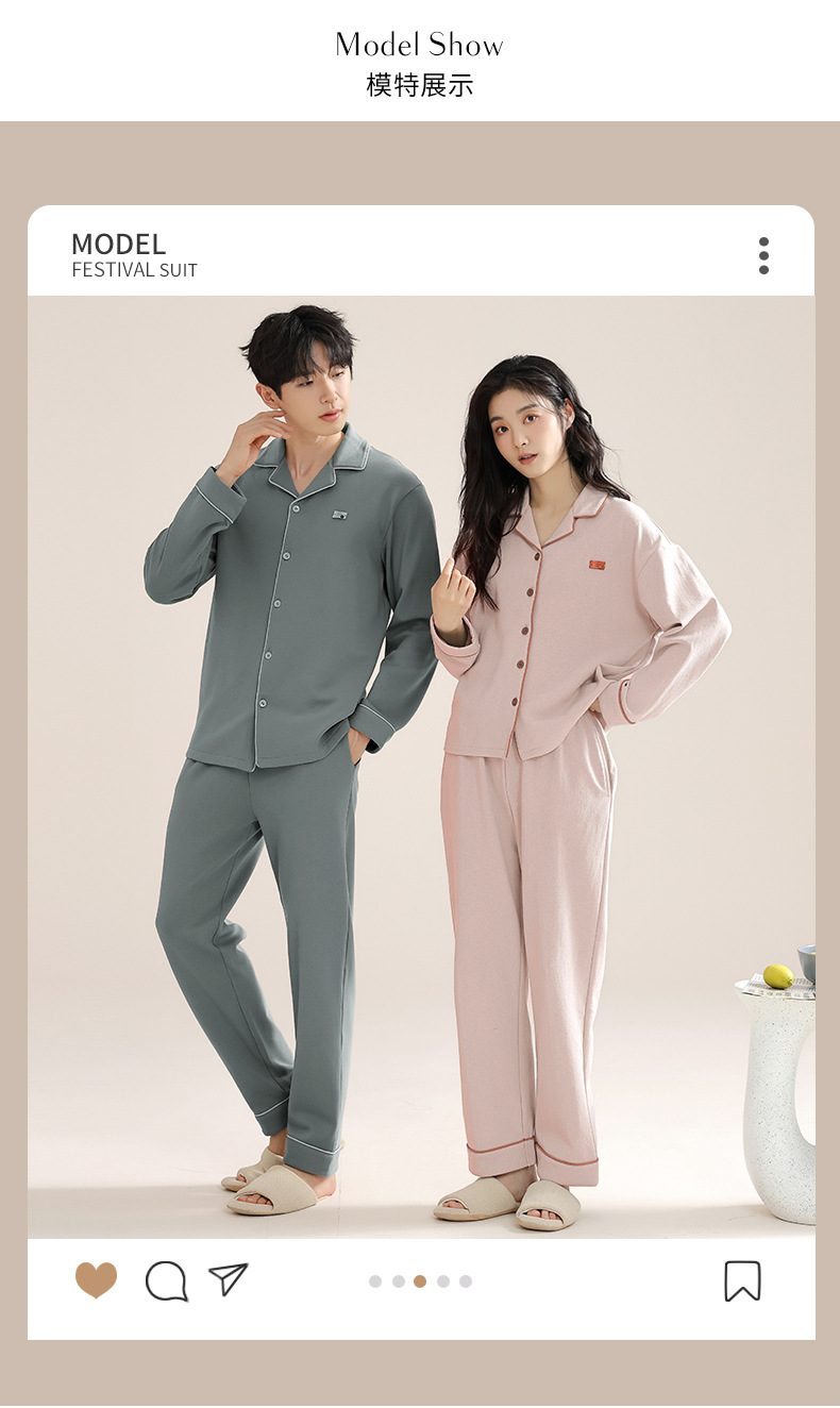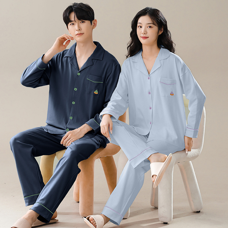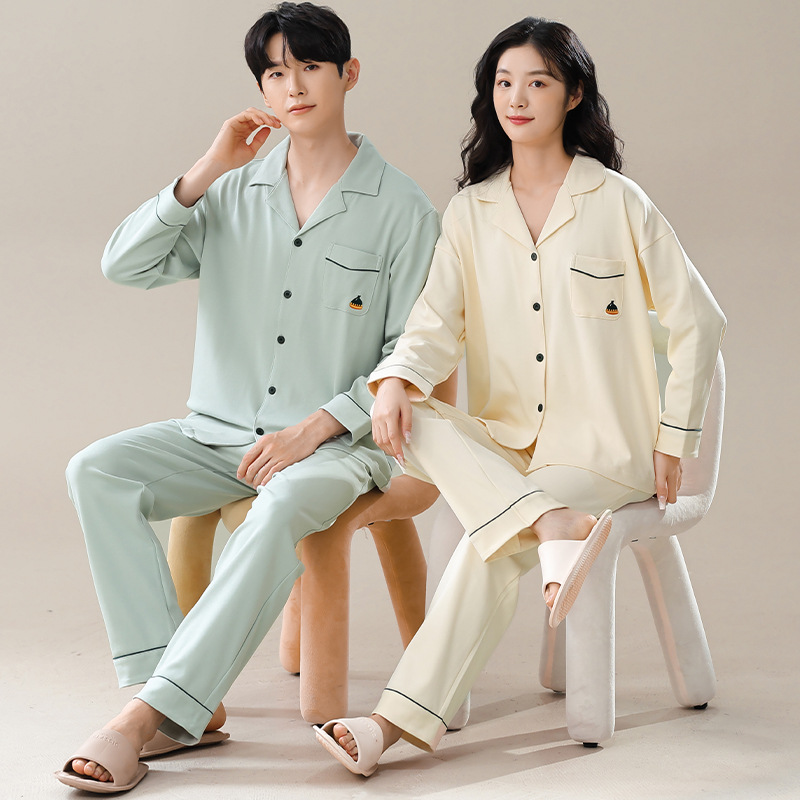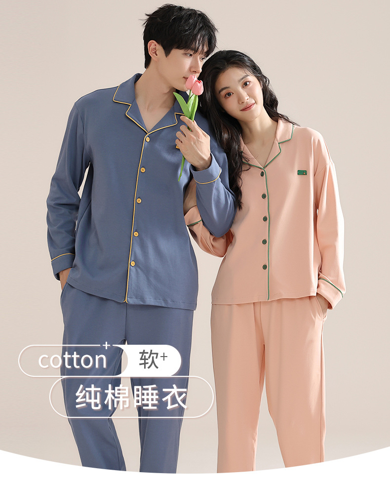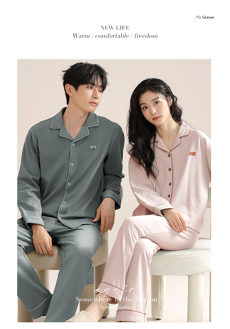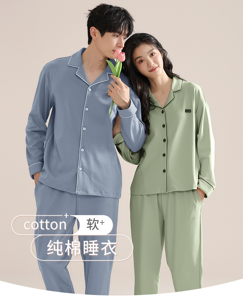 커플의 퓨어 코튼 파자마 남자 옷깃 긴 소매 바지 세트 가을 뉴 남성과 여성의 퓨어 코튼 솔리드 컬러 카디건 파자마스토어 가기