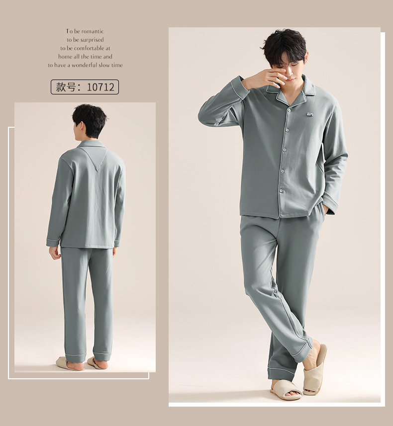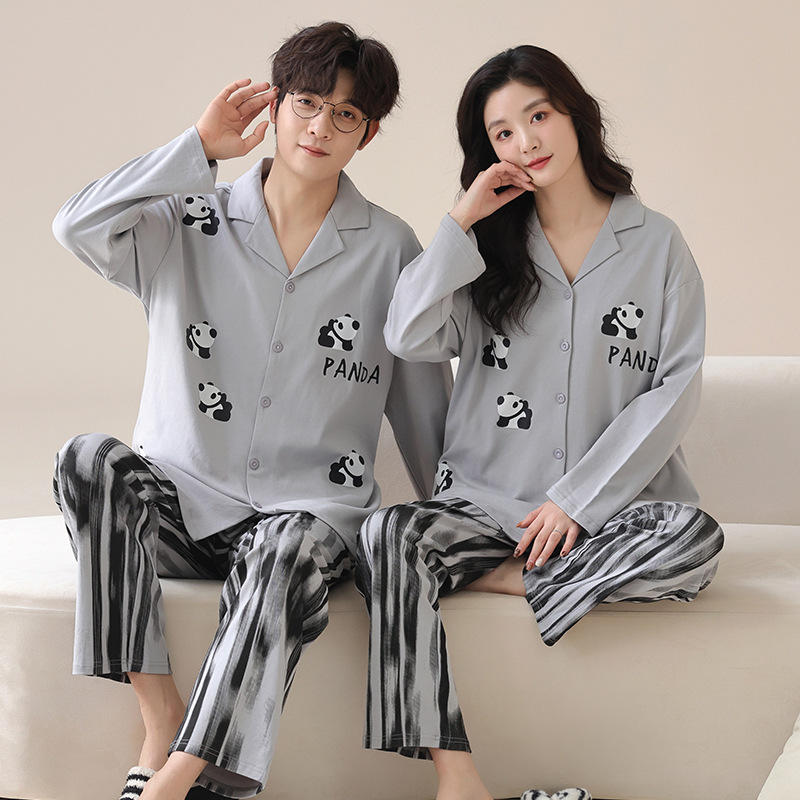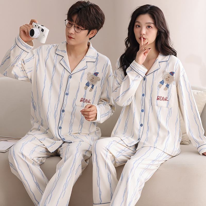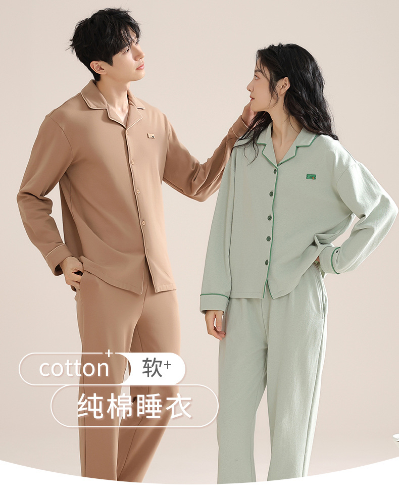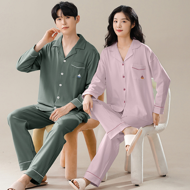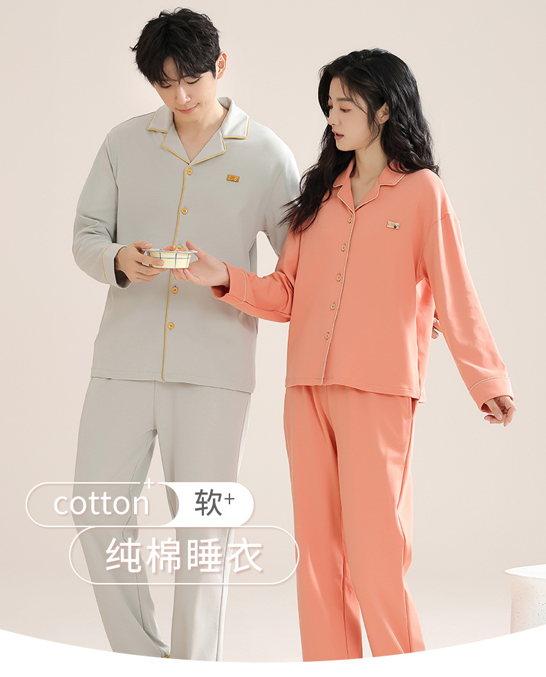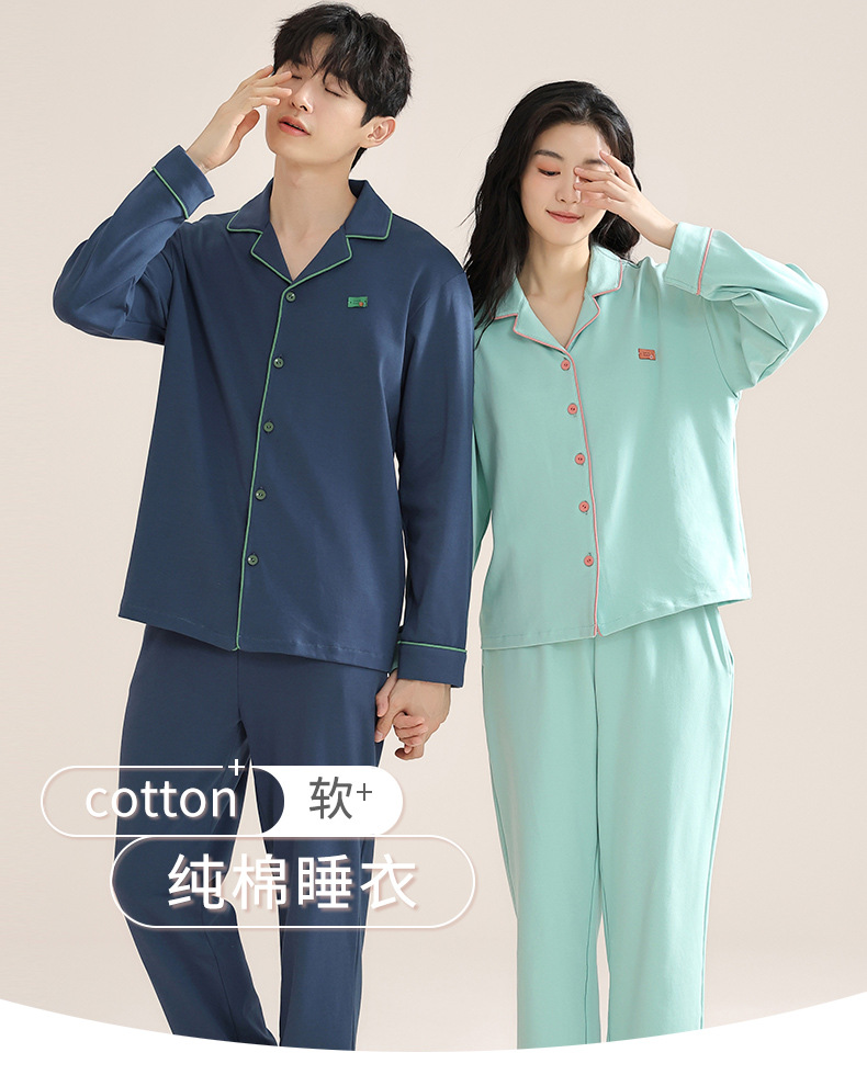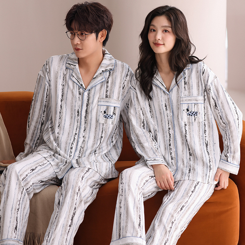 커플의 퓨어 코튼 파자마 남자 옷깃 긴 소매 바지 세트 가을 뉴 남성과 여성의 퓨어 코튼 솔리드 컬러 카디건 파자마스토어 가기