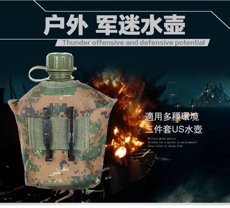 【说明】:最外层保暖套、无毒塑料水壶、铝饭盒;没有背带,水壶套背后有挂腰带的金属卡子,容积1-3升