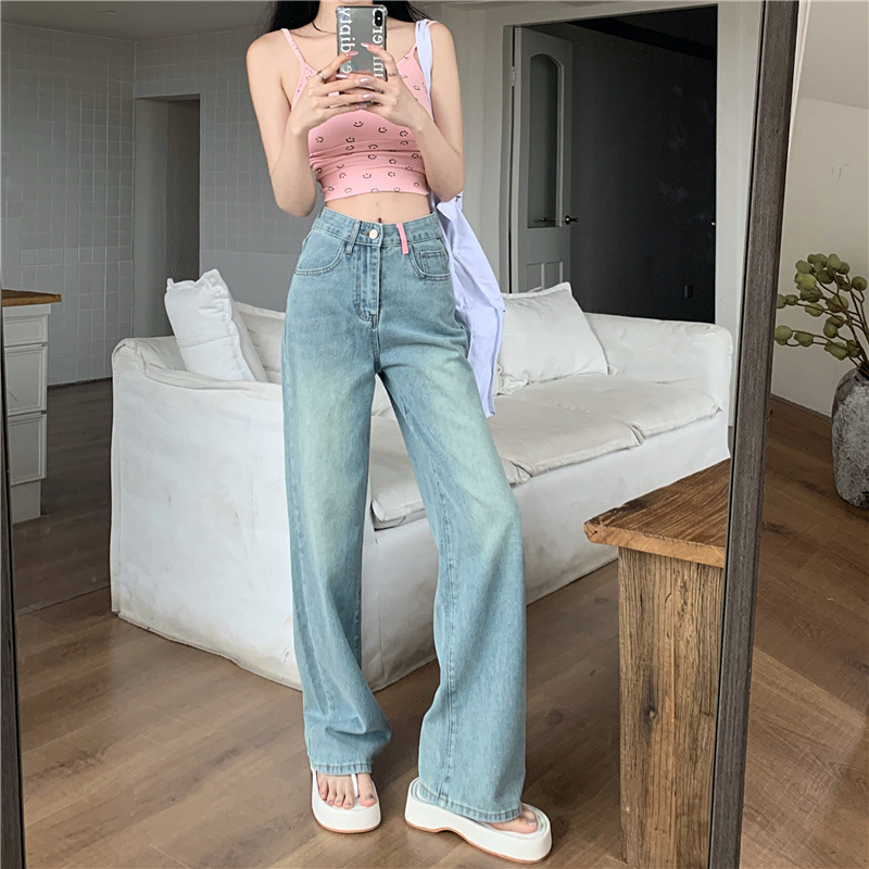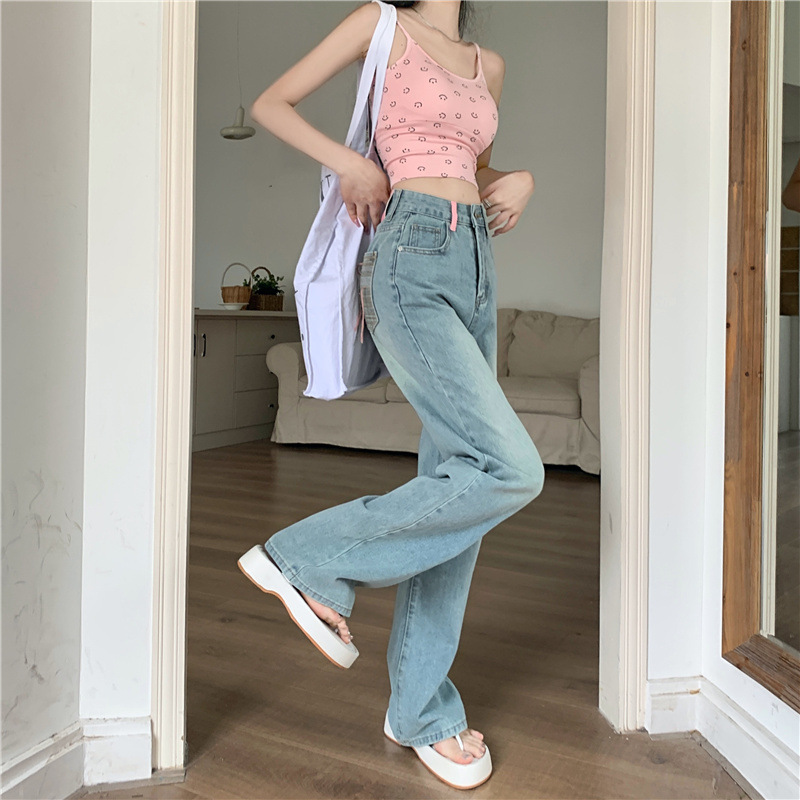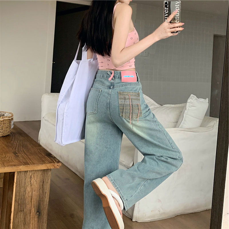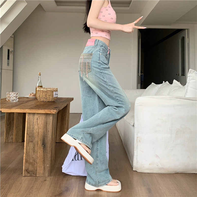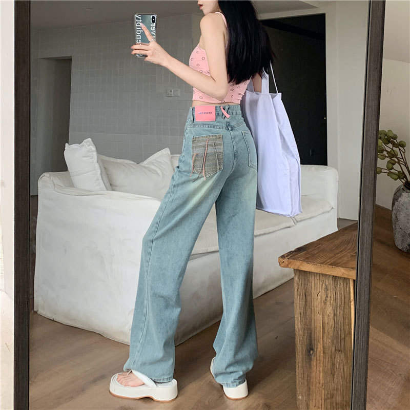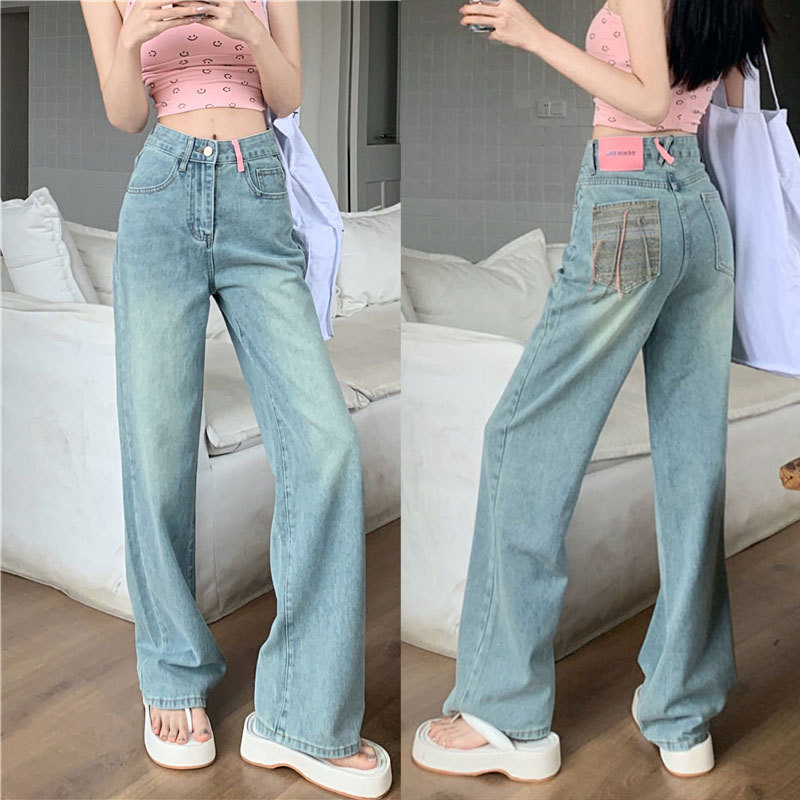 대비 색상 청바지 여성의 새로운 여름과 가을 디자인 하이 웨이스트 틈새 자수 포켓 캐주얼 와이드 레그 스트레이트 바지스토어 가기