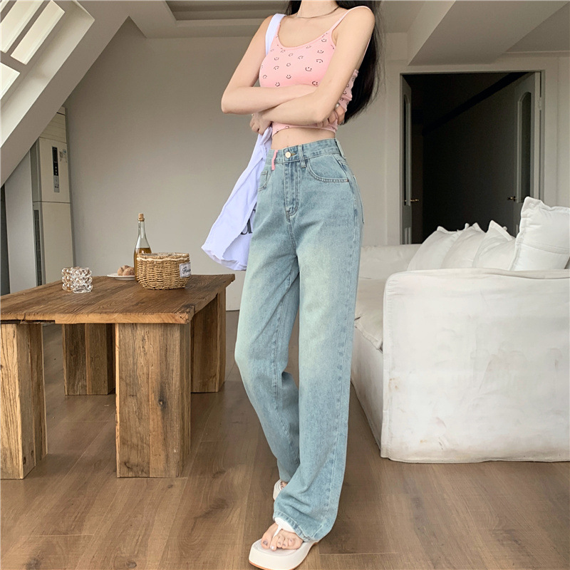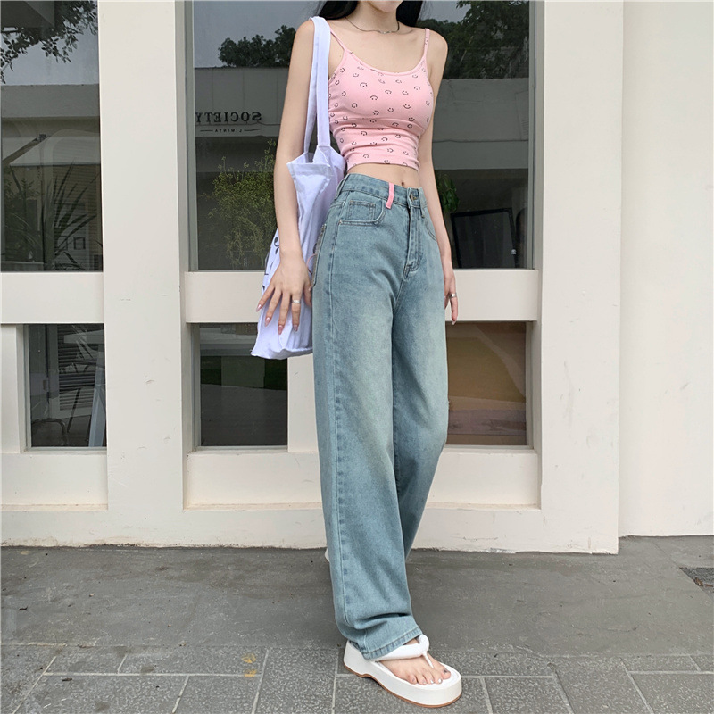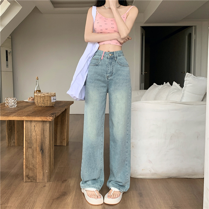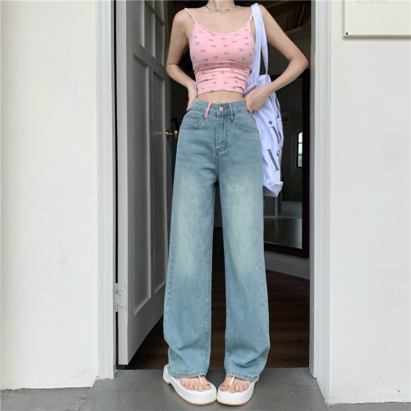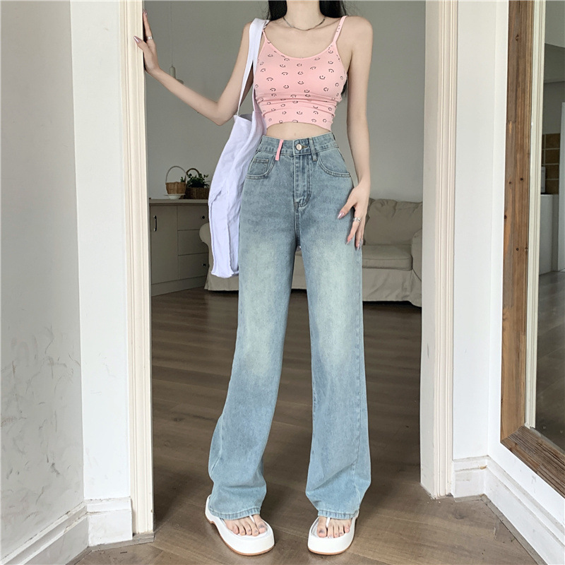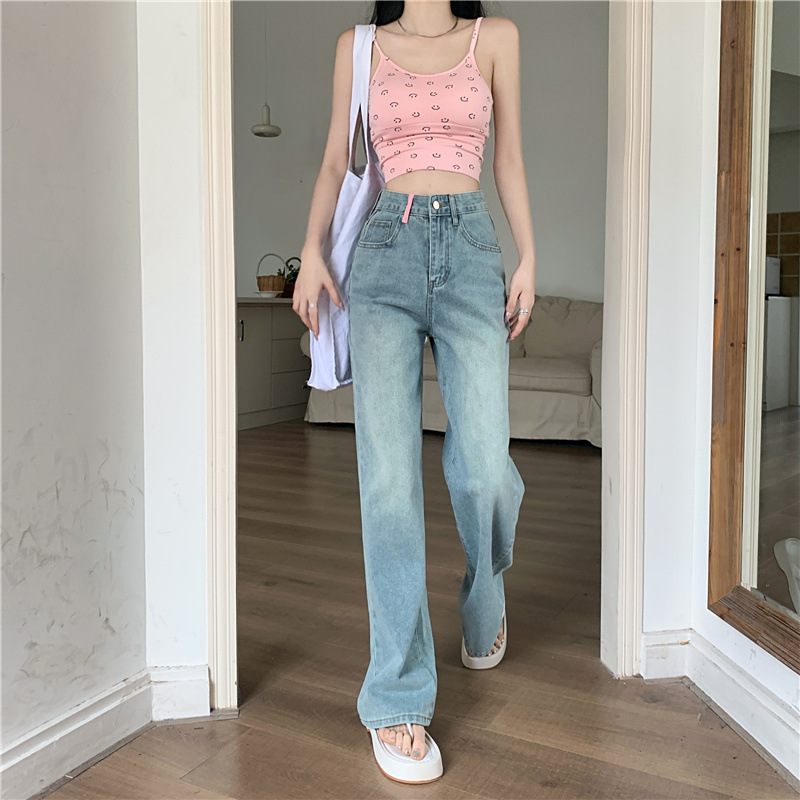 대비 색상 청바지 여성의 새로운 여름과 가을 디자인 하이 웨이스트 틈새 자수 포켓 캐주얼 와이드 레그 스트레이트 바지스토어 가기