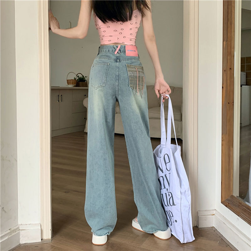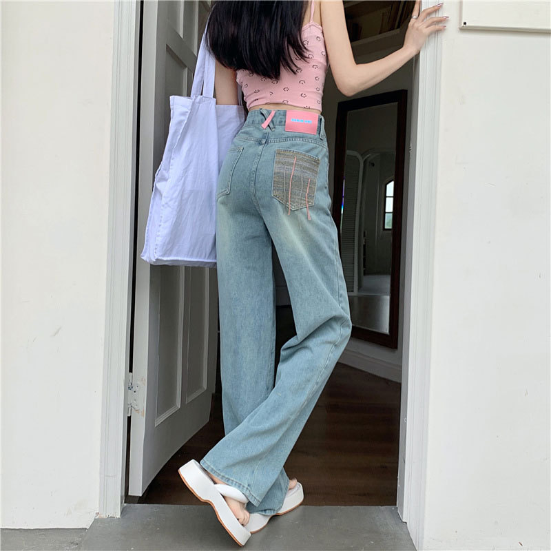 대비 색상 청바지 여성의 새로운 여름과 가을 디자인 하이 웨이스트 틈새 자수 포켓 캐주얼 와이드 레그 스트레이트 바지