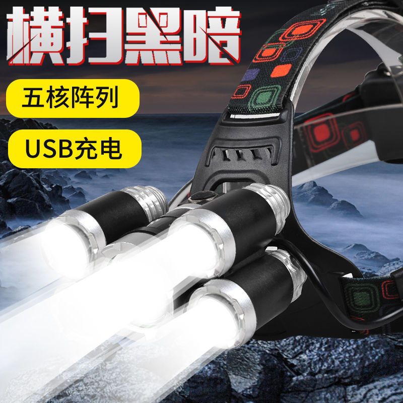 국경 간 옥외 조명 밝은 알루미늄 합금 캠핑 고출력 5 헤드 리튬 배터리 충전식 줌 야간 낚시 헤드 라이트