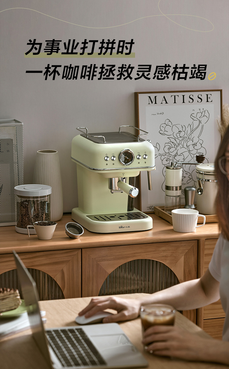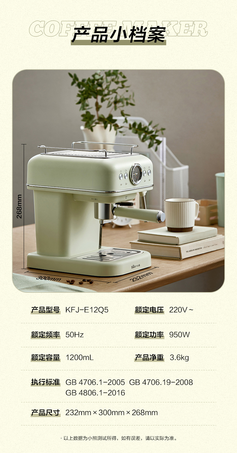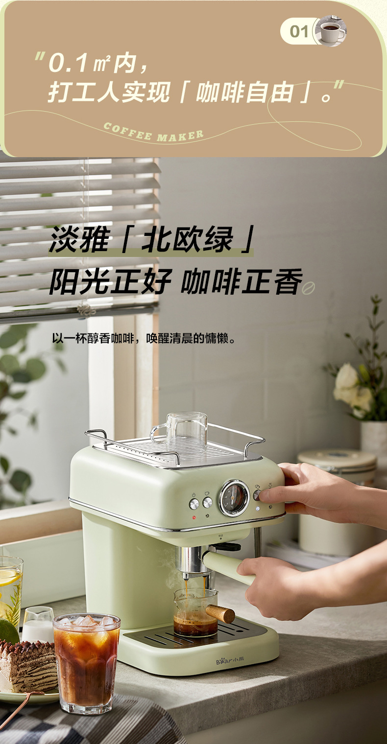 小熊(Bear)咖啡机 家用小型意式全半自动 20Bar泵压式高压萃取 花式浓缩奶泡冲泡一体 办公室小白咖啡角