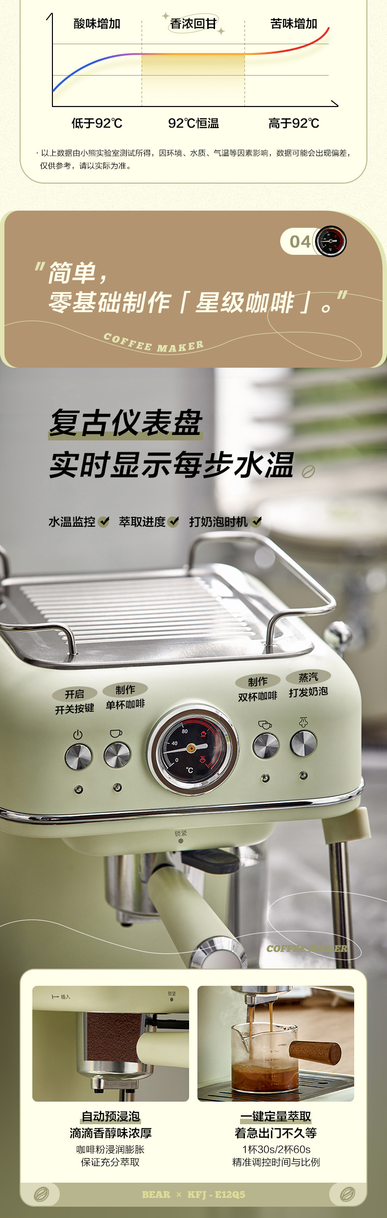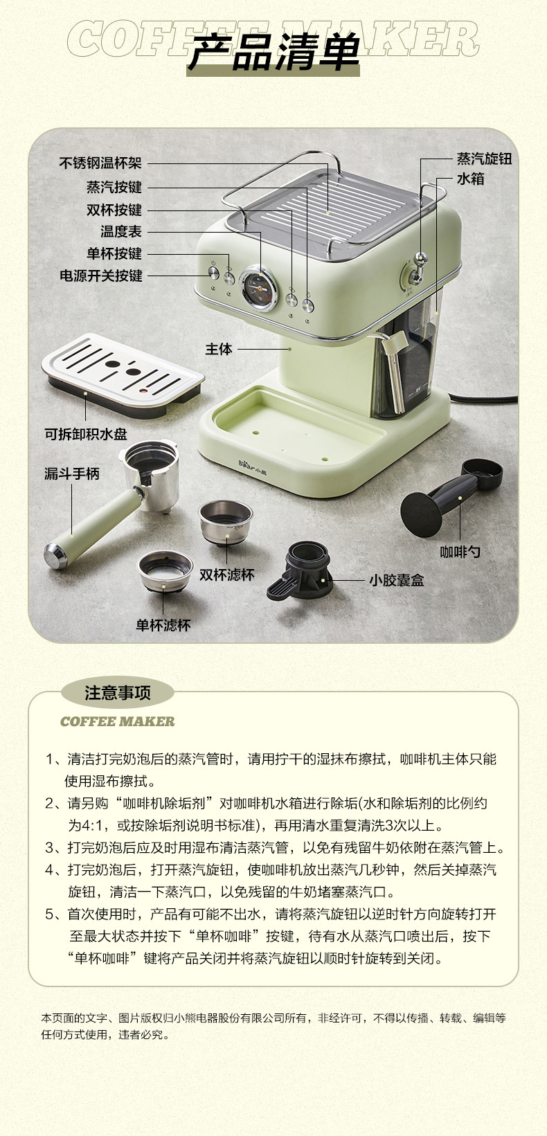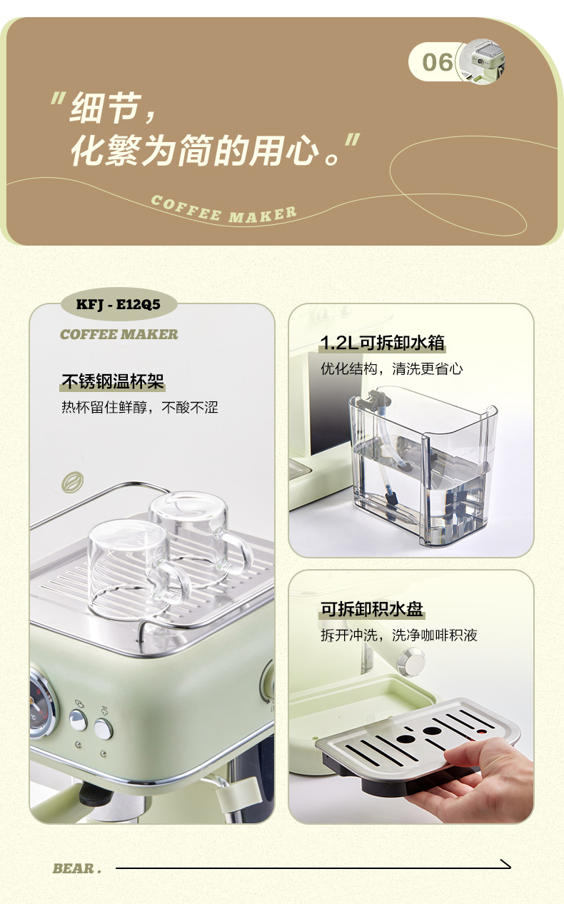 小熊(Bear)咖啡机 家用小型意式全半自动 20Bar泵压式高压萃取 花式浓缩奶泡冲泡一体 办公室小白咖啡角