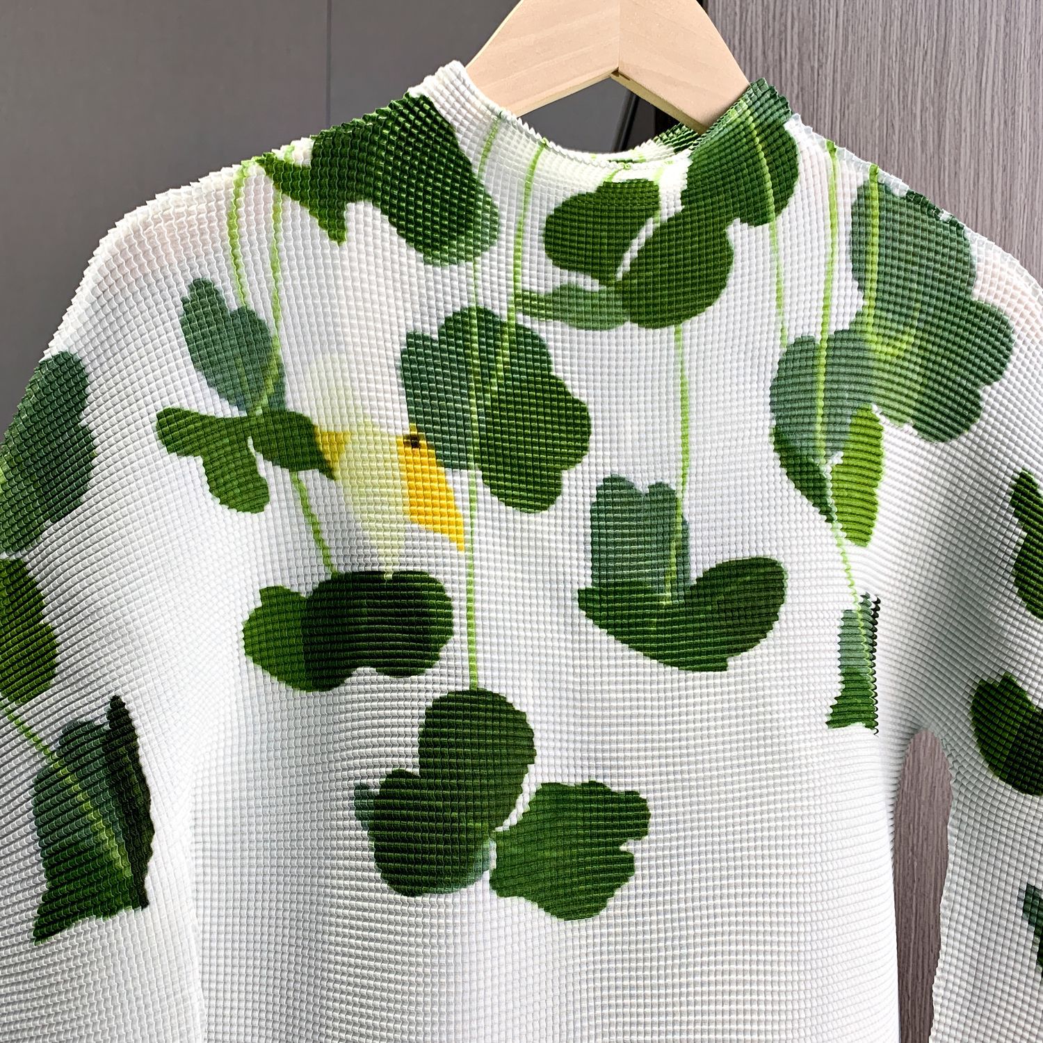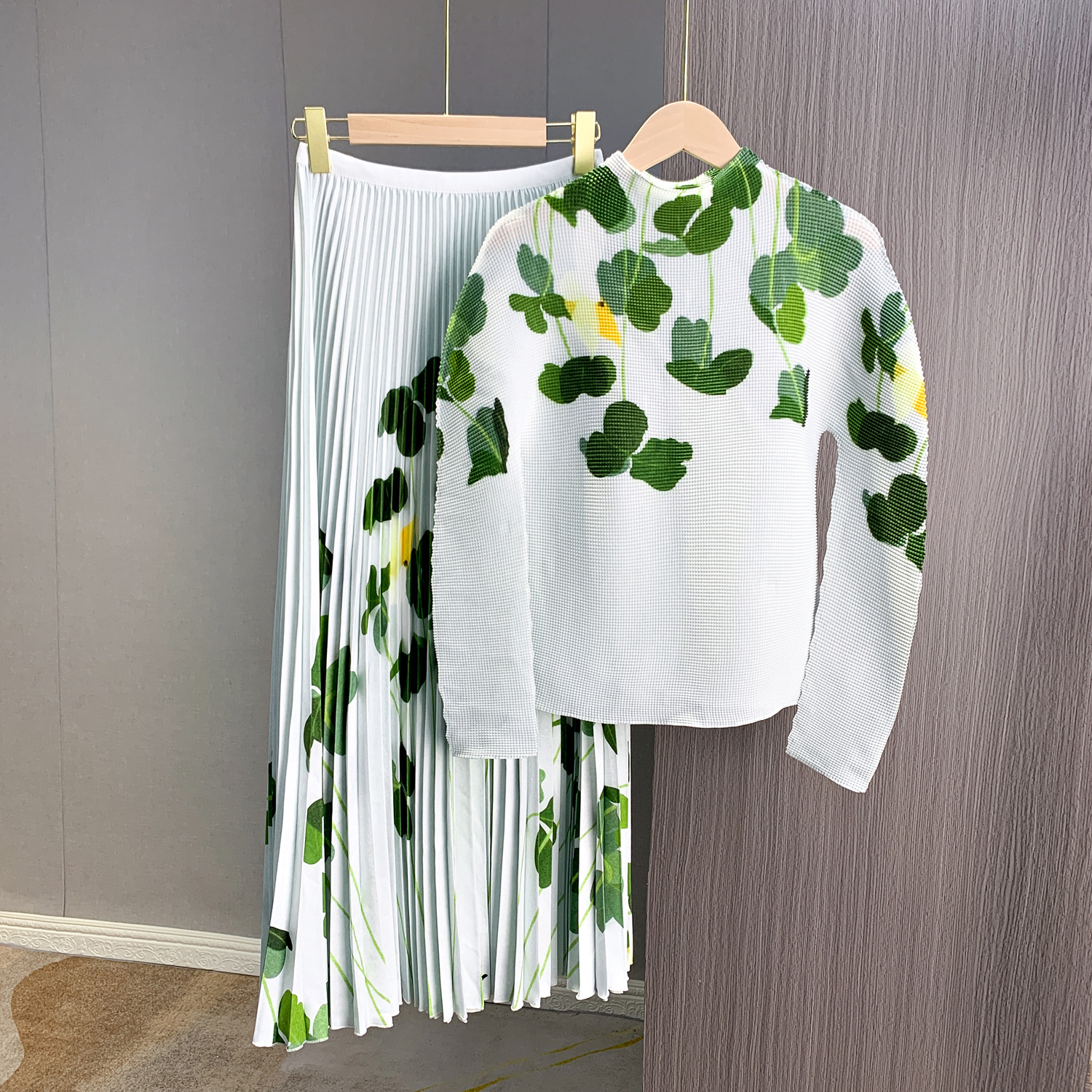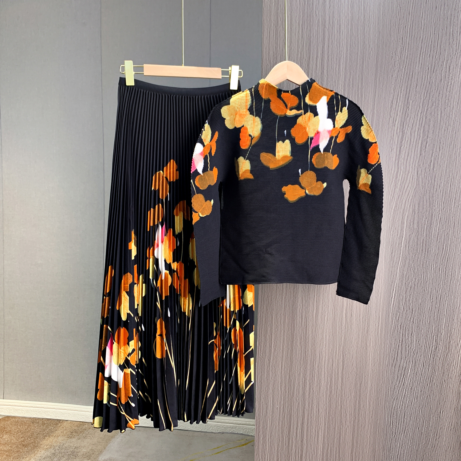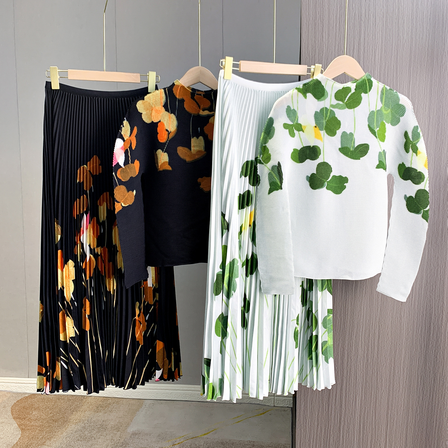 미야케 플리츠 세련된 플로럴 프린트 스커트 세트 가을 새로운 유행 우아한 슬림 핏 스트레치 원피스 여성용