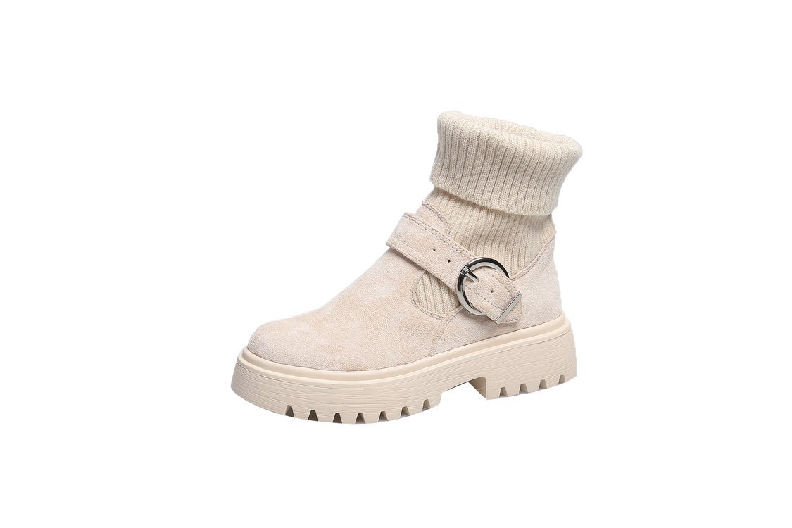 2023 가을과 겨울 새로운 스노우 부츠 두꺼운 바닥 벨트 버클 울 튜브 기모 여성의 짧은 부츠 라운드 양말 부츠 조수