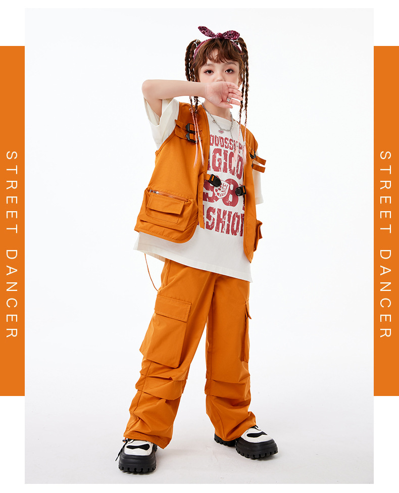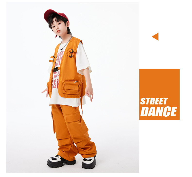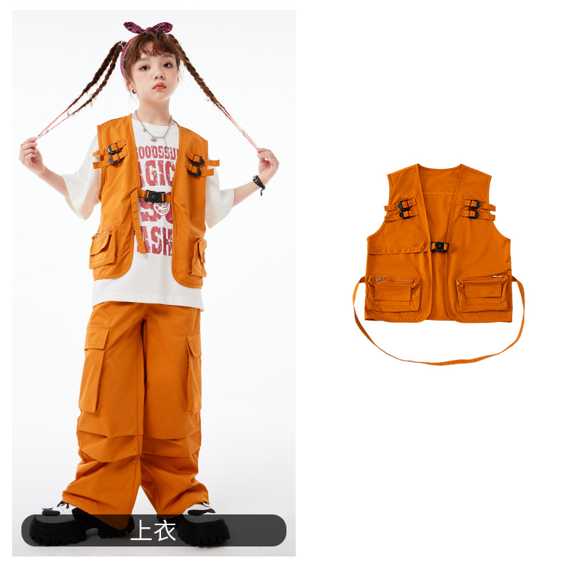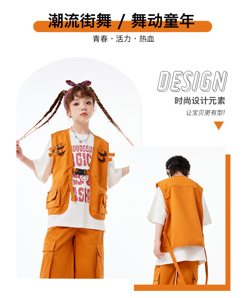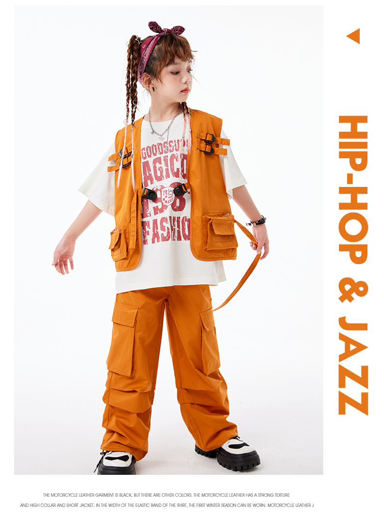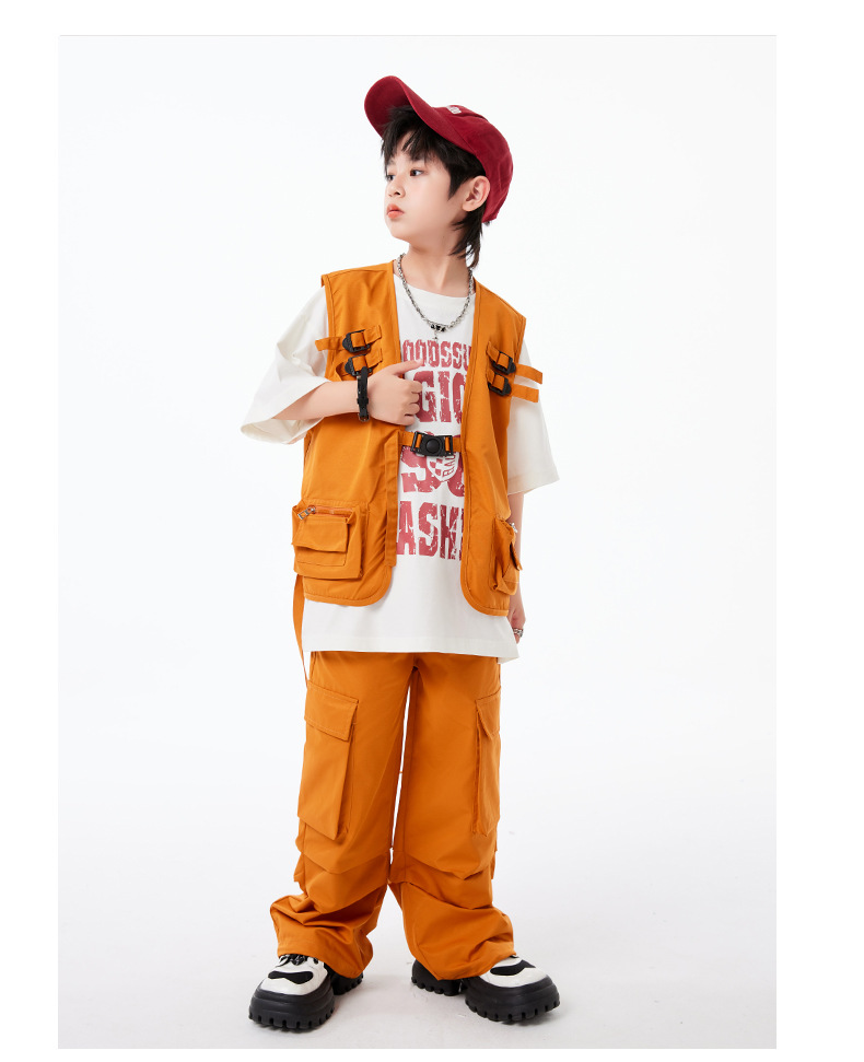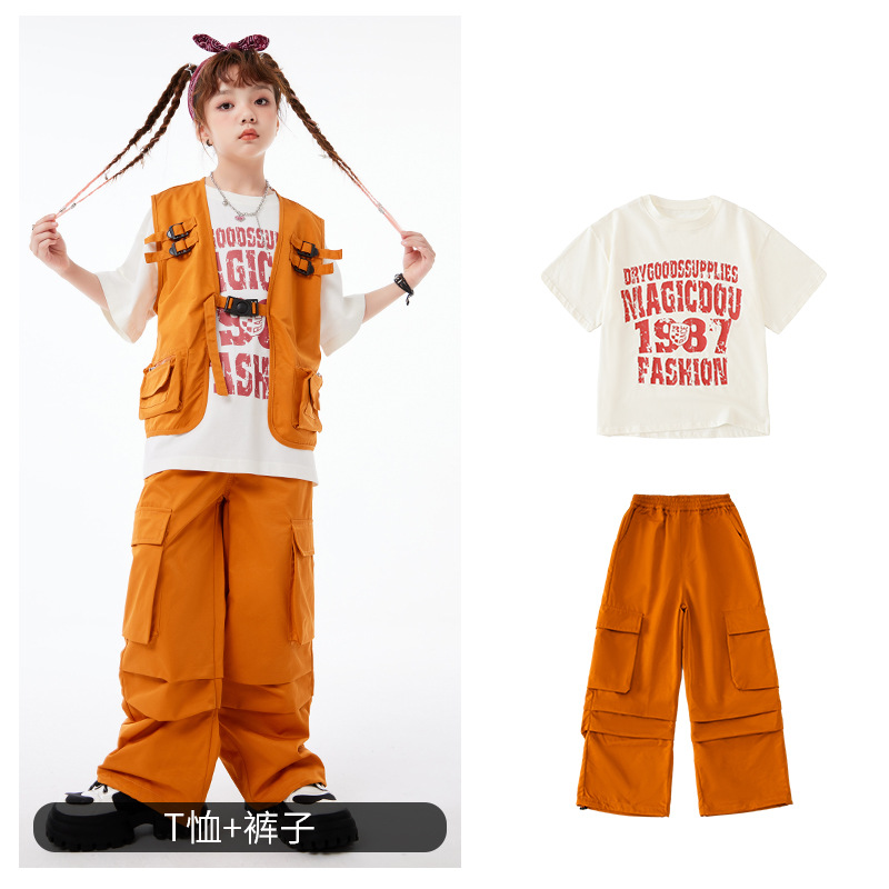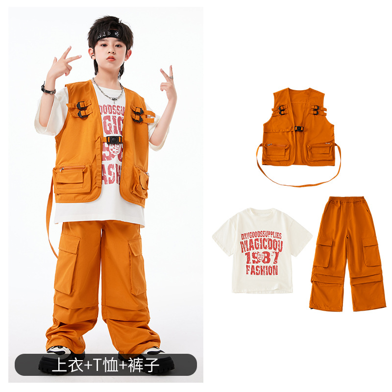 스트리트 댄스 어린이 패션 의류 힙합 시원한 여름 소년과 소녀 오렌지 조끼 3 종 세트 드럼 세트 느슨한 반팔 세트