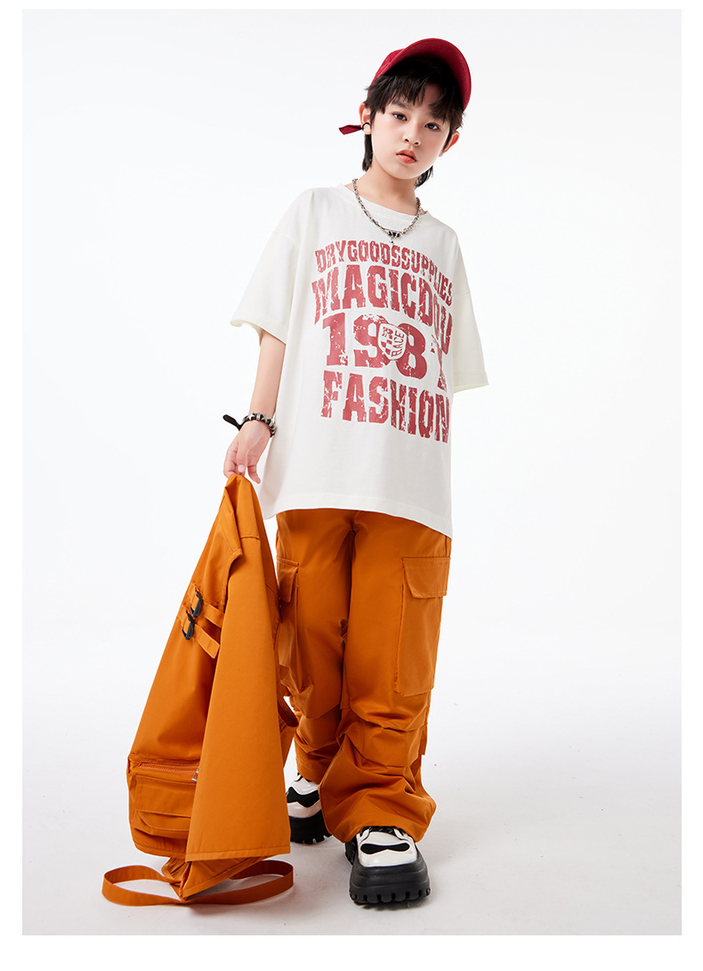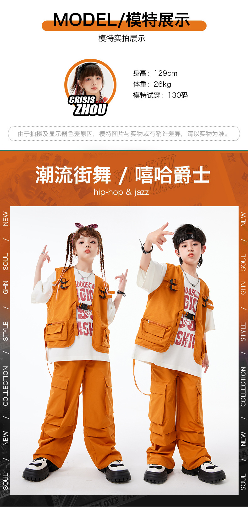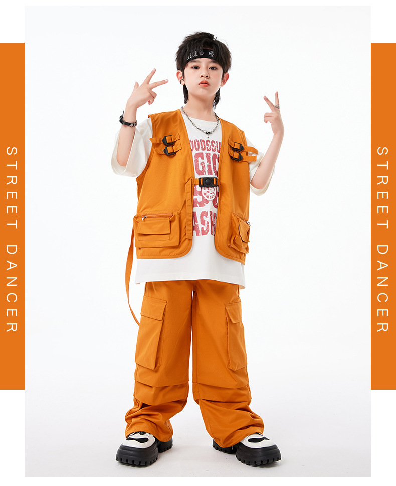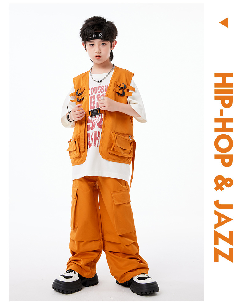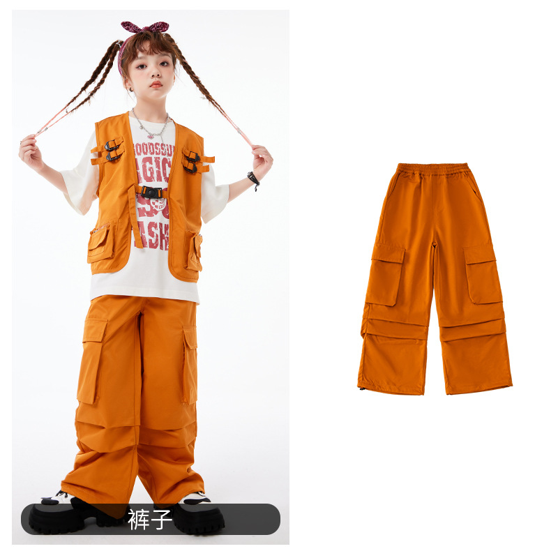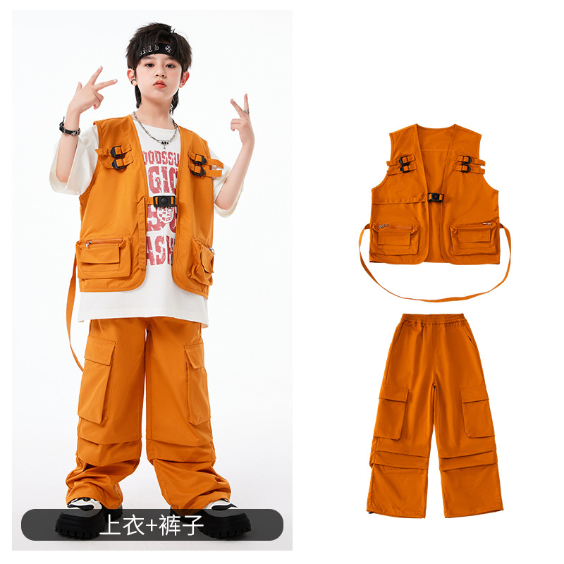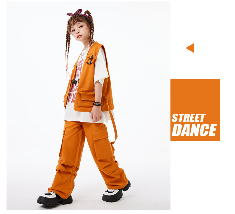 스트리트 댄스 어린이 패션 의류 힙합 시원한 여름 소년과 소녀 오렌지 조끼 3 종 세트 드럼 세트 느슨한 반팔 세트