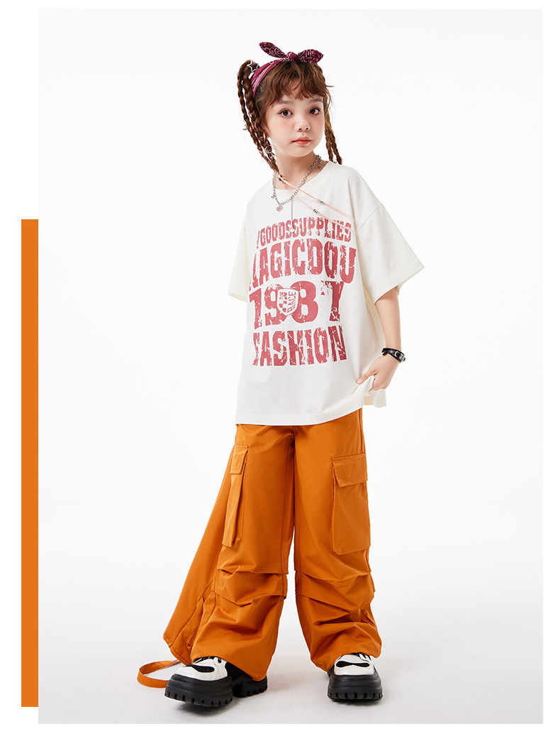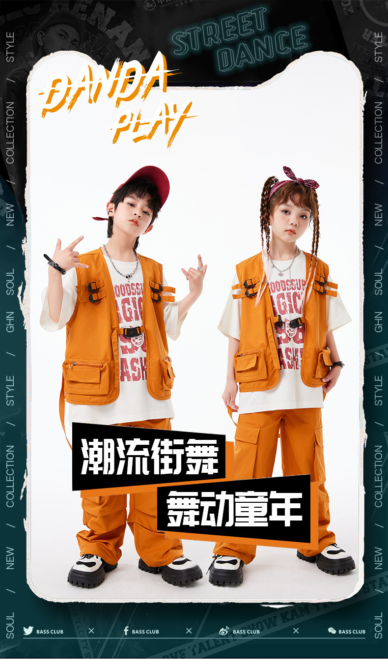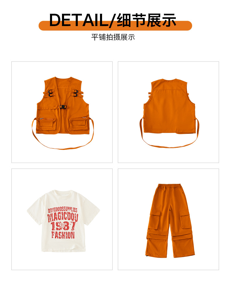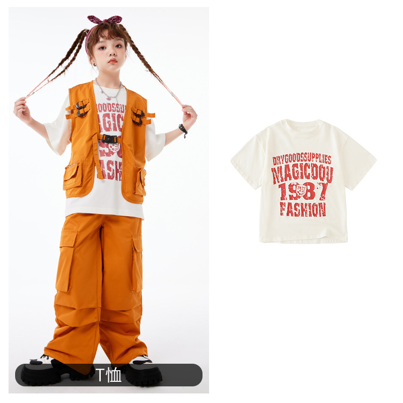 스트리트 댄스 어린이 패션 의류 힙합 시원한 여름 소년과 소녀 오렌지 조끼 3 종 세트 드럼 세트 느슨한 반팔 세트스토어 가기