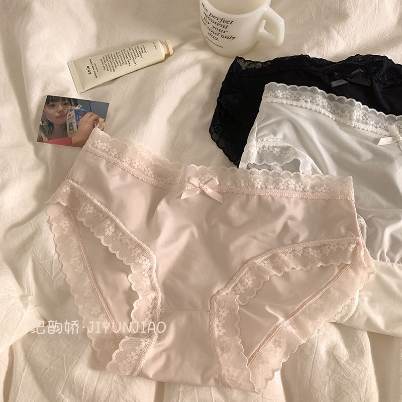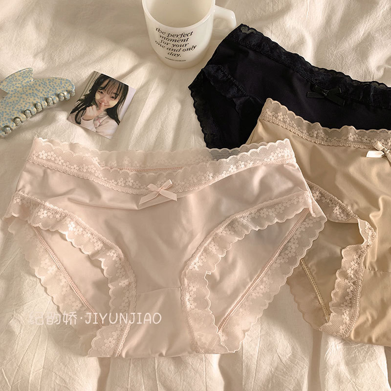 일본식 레이스 에지 아이스 실크 속옷 여성용 추적없는 중간 허리 피부 친화적 인 섹시한 여름 경량 심플 속옷 여성용