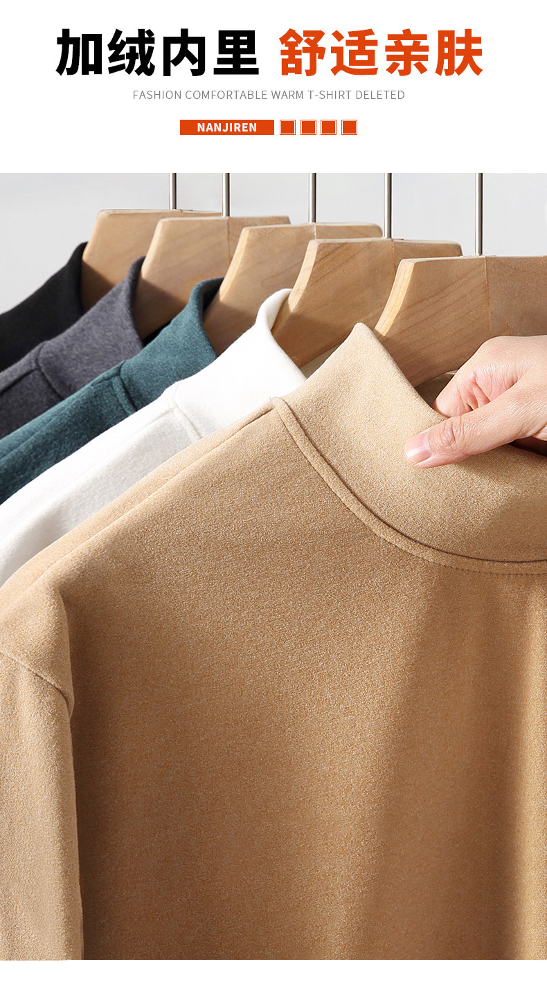 긴팔 바닥 셔츠 가을과 겨울 새로운 벨벳 티셔츠 남성용 긴팔 겨울 단색 세미 하이 칼라 캐주얼 느슨한 바닥 셔츠