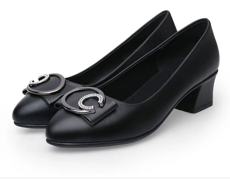 얕은 입 두꺼운 굽 신발 여성 2023 가을 어머니 부드러운 가죽 작업 통근 금속 버클 작은 가죽 신발 대외 무역 도매스토어 가기