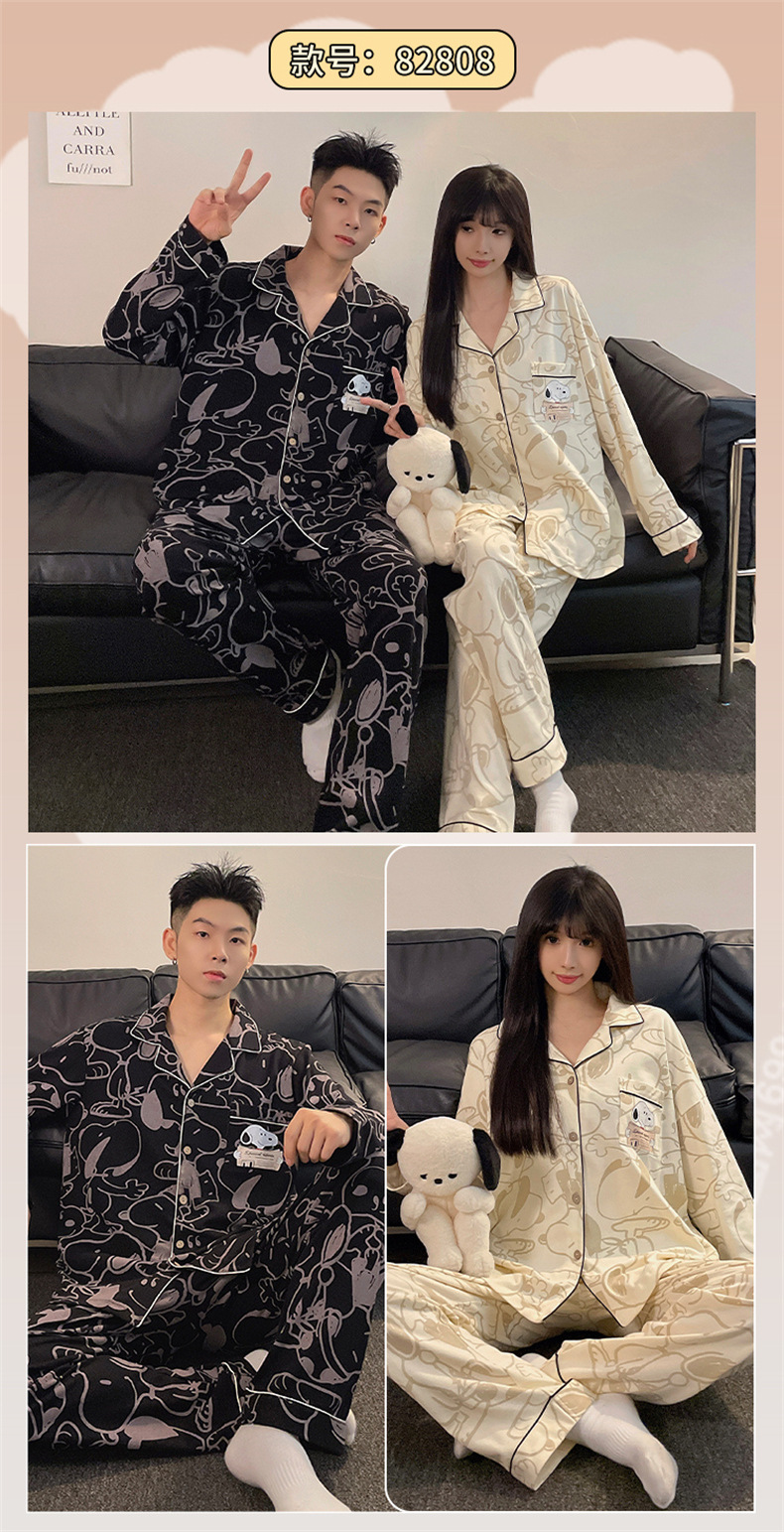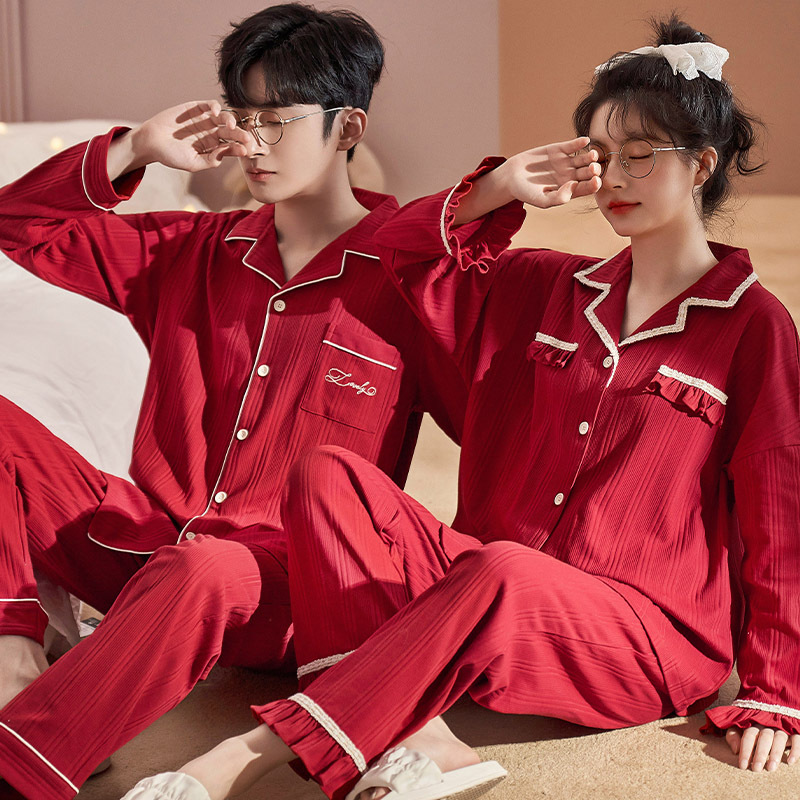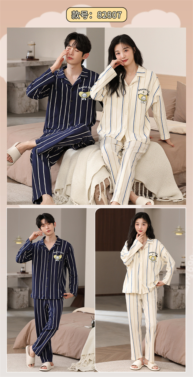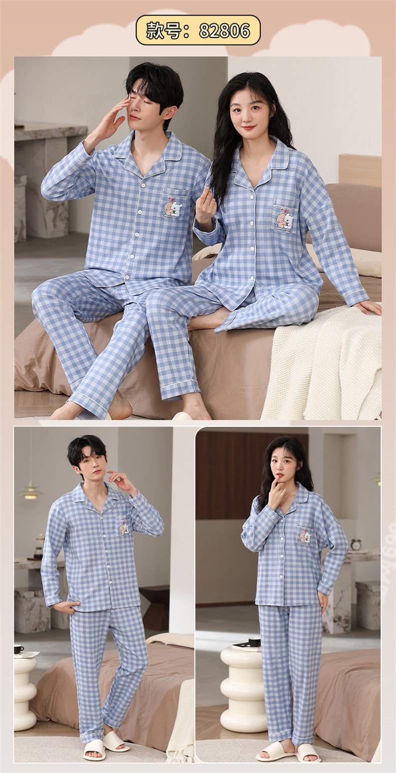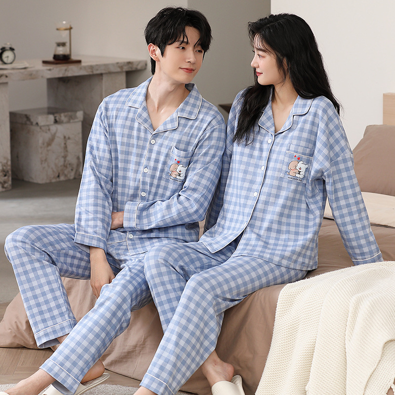 커플 잠옷 여성의 봄과 가을 새로운 모조 면 카디건 옷깃 만화 귀여운 달콤한 남자의 집 옷 투피스 세트스토어 가기