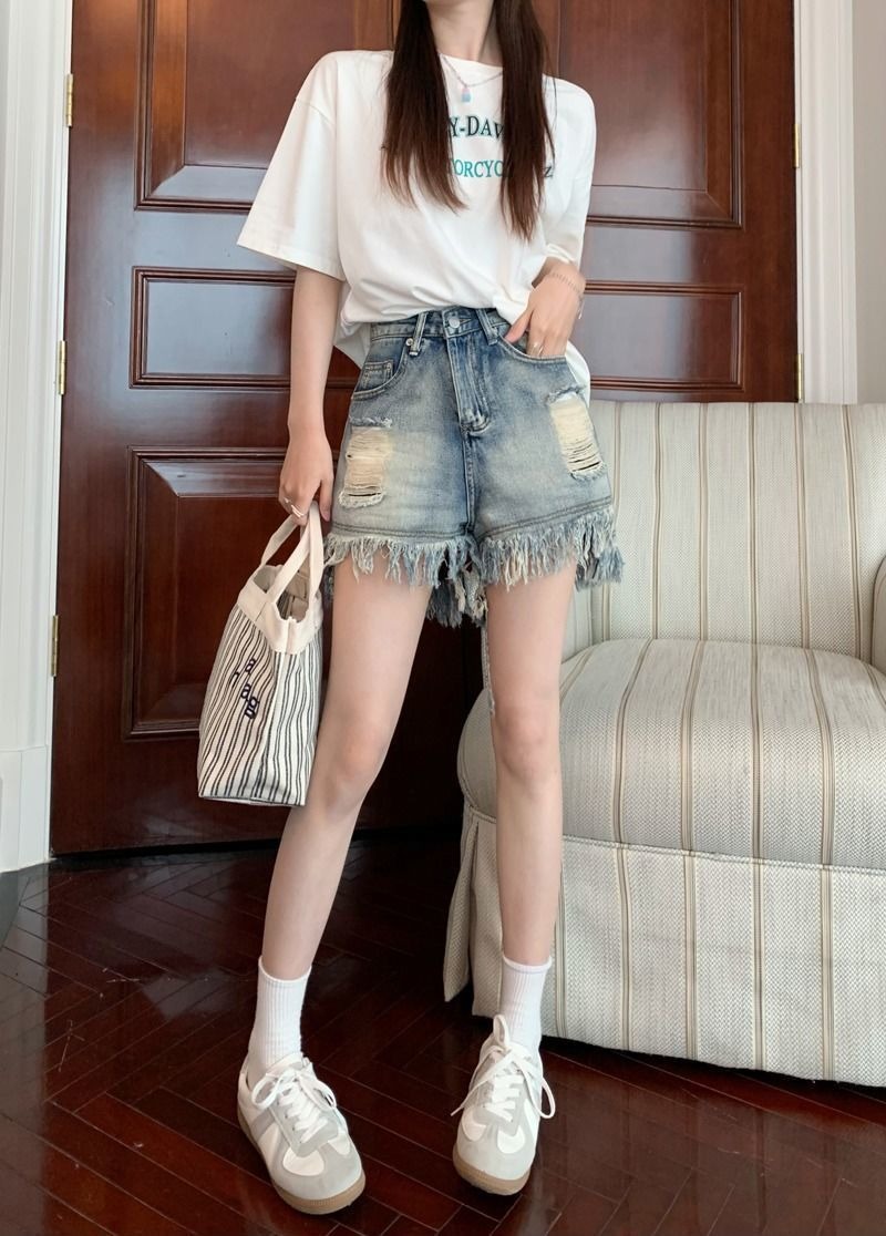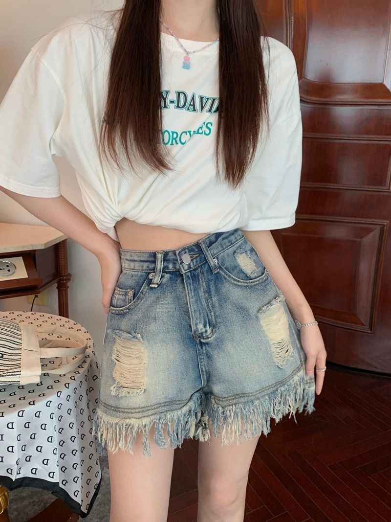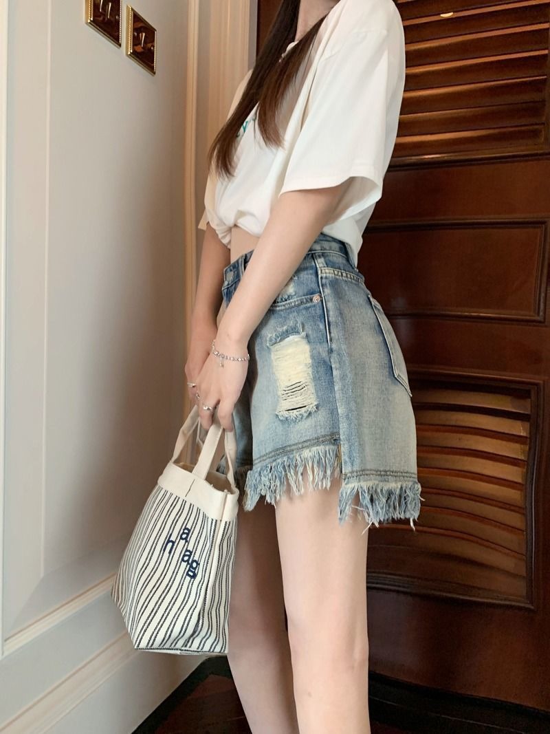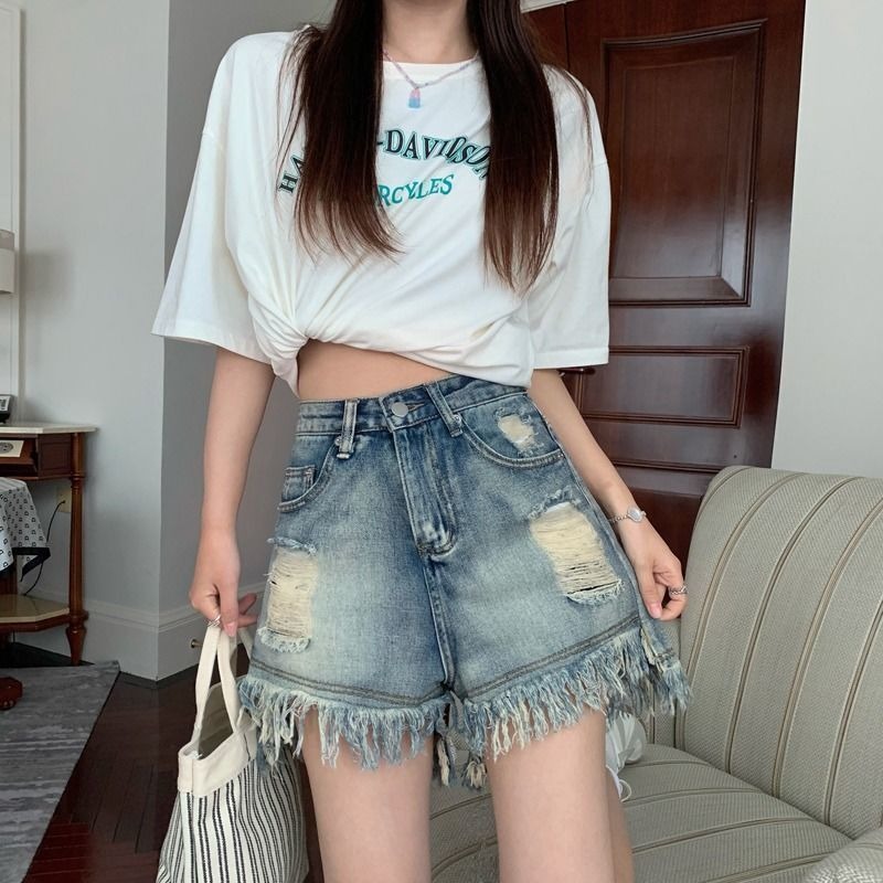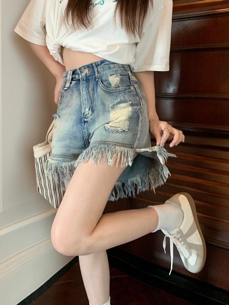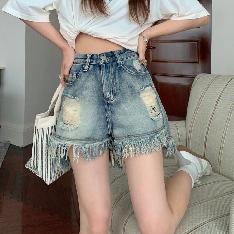 뜨거운 소녀의 찢어진 데님 반바지 여성 여름 프린지 술 A 라인 넓은 다리 느슨한 슬리밍 핫 팬츠 디자인스토어 가기