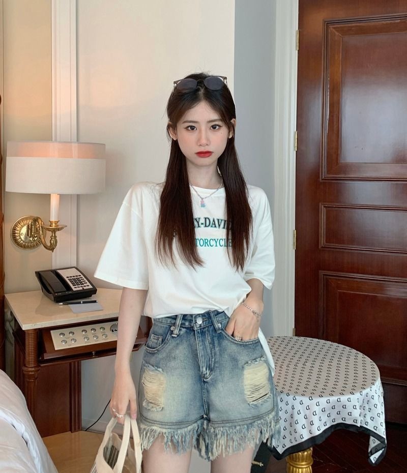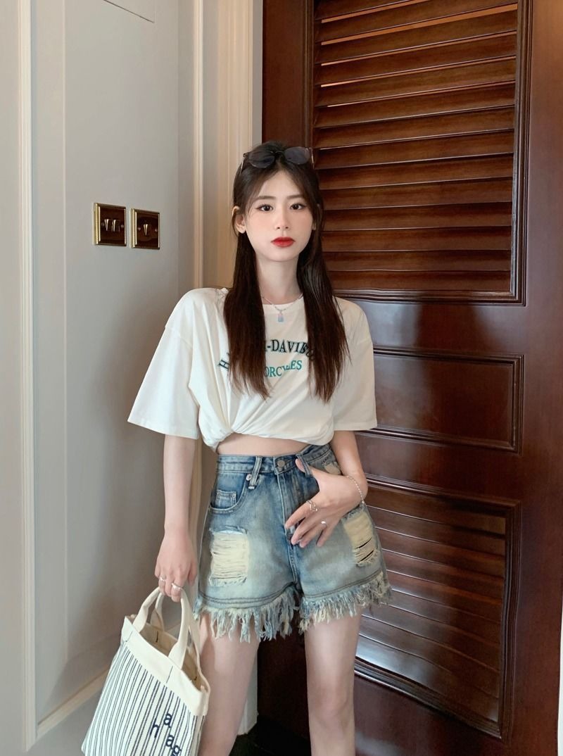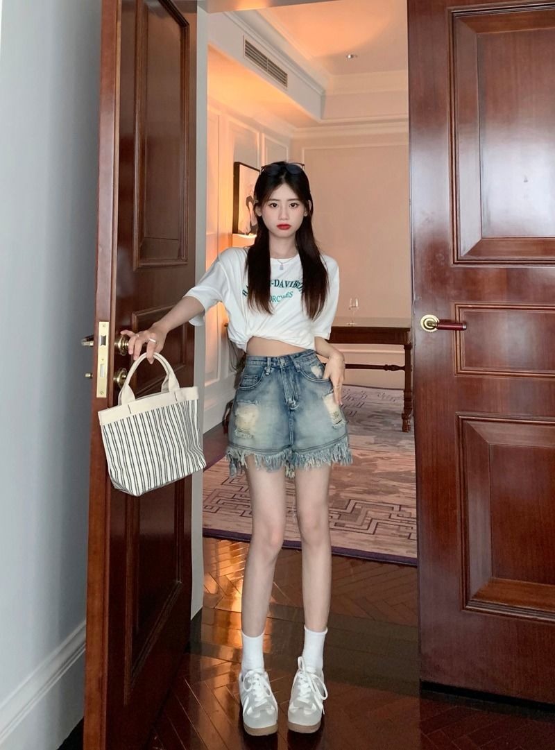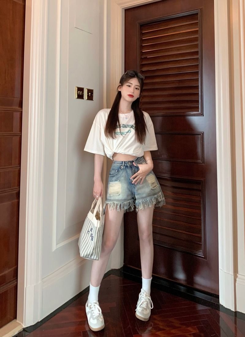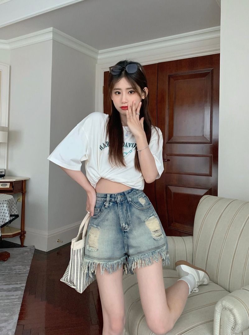 뜨거운 소녀의 찢어진 데님 반바지 여성 여름 프린지 술 A 라인 넓은 다리 느슨한 슬리밍 핫 팬츠 디자인스토어 가기