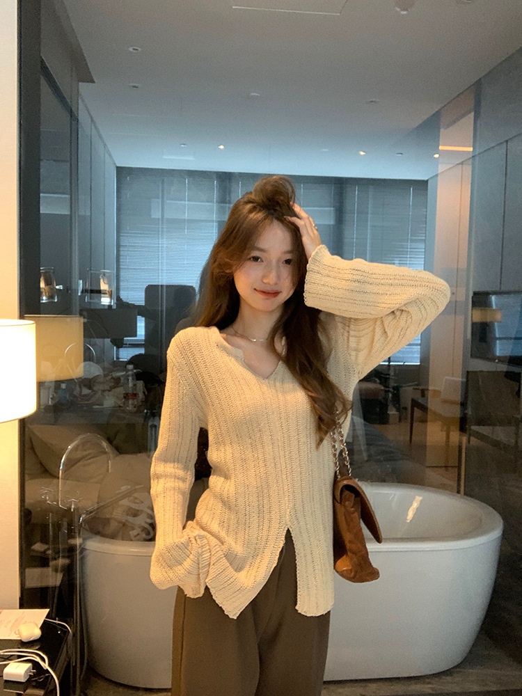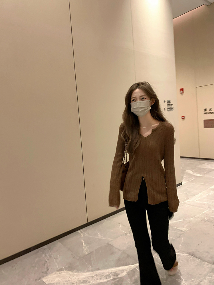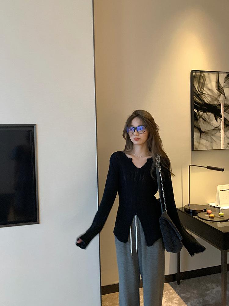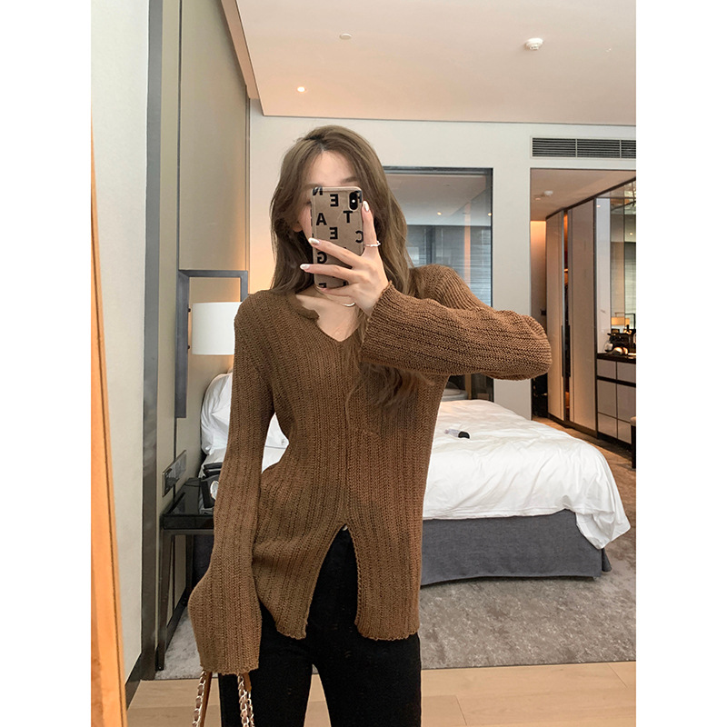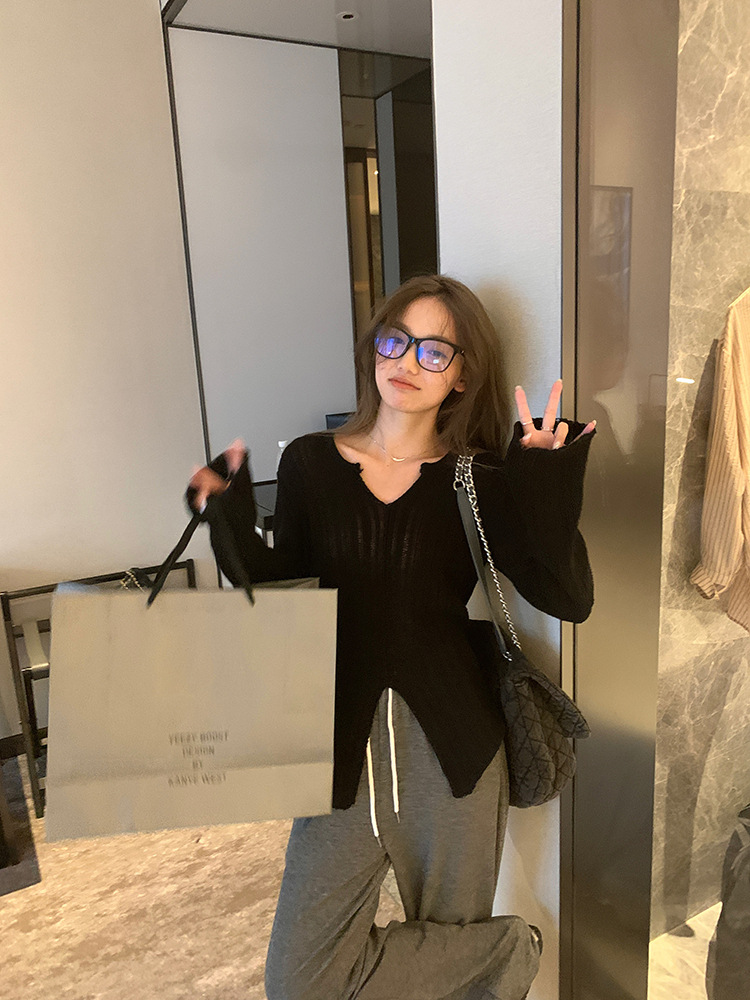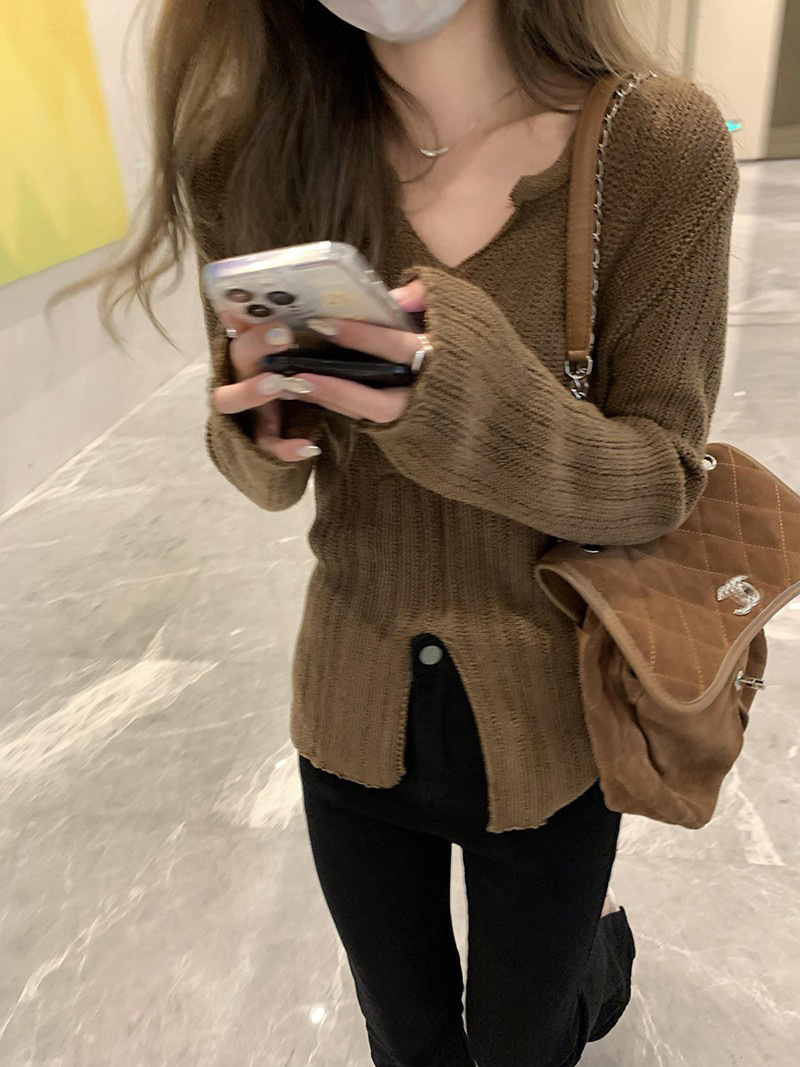 2024 가을 신상 디자인 브이넥 긴팔 여성 슬림핏 우아한 밑단 트임 다용도 캐주얼 니트 상의