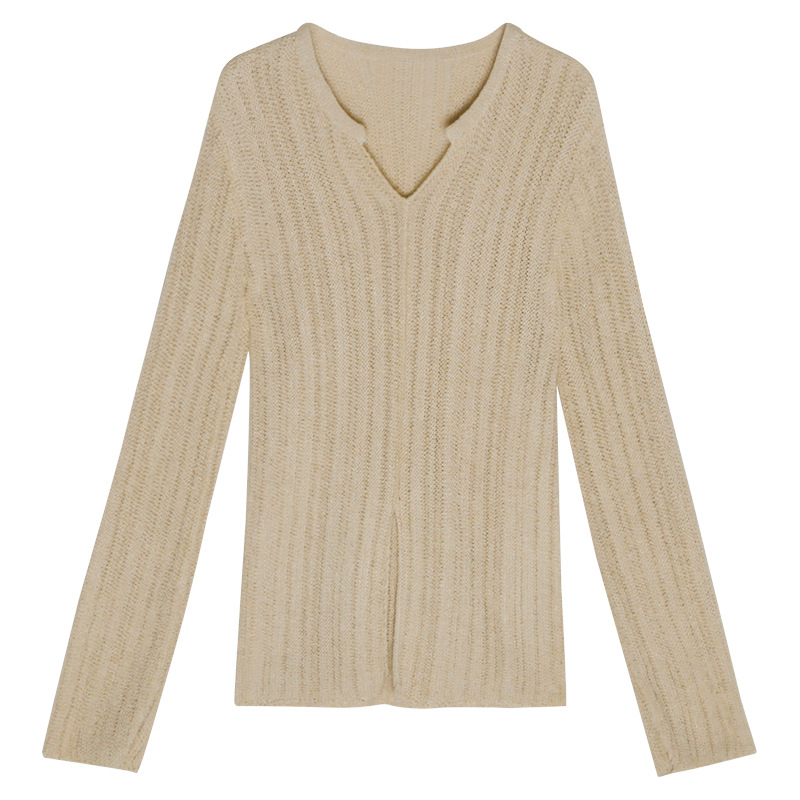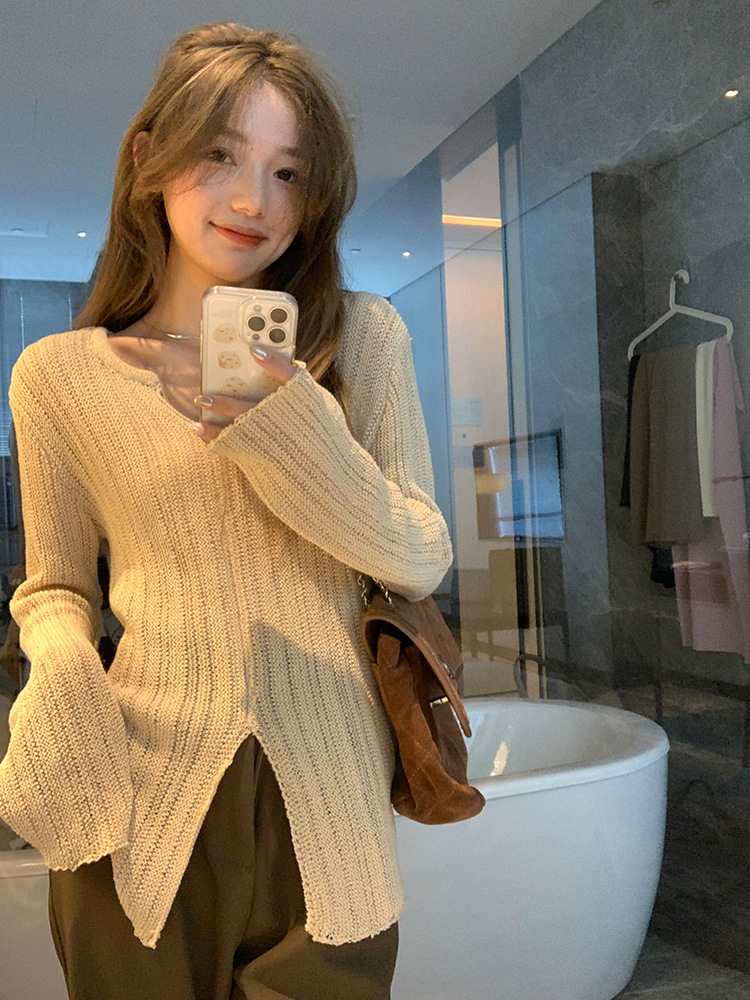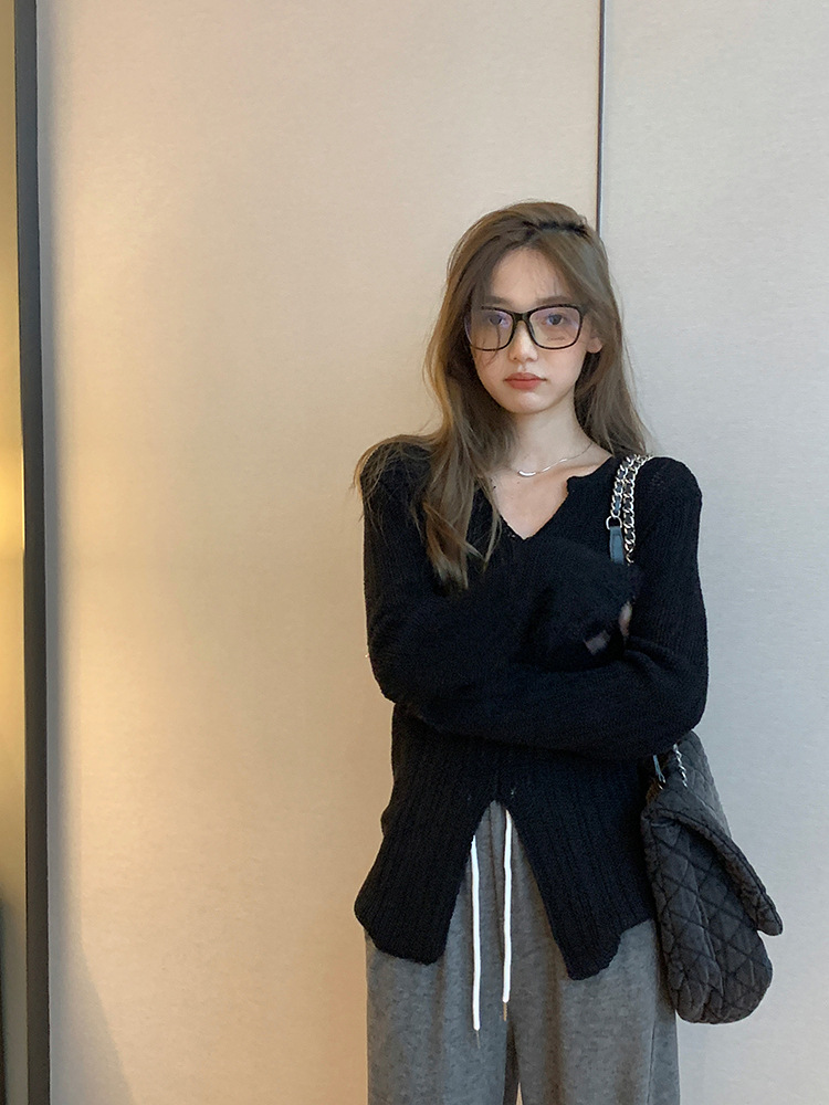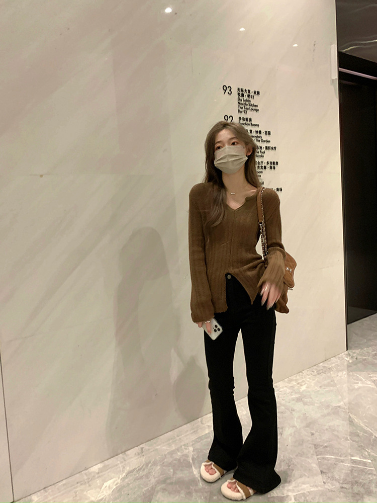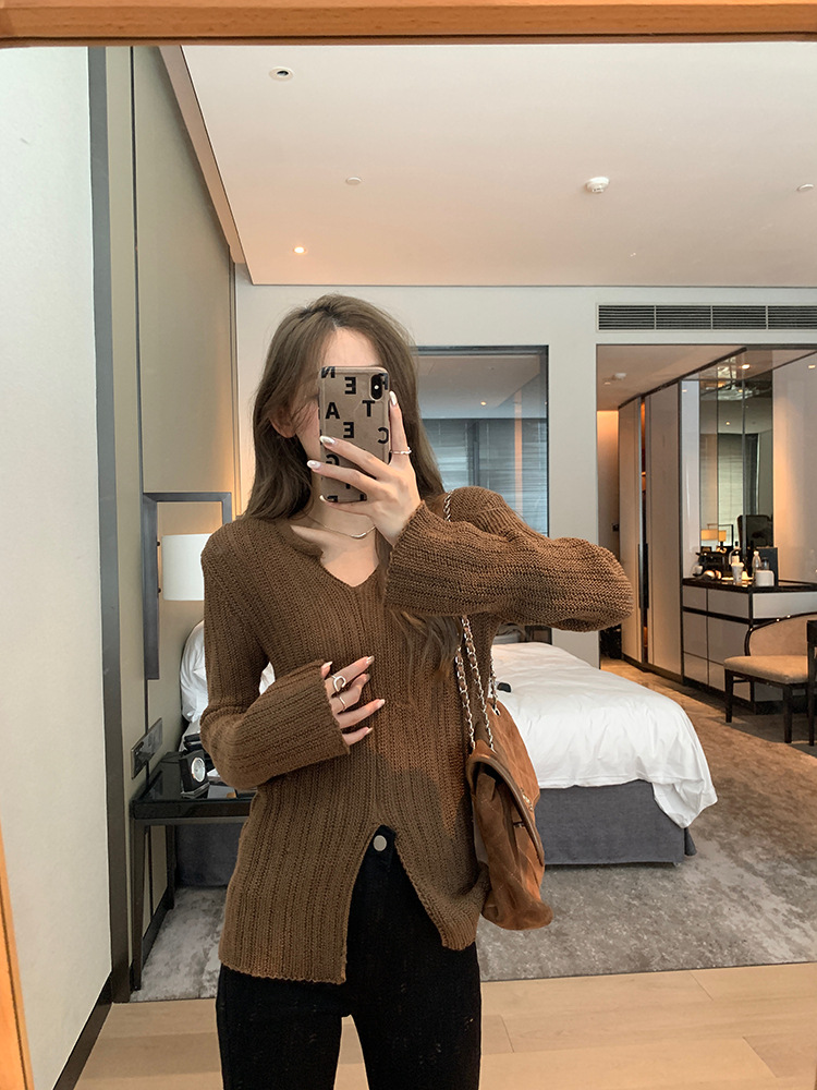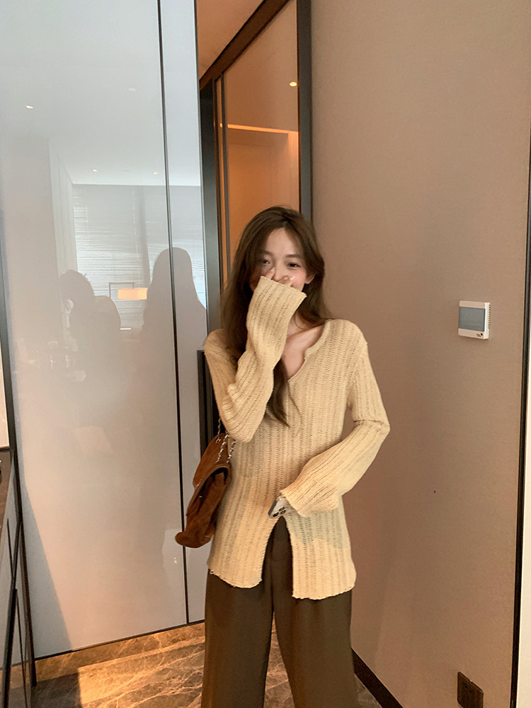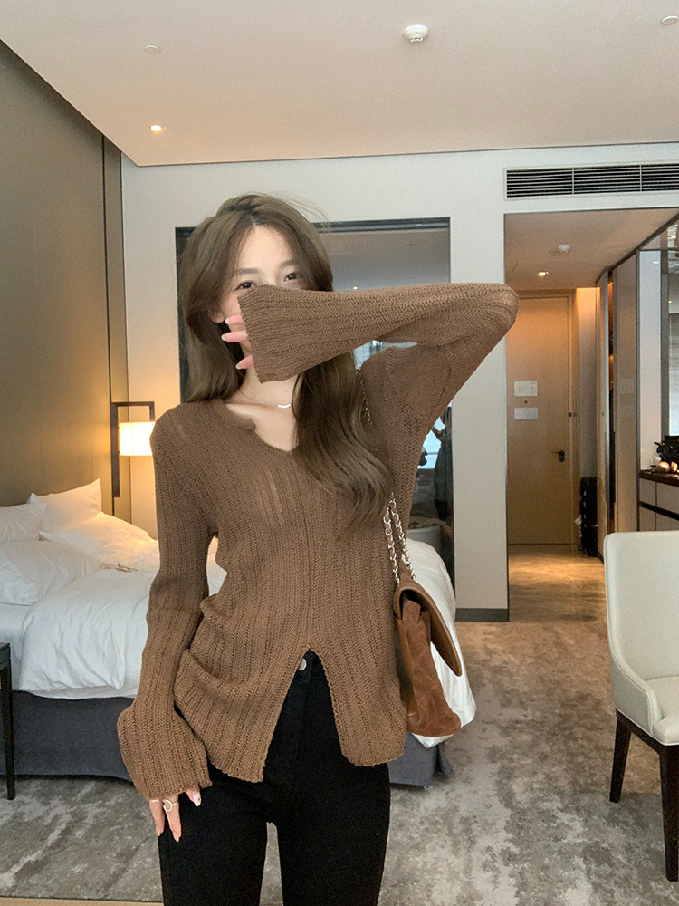 2024 가을 신상 디자인 브이넥 긴팔 여성 슬림핏 우아한 밑단 트임 다용도 캐주얼 니트 상의