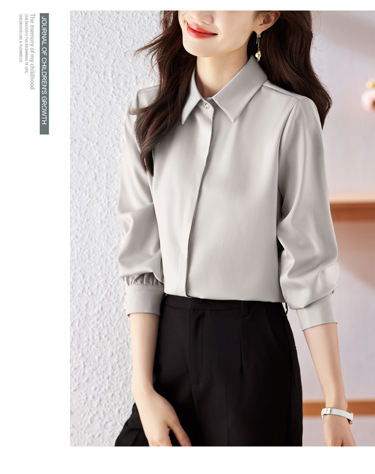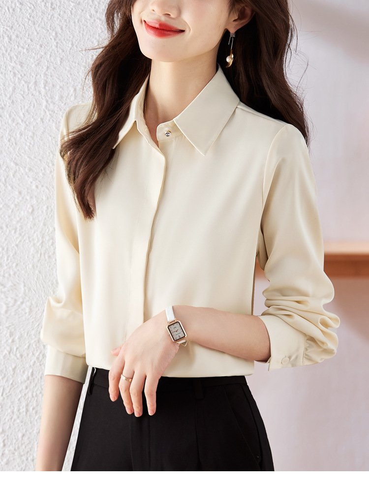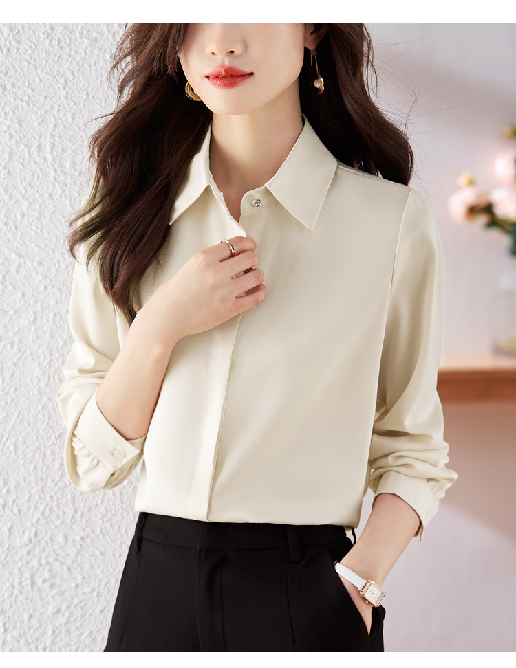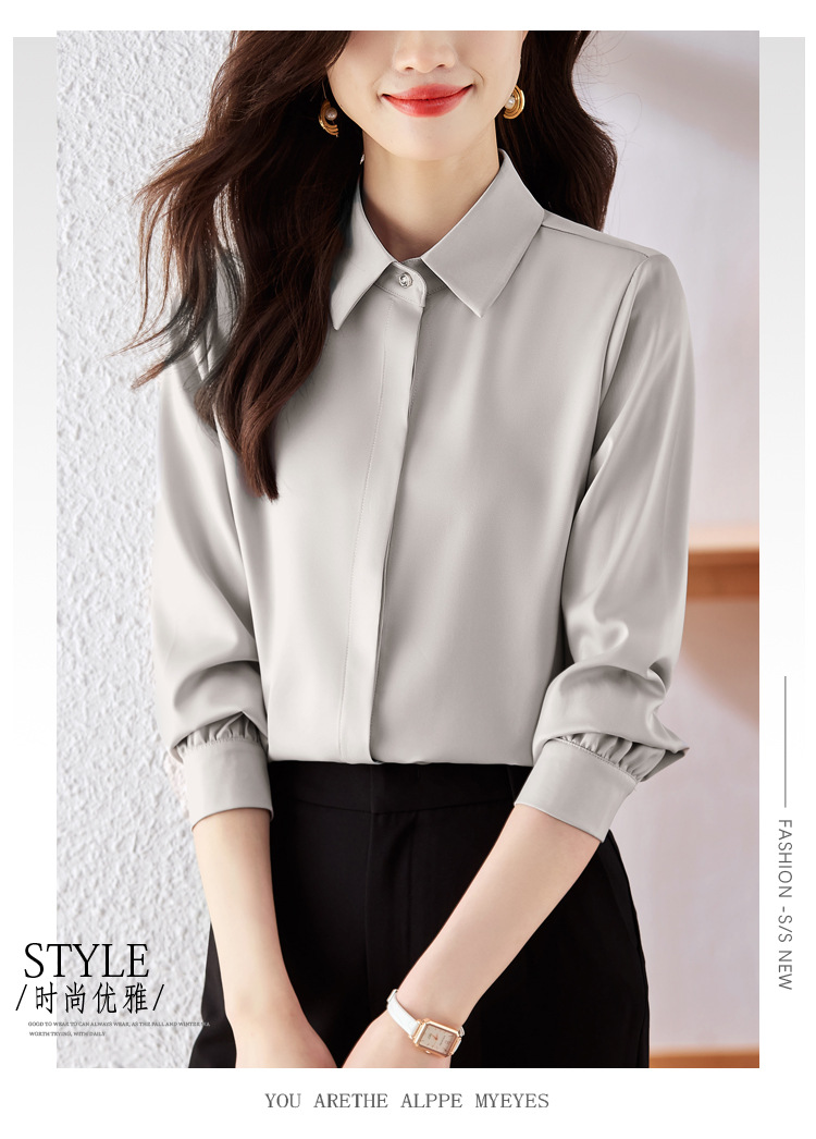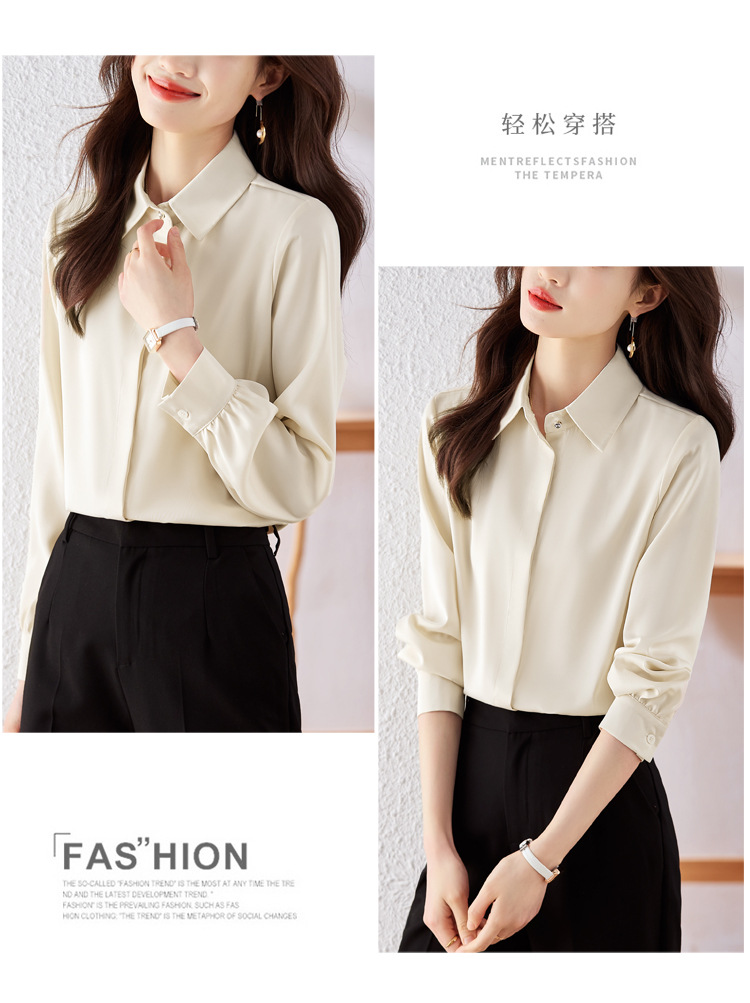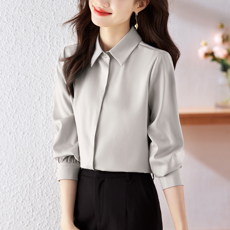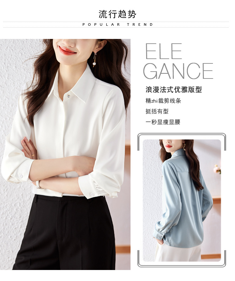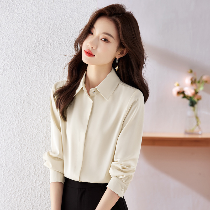 가을 2023 부드러운 흰색 긴팔 셔츠 여성용 OL 우아한 드레이핑 새틴 프렌치 셔츠 틈새 탑스토어 가기