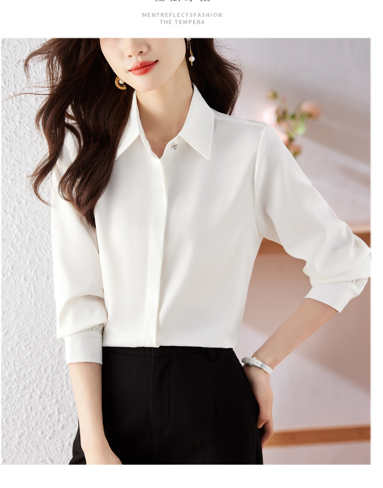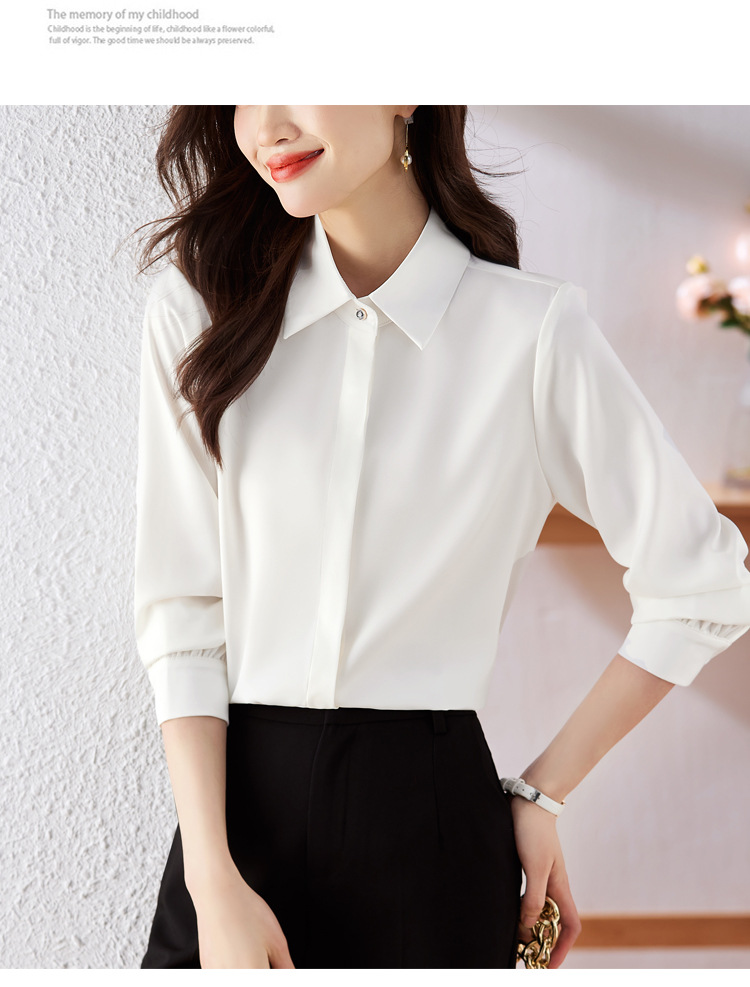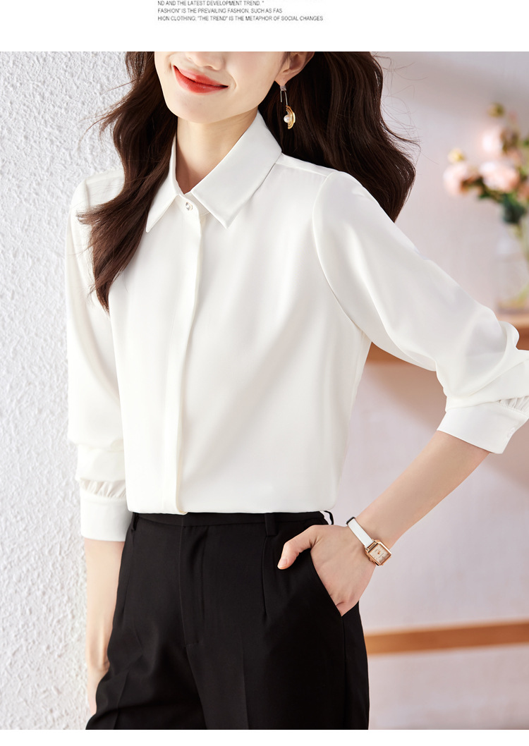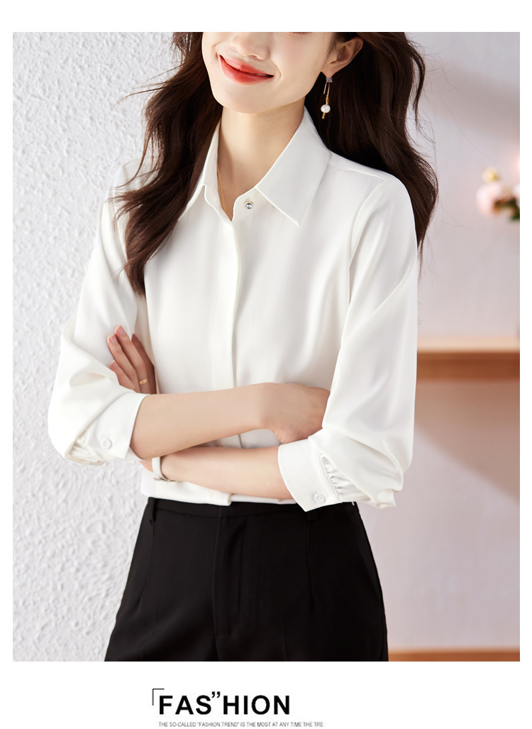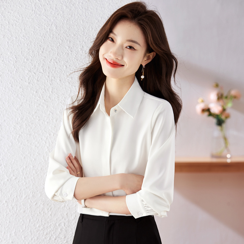 가을 2023 부드러운 흰색 긴팔 셔츠 여성용 OL 우아한 드레이핑 새틴 프렌치 셔츠 틈새 탑