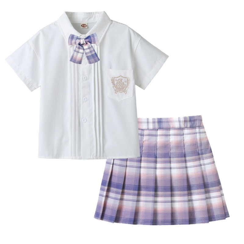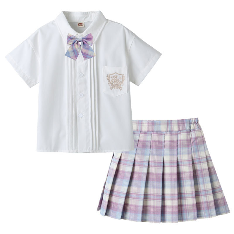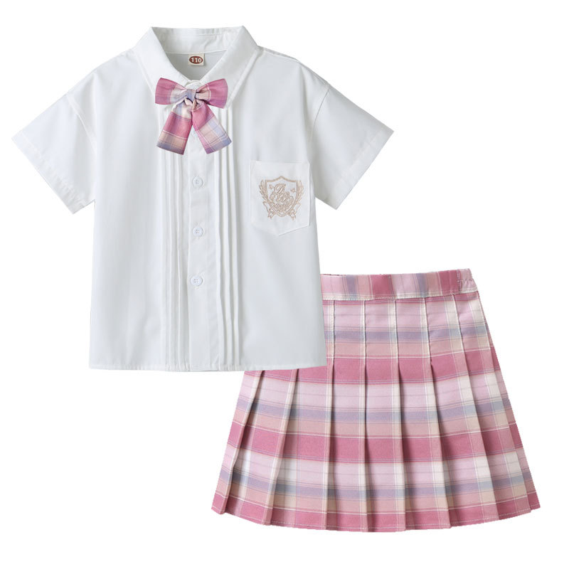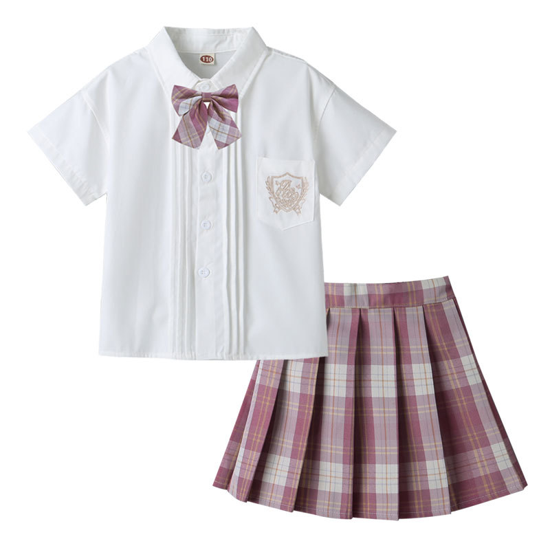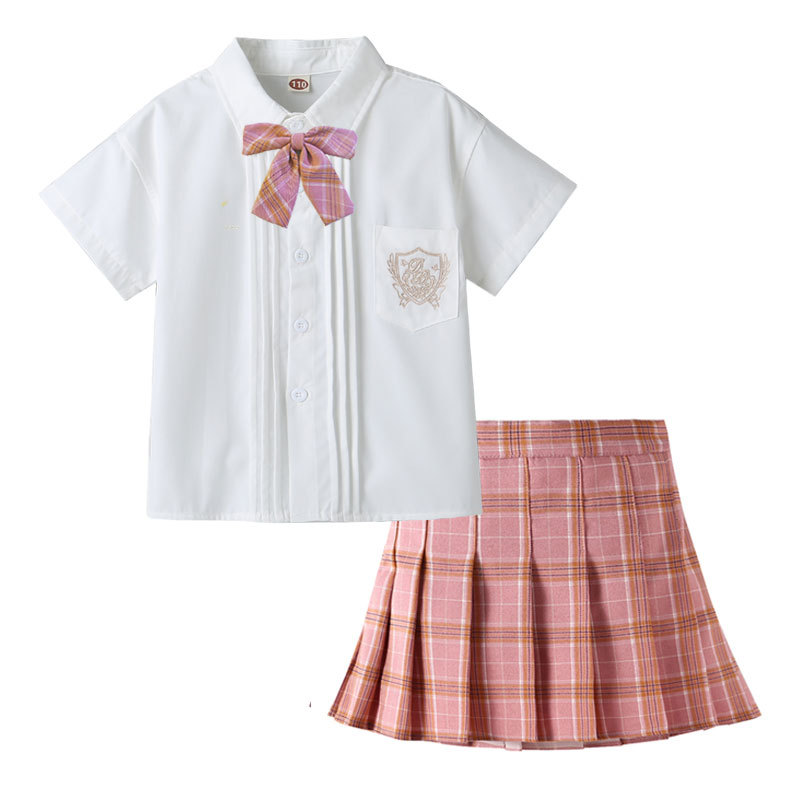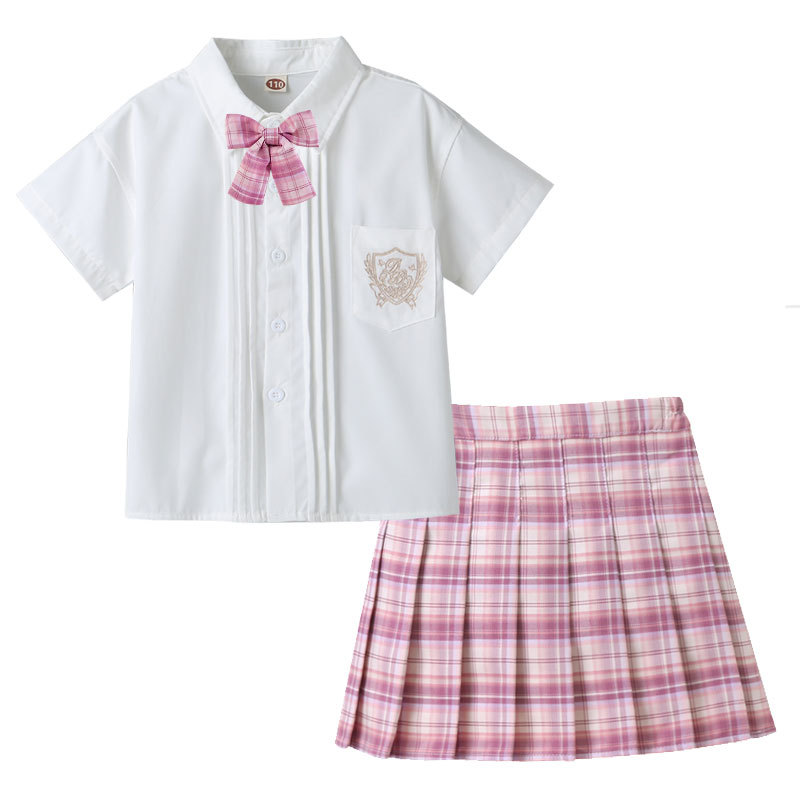 • Jk 뾰족한 칼라 반팔 셔츠 + 나비 넥타이가없는 담홍색 체크 무늬 스커트