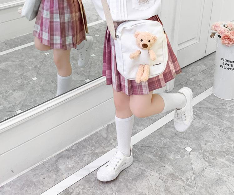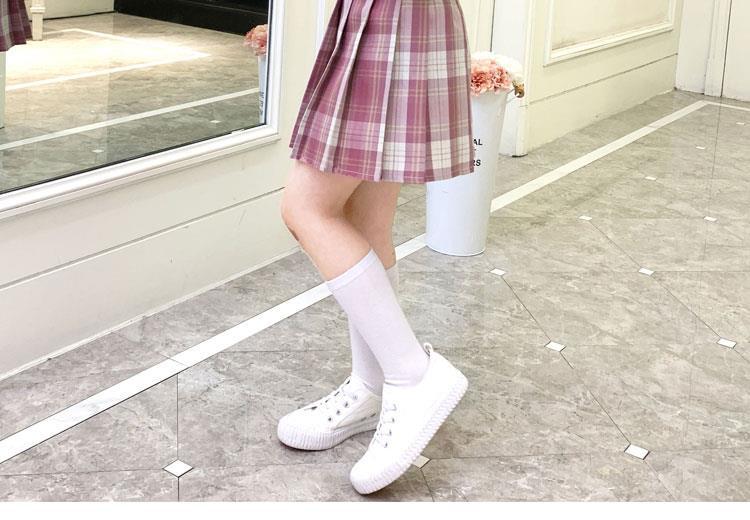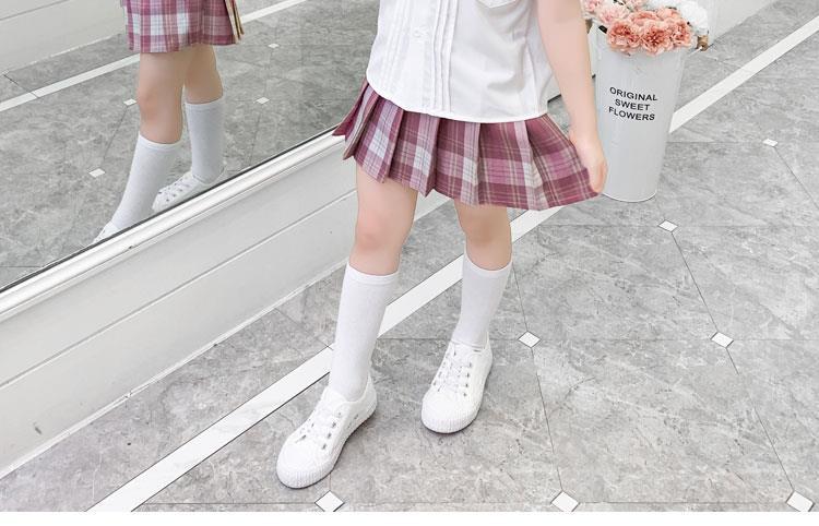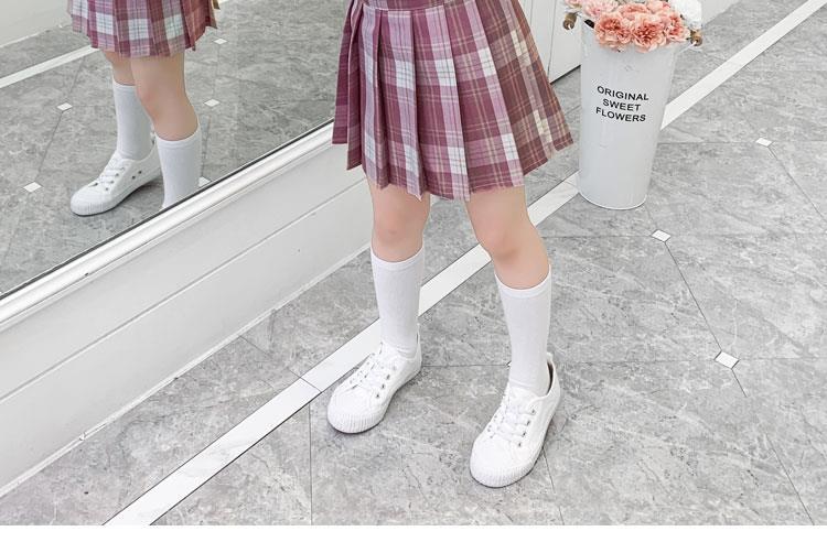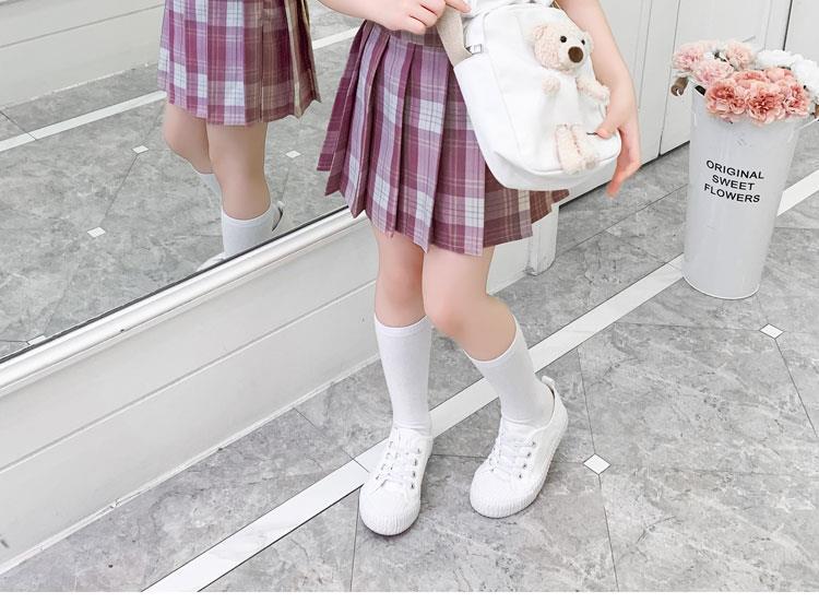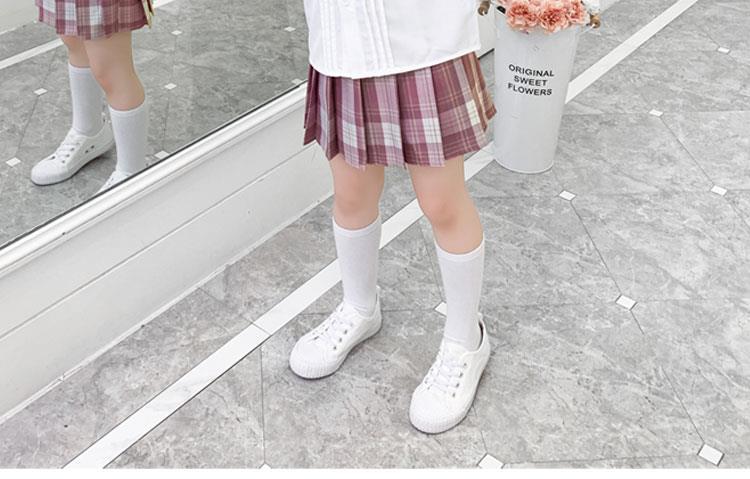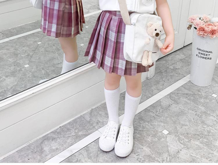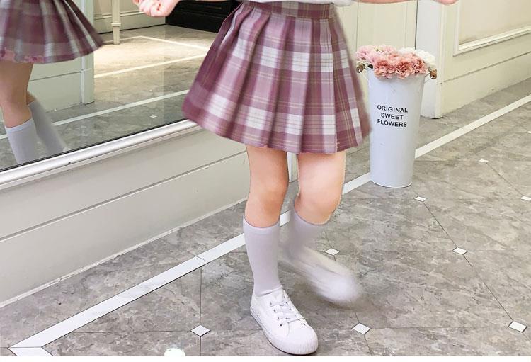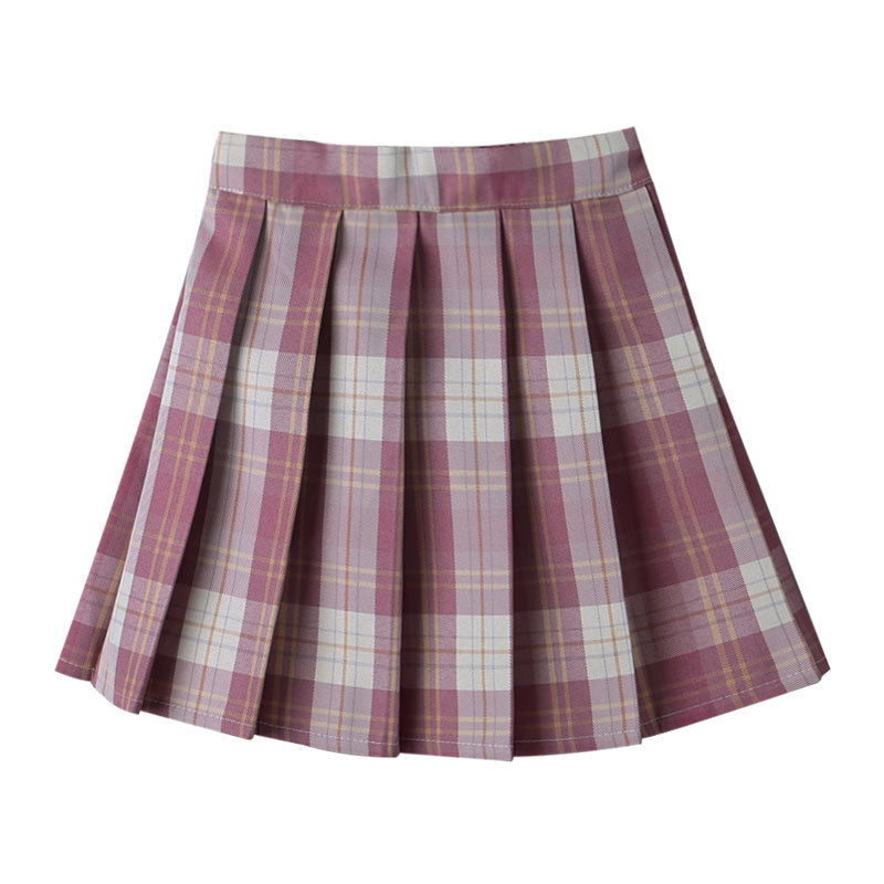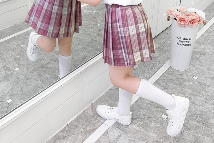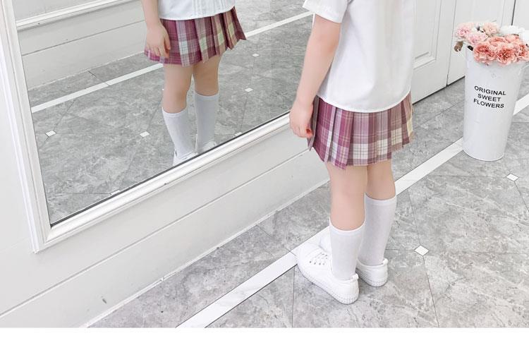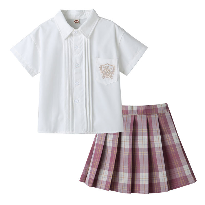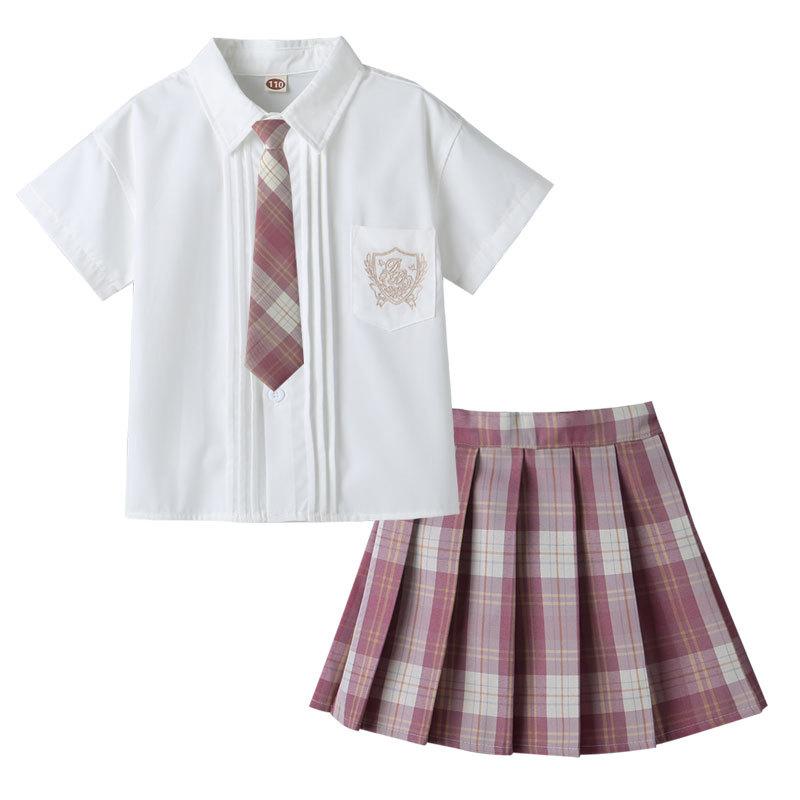 • Jk 뾰족한 칼라 반팔 셔츠 + 담홍색 격자 무늬 넥타이 담홍색 격자 무늬 치마