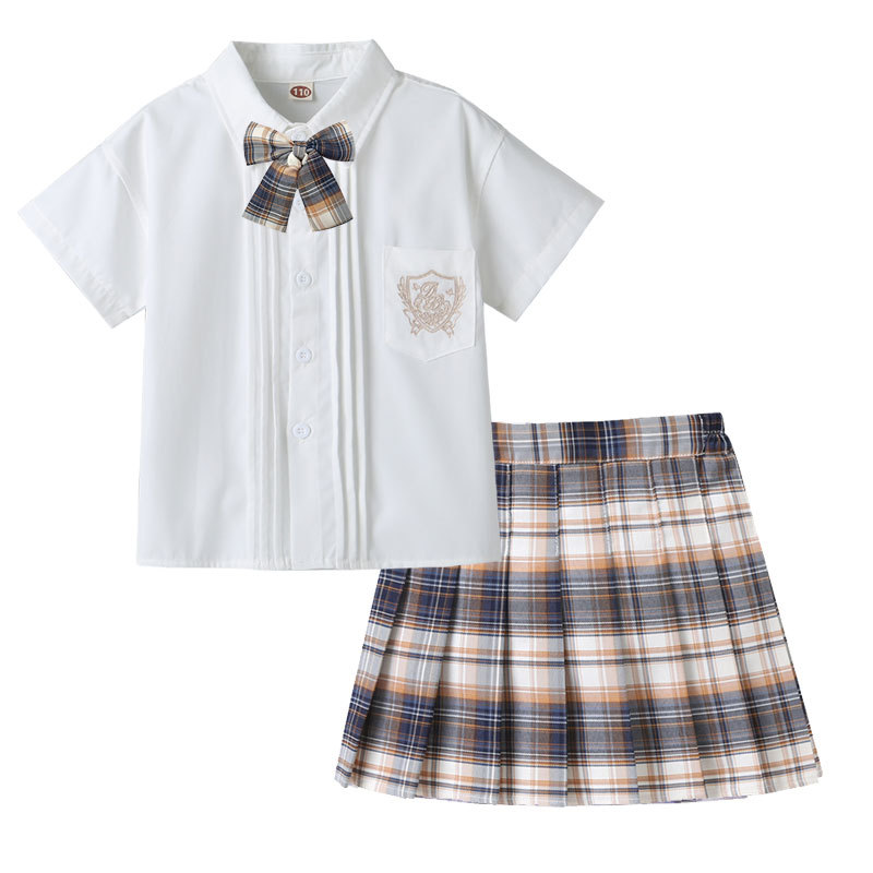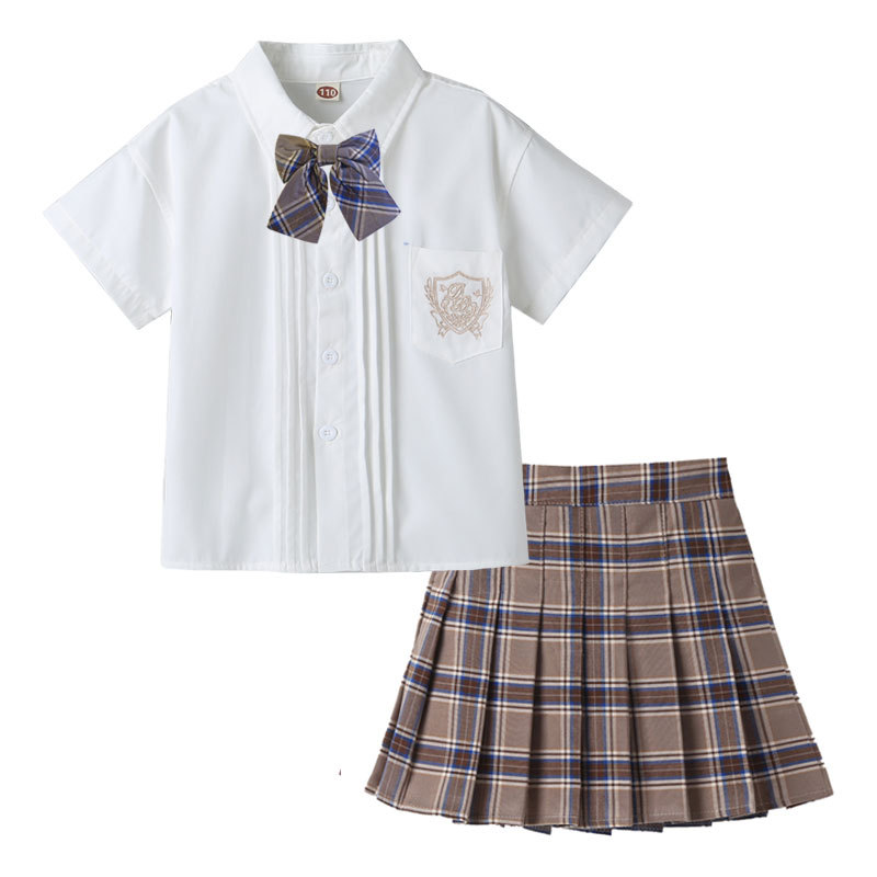 • Jk 뾰족한 칼라 반팔 셔츠 + 다크 브라운 격자 무늬 오버 스커트 다크 브라운 격자 무늬 나비 넥타이