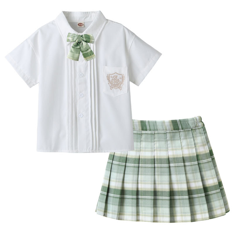 • Jk 뾰족한 칼라 반팔 셔츠 + 라이트 그린 흰색 오버 스커트 라이트 그린 흰색 넥타이