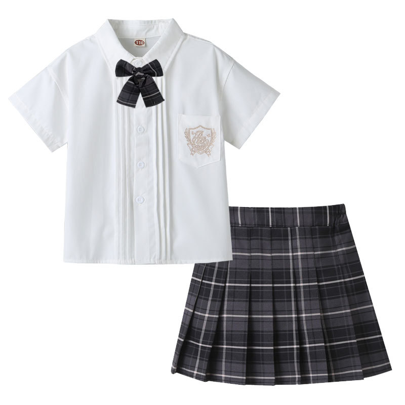 • Jk 뾰족한 칼라 반팔 셔츠 + 딥 블랙 그레이 오버 스커트 딥 블랙 그레이 나비 넥타이