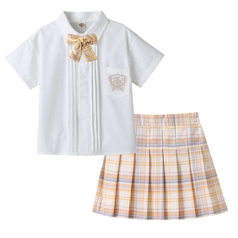 • Jk 뾰족한 칼라 반팔 셔츠 + 노란색과 흰색 파란색 격자 오버 스커트 노란색과 흰색 파란색 격자 나비 넥타이
