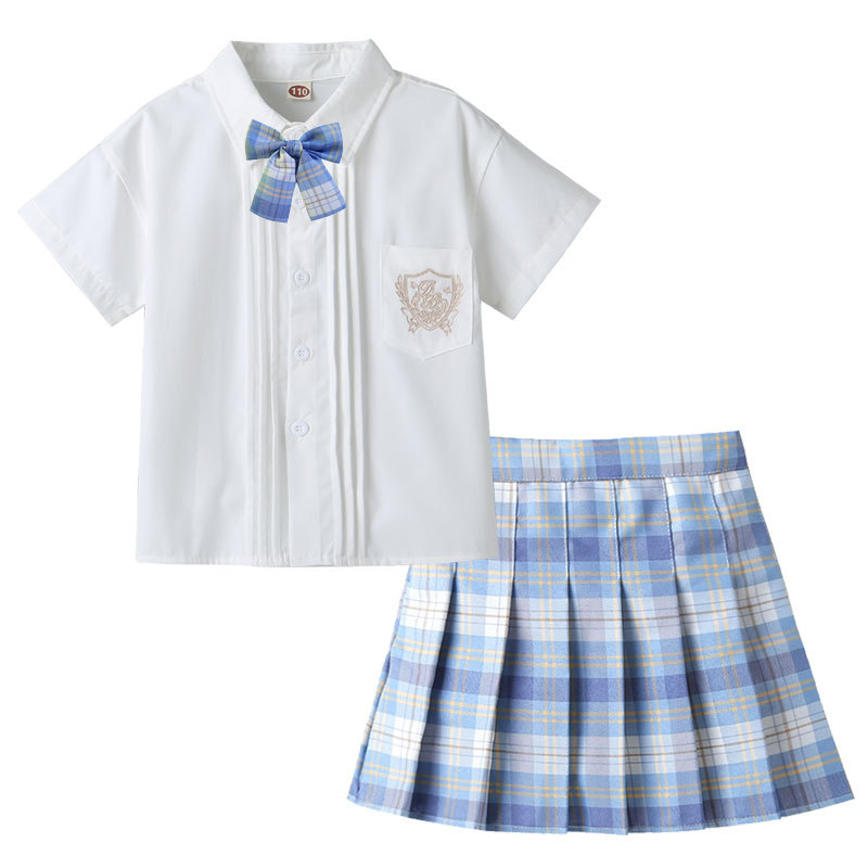 • Jk 뾰족한 칼라 반팔 셔츠 + 하늘색 격자 무늬 오버 스커트 하늘색 격자 무늬 나비 넥타이