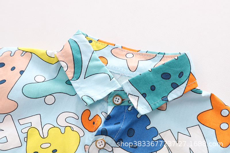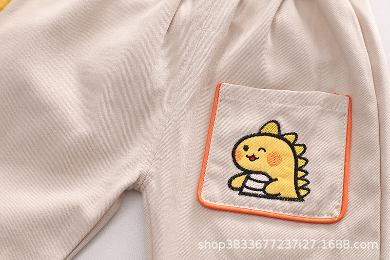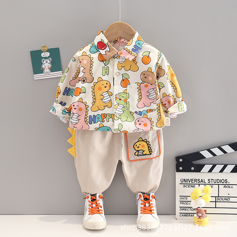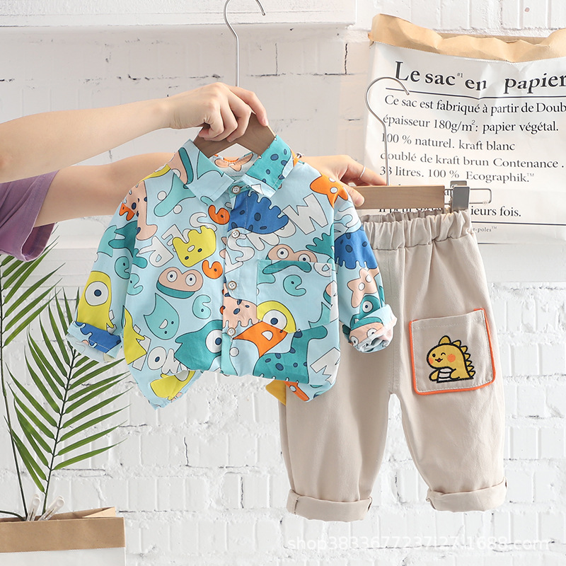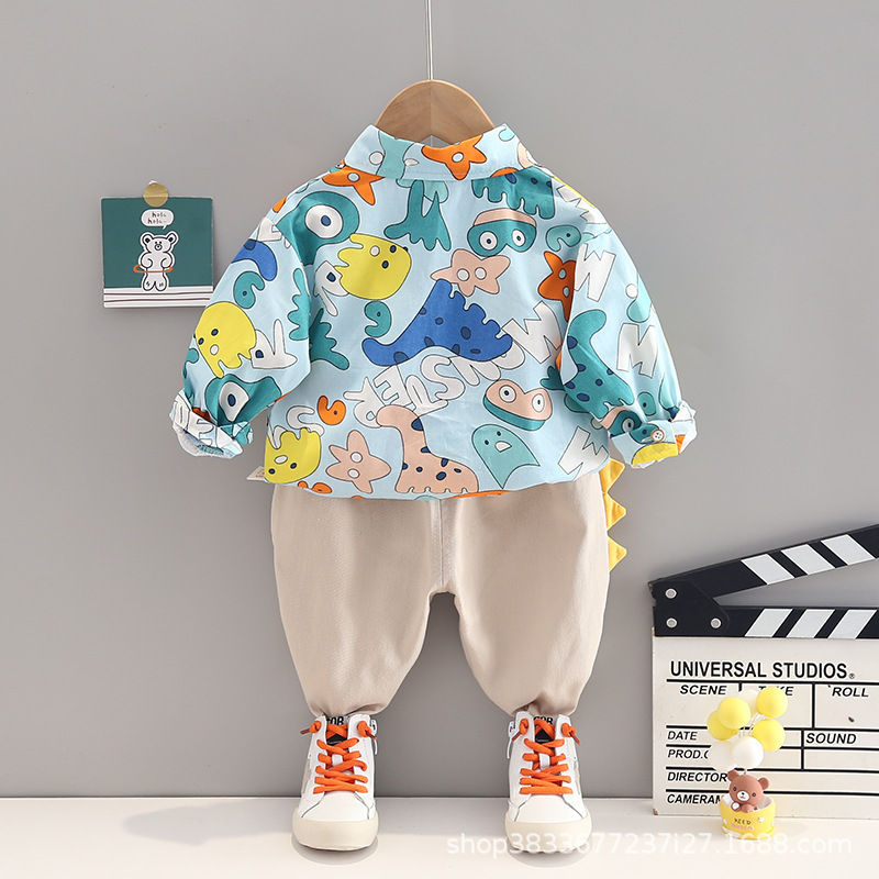 2023 가을 새 소년 만화 공룡 셔츠 긴 소매 세트 소년 캐주얼 바지 투피스 도매스토어 가기