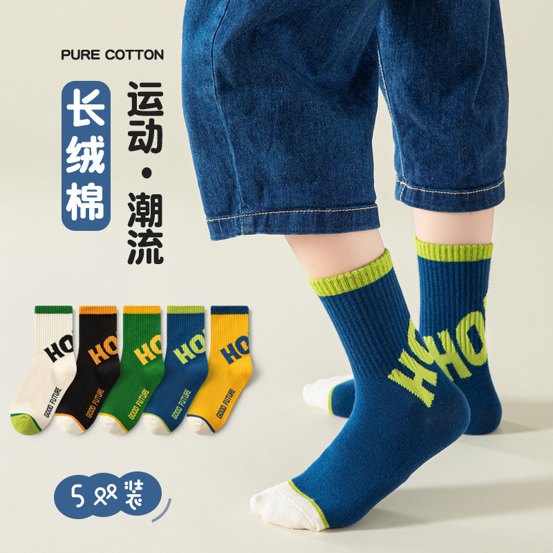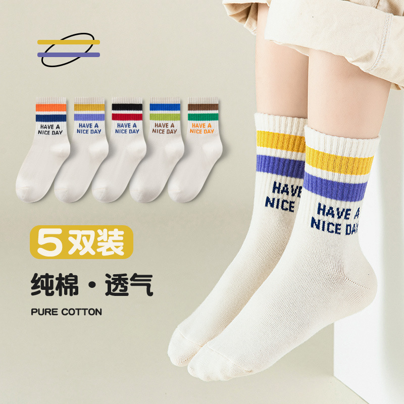 【5켤레】어린이 양말 봄 가을 스포츠 스타일 A급 면 양말 학생 양말 가을 겨울 중간 길이 도매 및 배송
