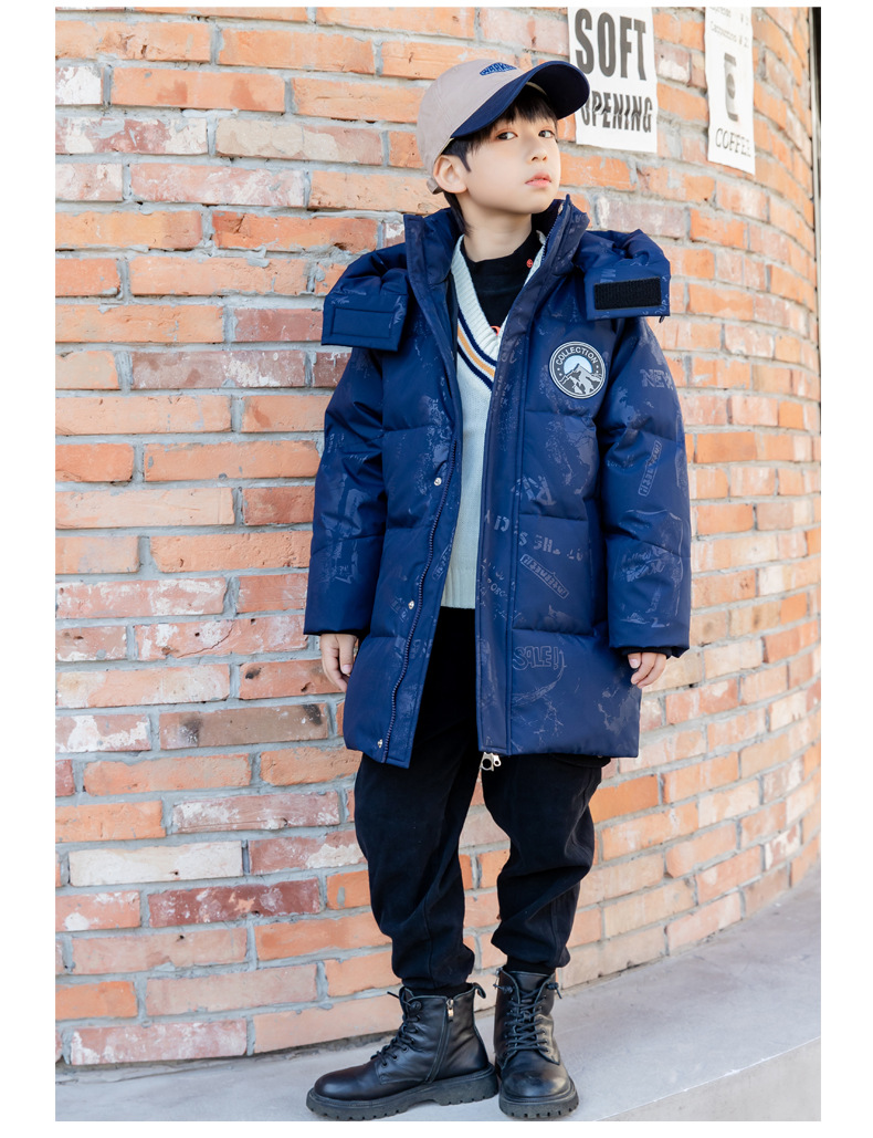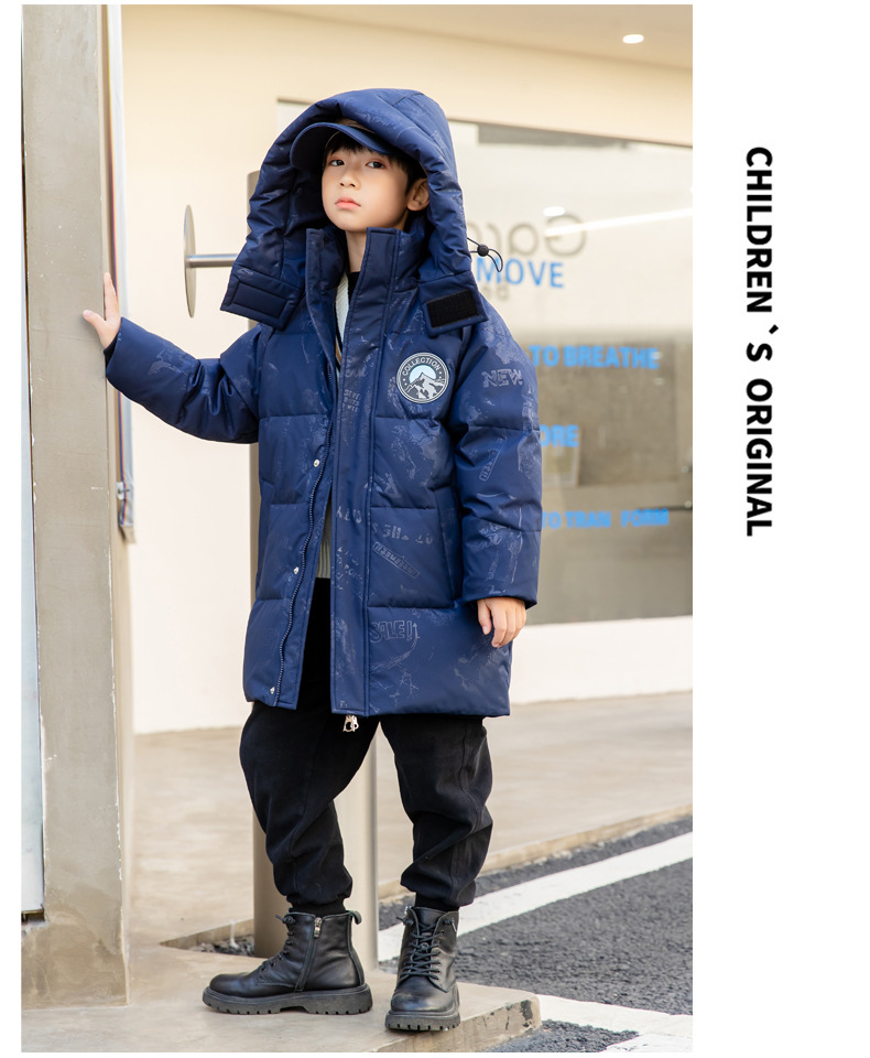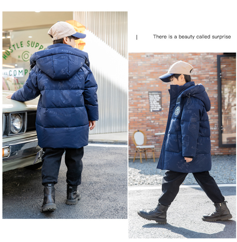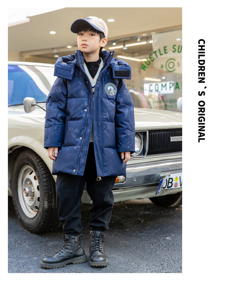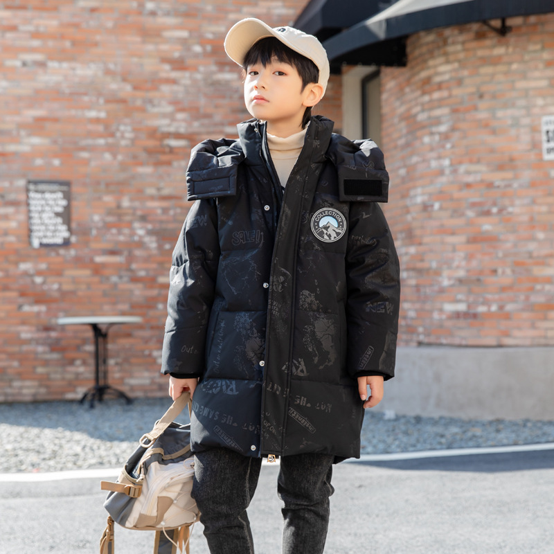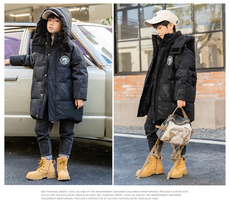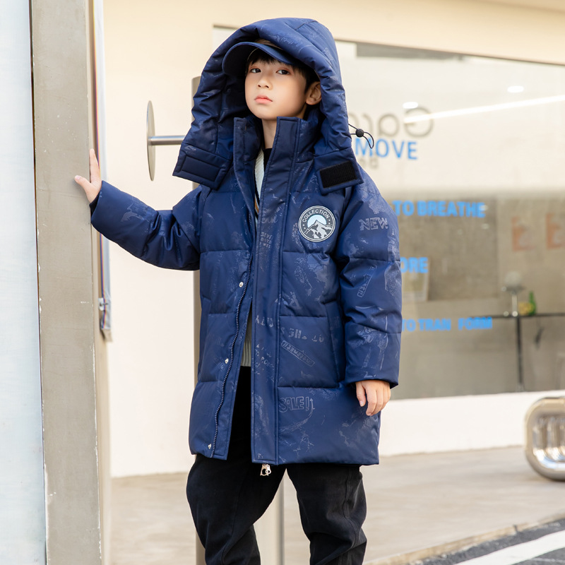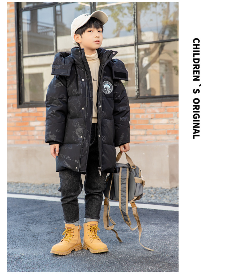 2023 새로운 서양 스타일 발라 어린이 다운 재킷 남아 중간 및 큰 어린이 긴 겨울 옷 아기 두꺼운 위장 재킷