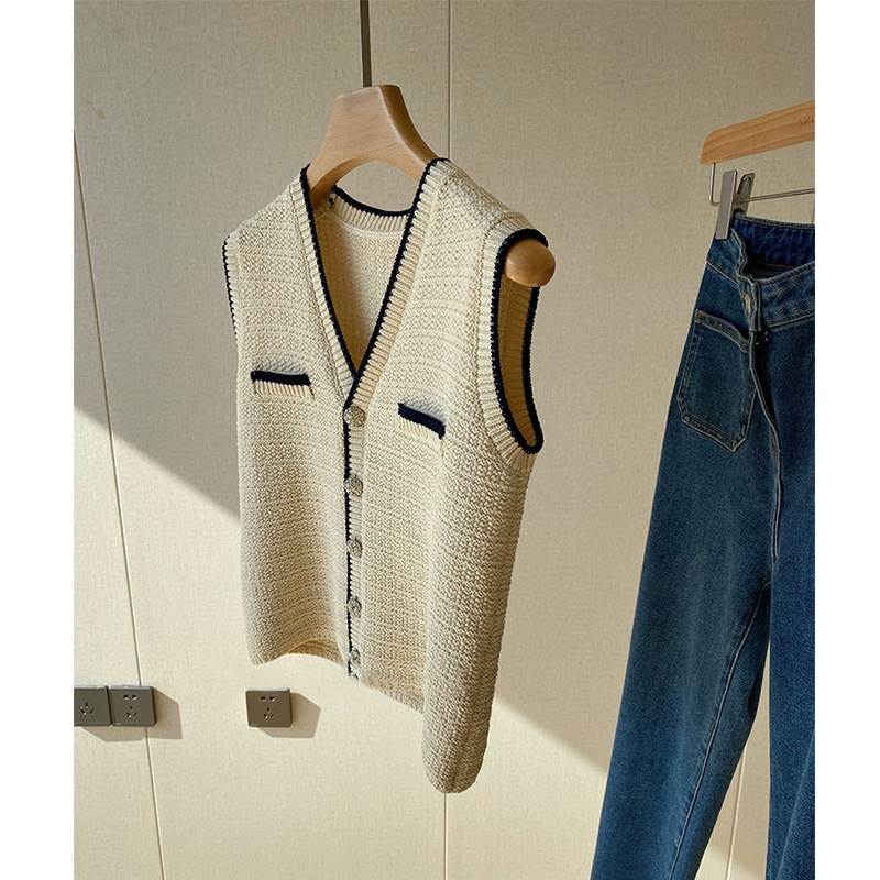 올매치 Xiangfeng ~ 프랑스 레트로 브이넥 중공업 컬러 대비 꽃 고급 니트 조끼 여성 봄과 가을