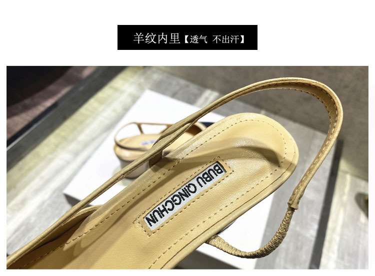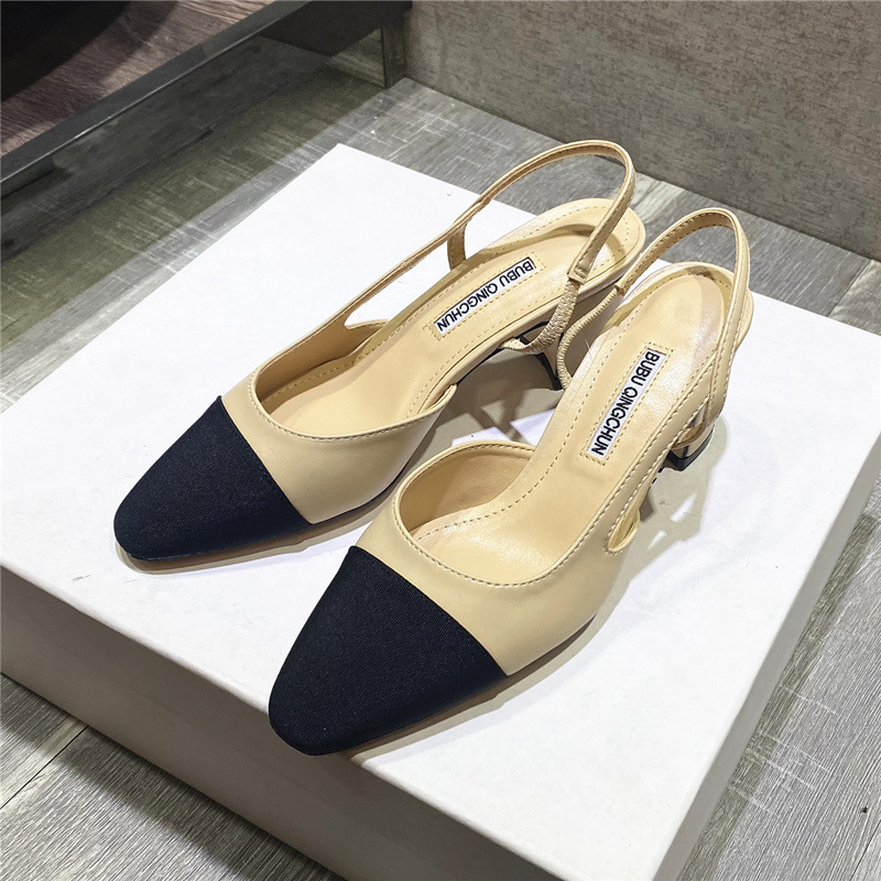 여름용 여성용 샤오샹풍 샌들, 미들힐, 천연 가죽, 뒷부분 오픈, 컬러 블록, 프렌치 스타일, 두꺼운 굽, 하이힐, 스틸레토, 다용도스토어 가기