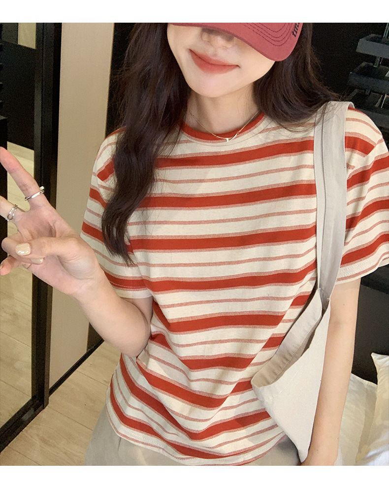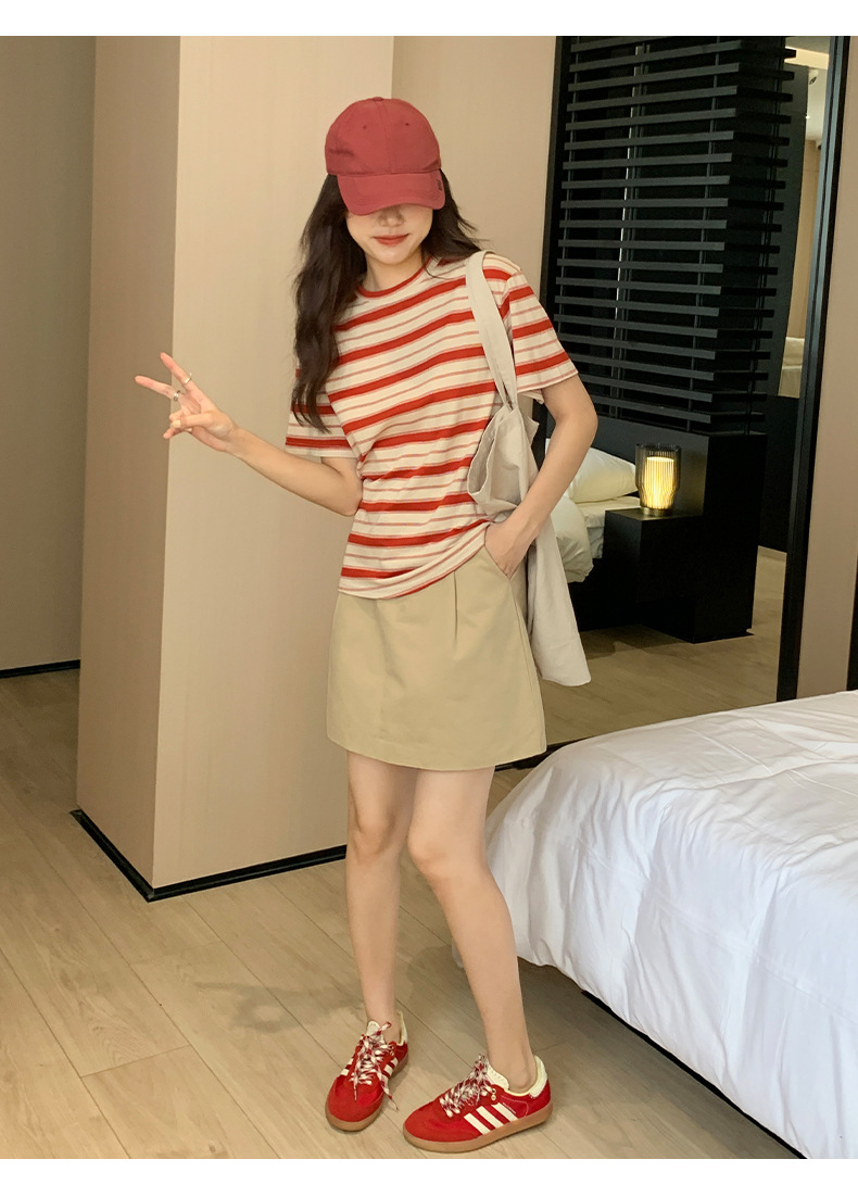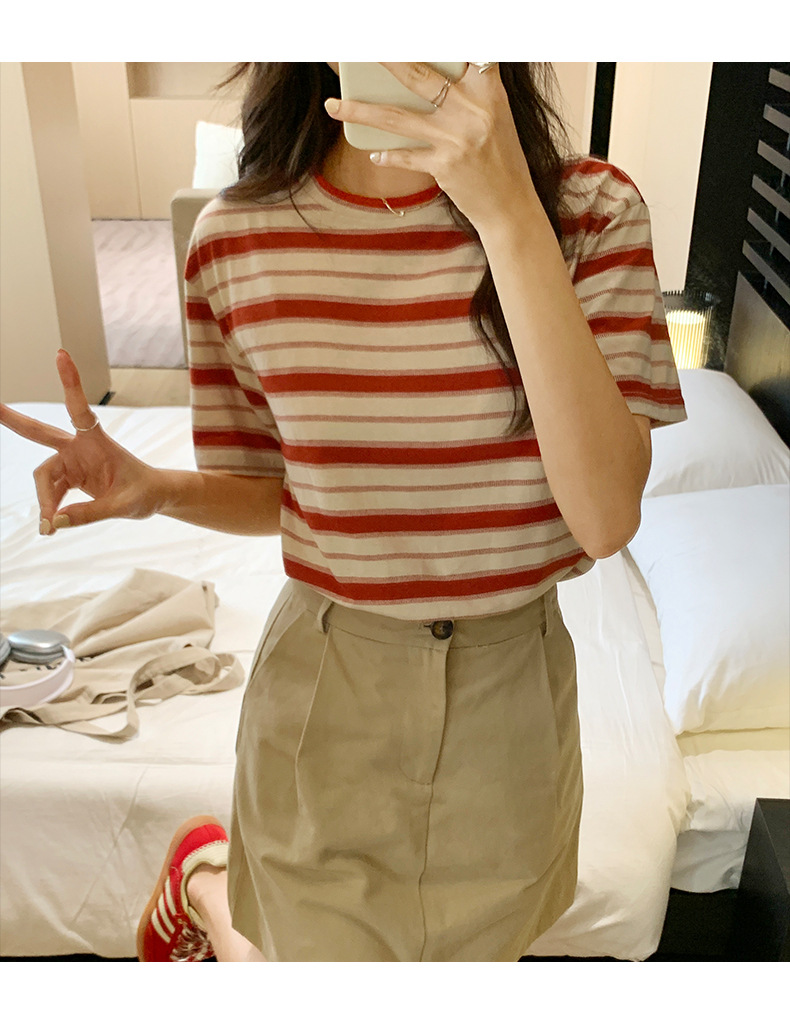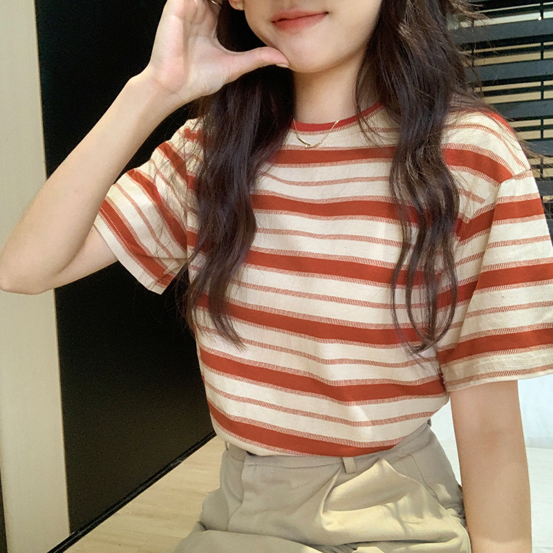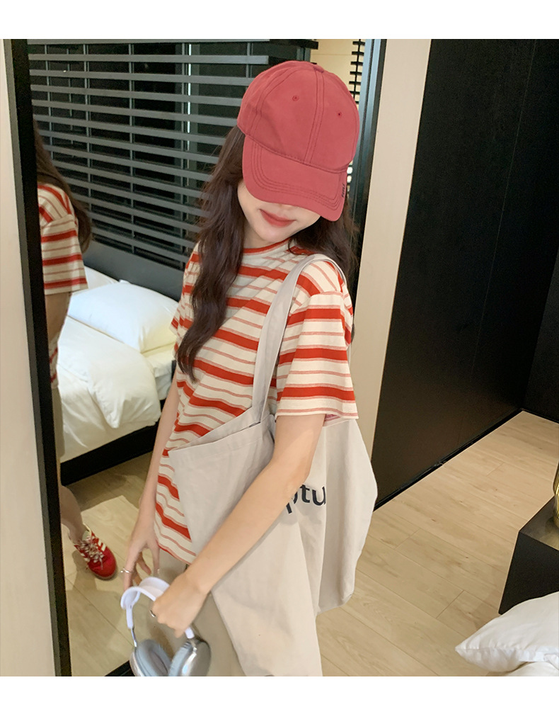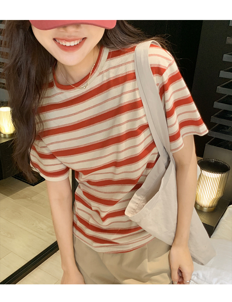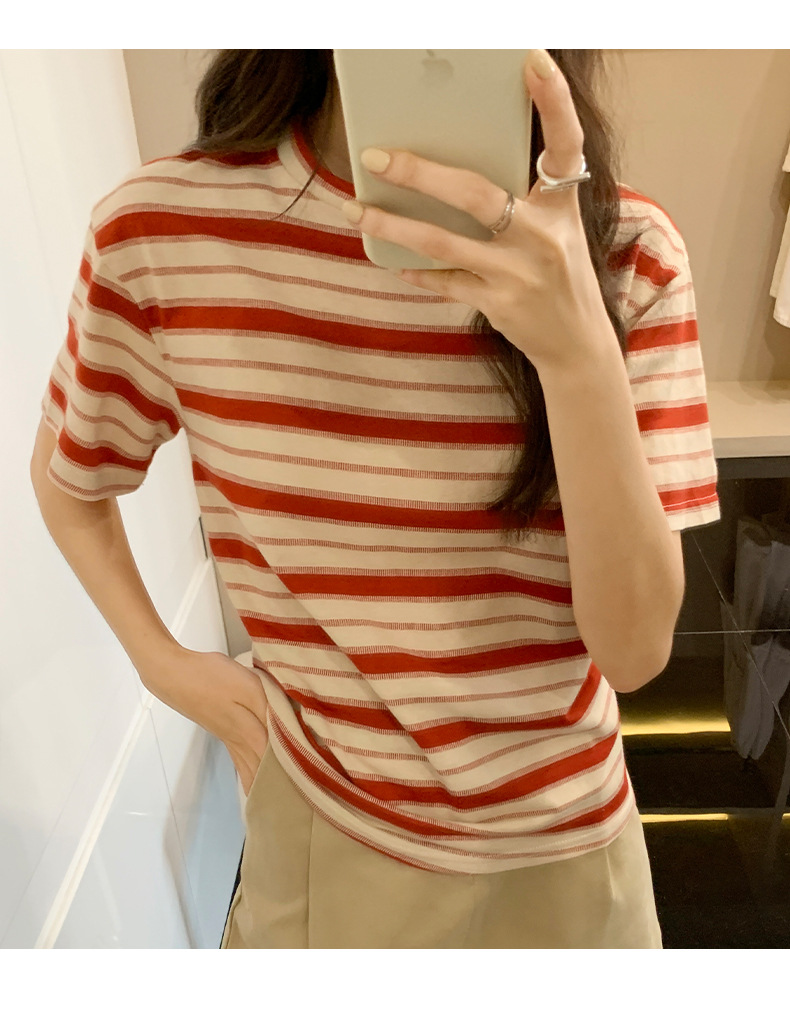 레드 스트라이프 숄더 반팔 티셔츠 여성용 여름 새로운 한국식 슬리밍 대비 컬러 연령 감소 대학식 올매치 탑스토어 가기