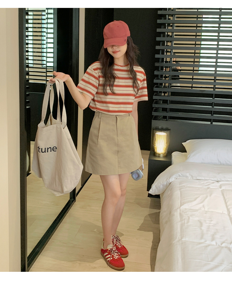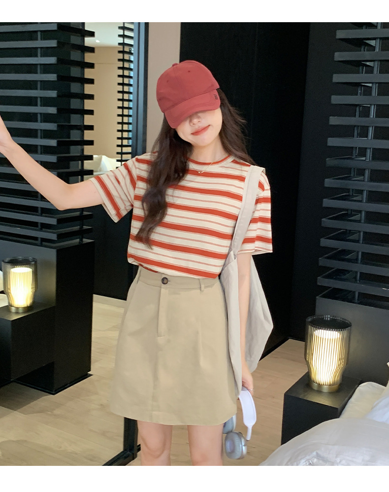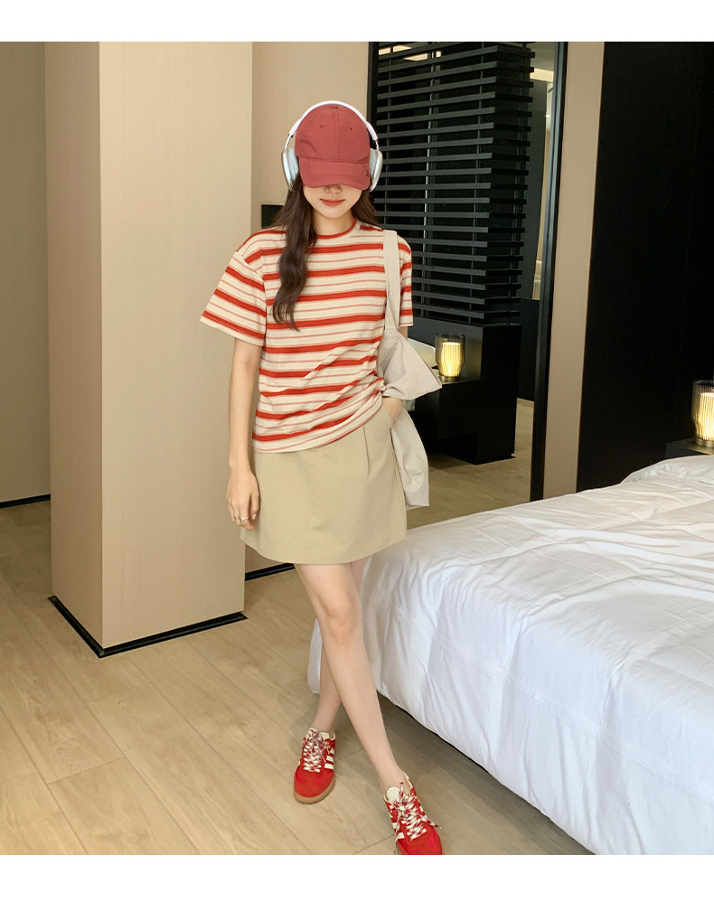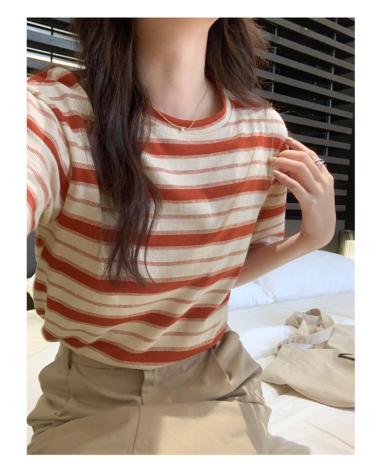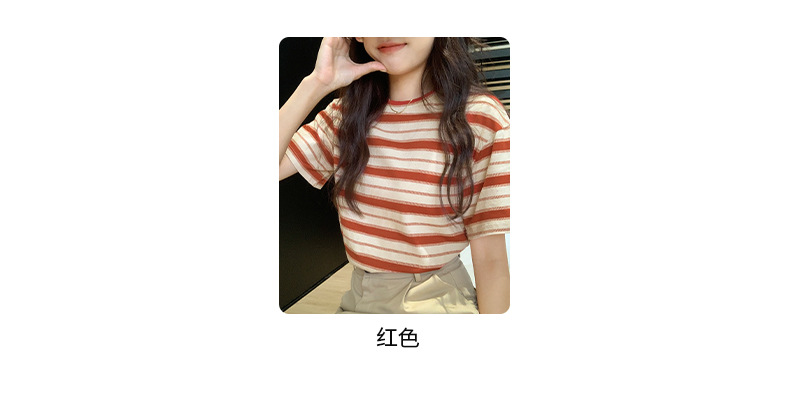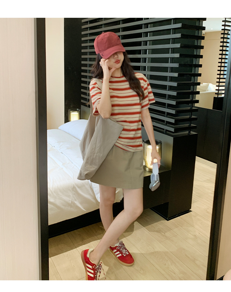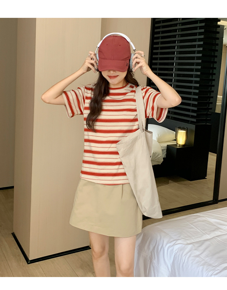 레드 스트라이프 숄더 반팔 티셔츠 여성용 여름 새로운 한국식 슬리밍 대비 컬러 연령 감소 대학식 올매치 탑스토어 가기