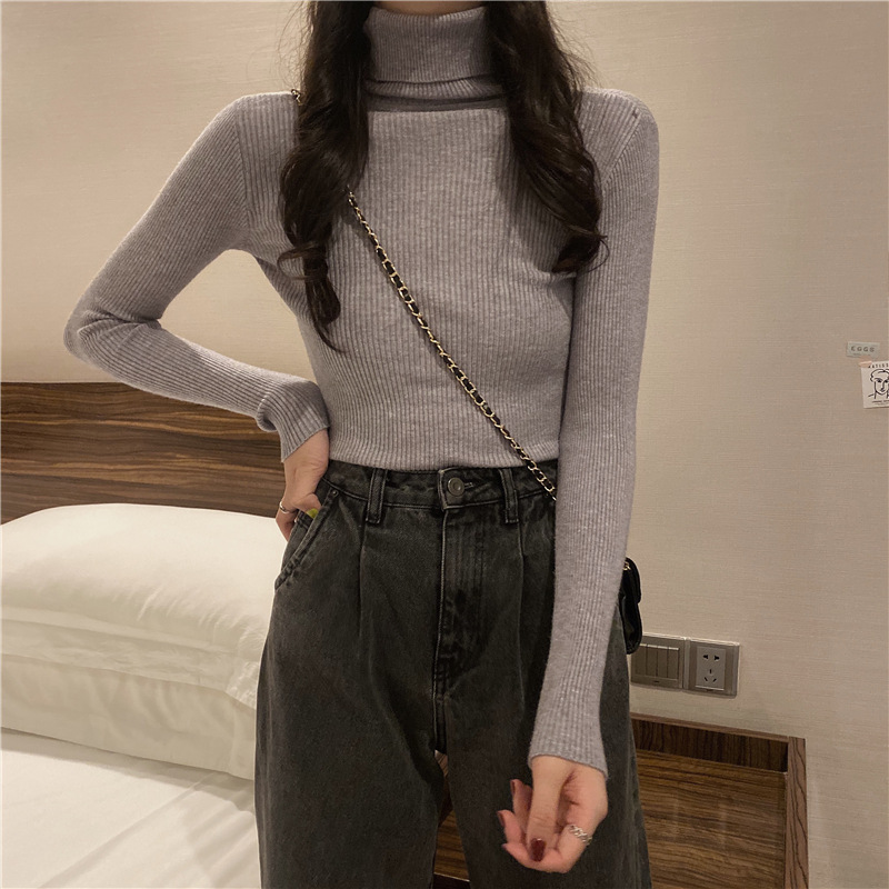 터틀넥 스웨터 여성용 가을 새로운 서양식 슬림핏 타이트 짧은 내부 긴팔 베이스 스웨터 탑 가을과 겨울